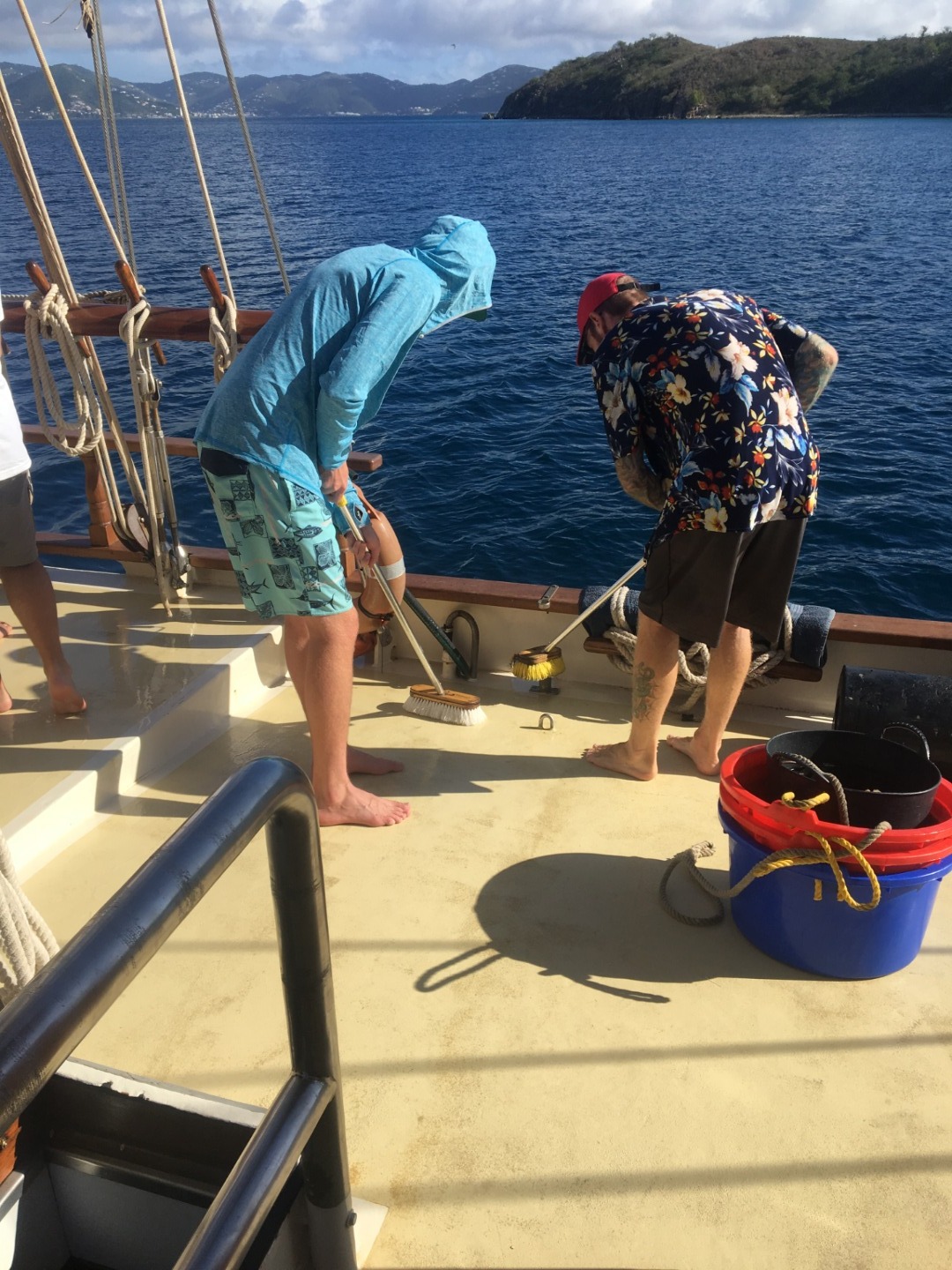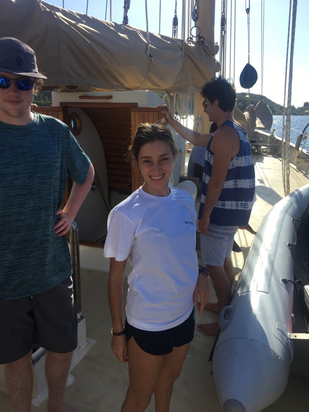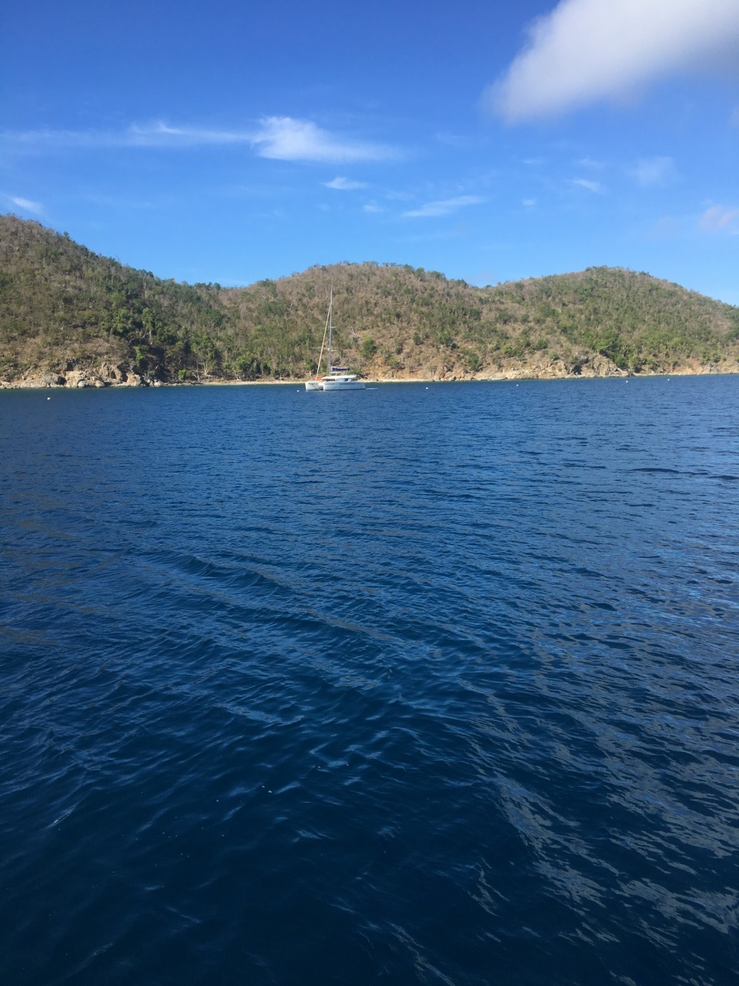 I started today off incredibly early. I was on night watch from 2:00 am-3:00 am. It was everyone’s first-night watch on Ocean Star, and we were all a bit skeptical about how the night was going to play out. Thankfully, we were on a mooring off the coast of Peter Island, and the winds were calm all night, so it was difficult for anything to go wrong. The night watch was a little stressful but feeling completely alone on the boat for the first time ever was so peaceful and calming. I went back to sleep at 3:10 and, as skipper, prepared to wake up the rest of the crew at 7 am. Breakfast was delicious, and as soon as chores were complete, we motored off towards Mountain Point. As soon as we got to Mountain Point, Steve spotted a good place to anchor. Unfortunately, some chartered catamarans had spotted our ideal anchor location as well. As we headed towards it, they increased their speed and cut us off. No one on board was too pleased with their behavior, and so I included some photos of the boats to shame them slightly publicly. After anchoring, it was more PADI videos for the folks getting open water certified and some water tests for the rest of the certified crew. Finally, the open water crew completed our 3rd video chapter, learned about our gear, and we were able to get on some dinghies and head towards a small beach area off Mountain Point. Taking my first breath underwater was the most magical feeling I have ever experienced. Some of the tests were a little scary, and lots of saltwater got into my nose and eyes, but minor inconveniences aside, the experience was incredible. As soon as we started going through the required skills, a huge school of baby bar jack swam up to us and teased us, darting from one diver to the next. The open water crew finished more than was expected for the first time in the water and headed back to the boat, where a heated game of UNO was taking place. More games and intense chess matches ensued. Dinner was veggie curry, and as I write this, the certified divers are taking a night dive right outside the boat.