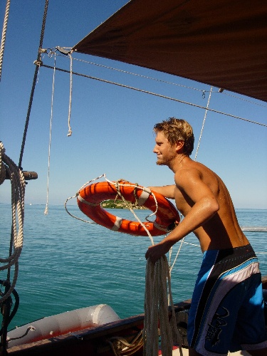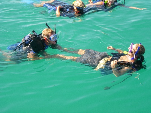 Woke up and had bam bam cereal. Afterward, we rafted up with Ocean Star to make class and buddy work easier. It was the first day of Rescue Diver knowledge review and in-water practice. There was no wind, so windsurfing was not happening. Green Island is a beautiful place; the sunset never upsets us.
