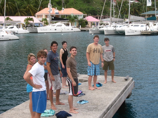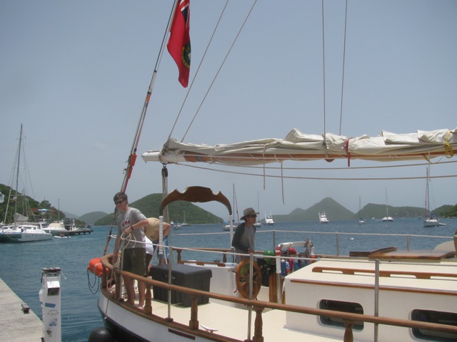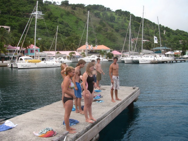 Today has been a long, hot, and sunny day, but it has also been an excellent day. We awoke early this morning for swim tests and pancakes, then stayed in West End until noon to discuss policies and do an introduction to safe line handling onboard. Finally, after a sweaty morning onshore, we were ready to leave, and at 12:15, cast off our dock lines and were underway. On the trip up to Savannah Bay, we practiced setting and striking the sails, and this new group of shipmates, with less than 24 hours under their belts, excelled, getting all the sails up well and safely. We dropped sail as we arrived outside the reef in Savannah Bay and motored in through the narrow entrance into the deep water behind it, and by 4:00, all the shipmates were swimming in the beautiful blue waters of the Caribbean. Our 20-day trip this summer was exceptionally excellent, and from today, I have every reason to believe that this trip is going to be just as good.