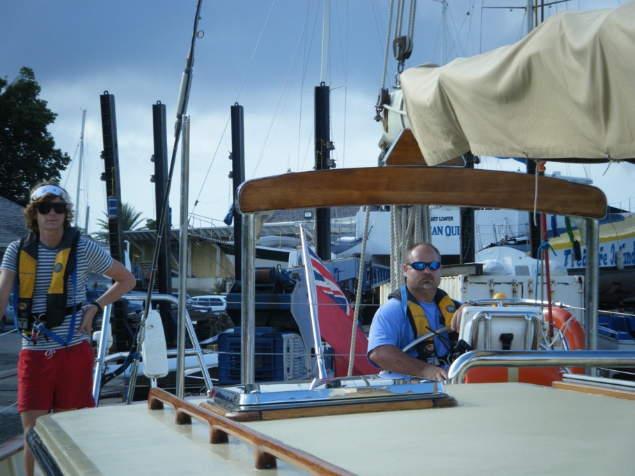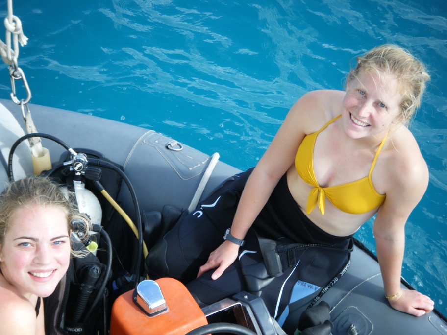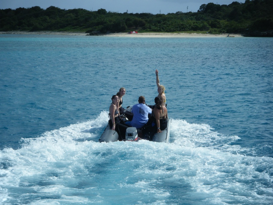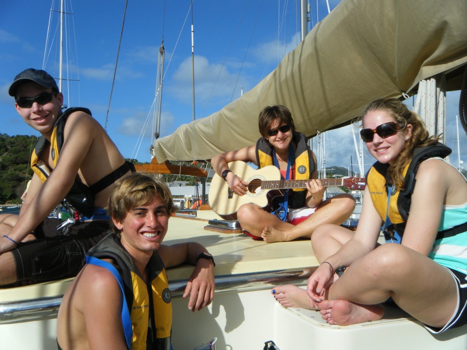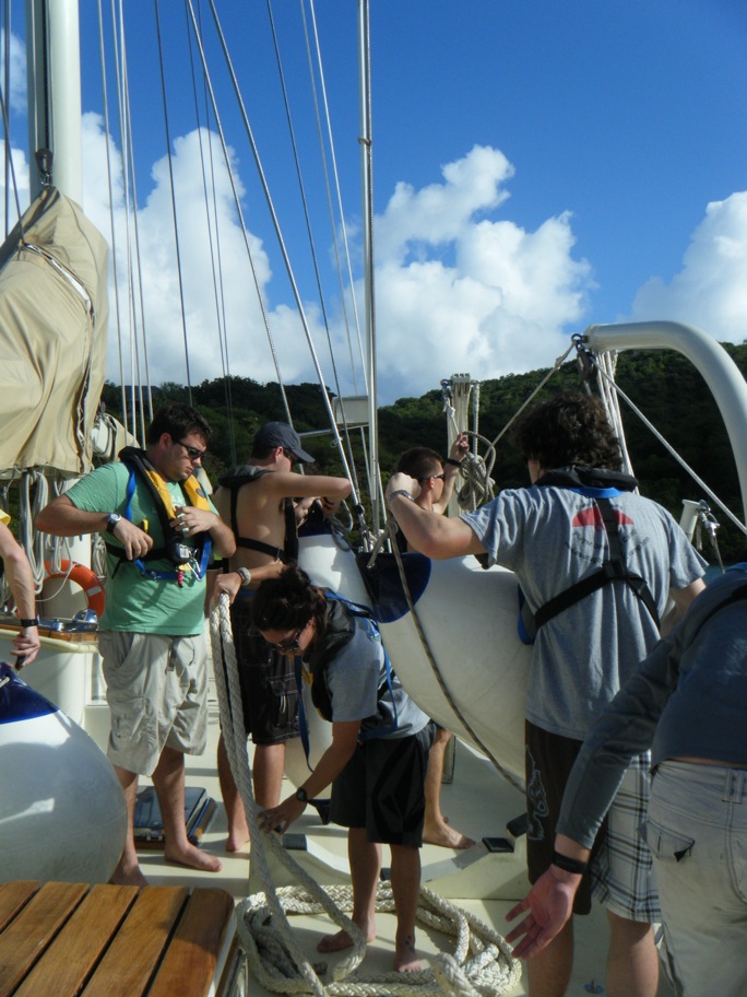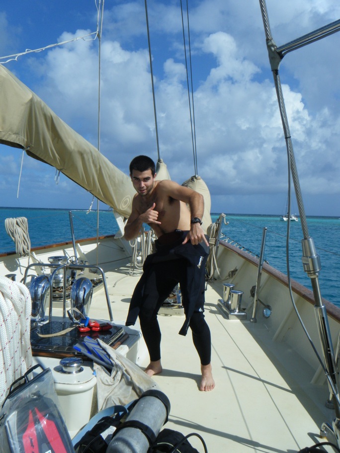 Today, our first day outside the confines of English Harbor, we motored to an anchorage inside the reef of Green Island, which lies just off the coast of Antigua. After Captain Steve navigated out of the narrow entrance of English Harbor, he handed the helm of Argo over to the students, Becca, Mark, and Jack, to steer us on the two-hour passage to Green Island. Almost as soon as we cleared the harbor, we encountered the first of many rain squalls we would encounter during the day, and with the increased winds and waves, there was a noticeable change in the mood of the crew as stomachs began to turn. Despite a few donations of today’s breakfast back to the sea, we made it through the treacherous channel through the reef to Green Islands anchorage. As we began to enter the channel, visibility was reduced by another approaching squall, and Captain Steve decided not to risk the boat and crew by entering under less-than-ideal conditions. After jogging into the wind while the storm passed, we made our way through the winding channel, and Captain Steve’s precautions were proven valid as we passed a smaller sailboat wrecked on the reef. Once anchored, the majority of the students took the dinghy to the beach for diving lessons. After the lessons, we enjoyed another great dinner. After dinner, we had our first class of the trip, which was Oceanography.