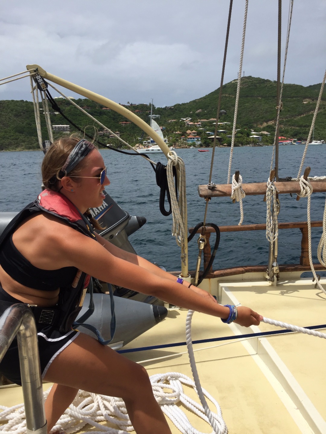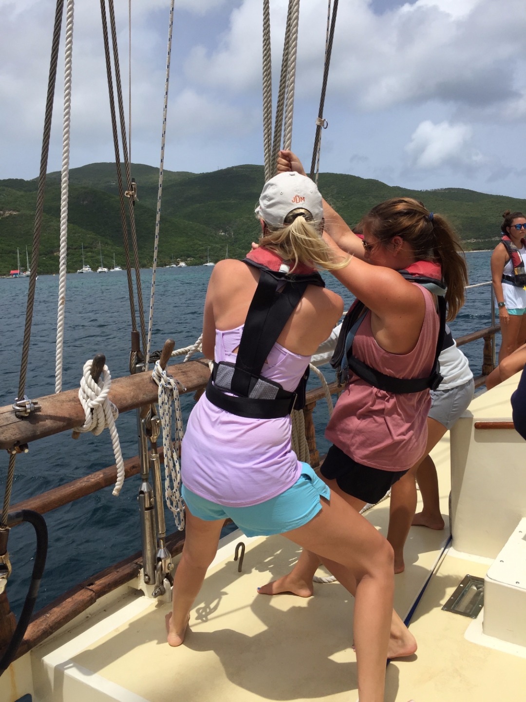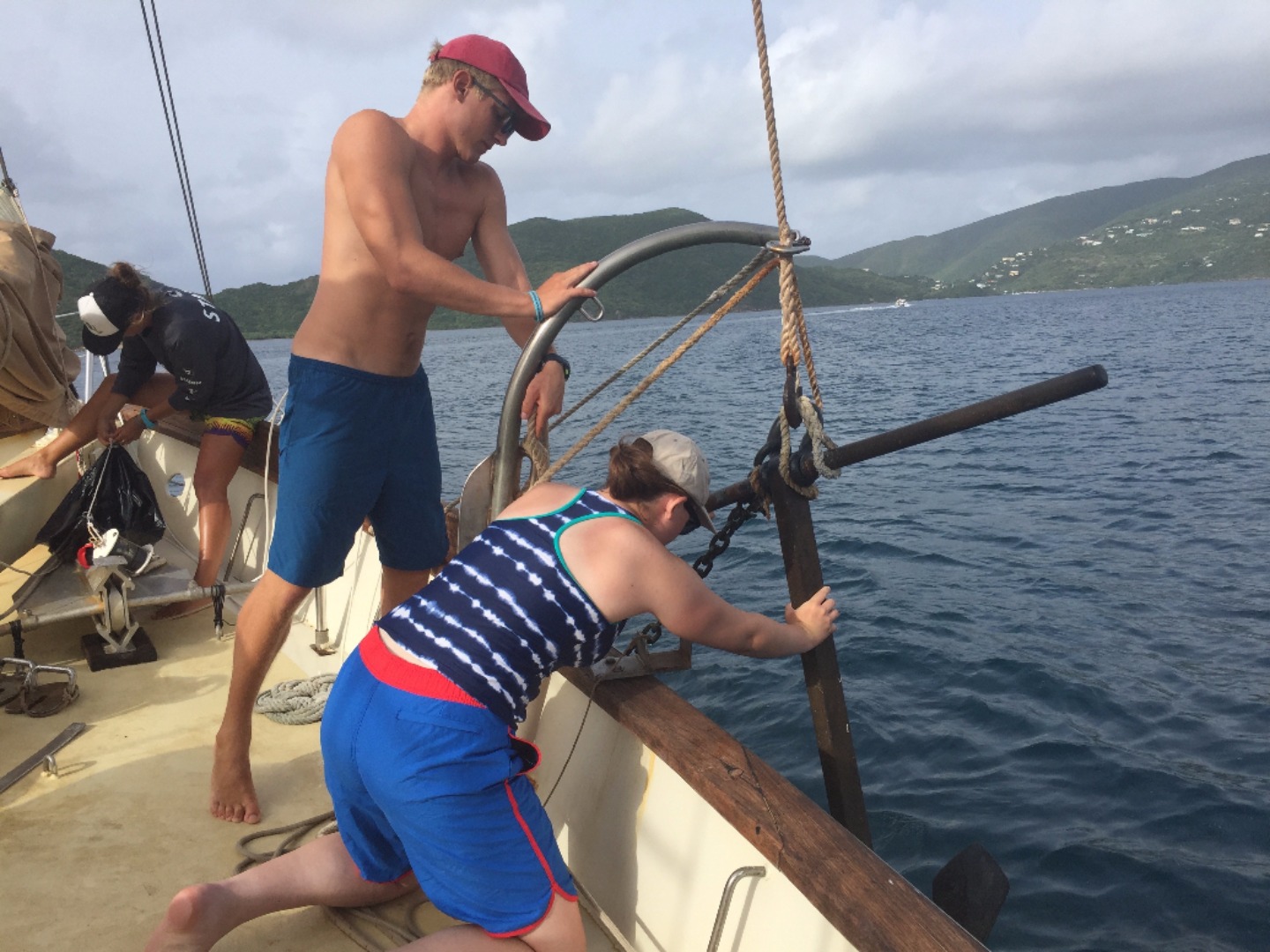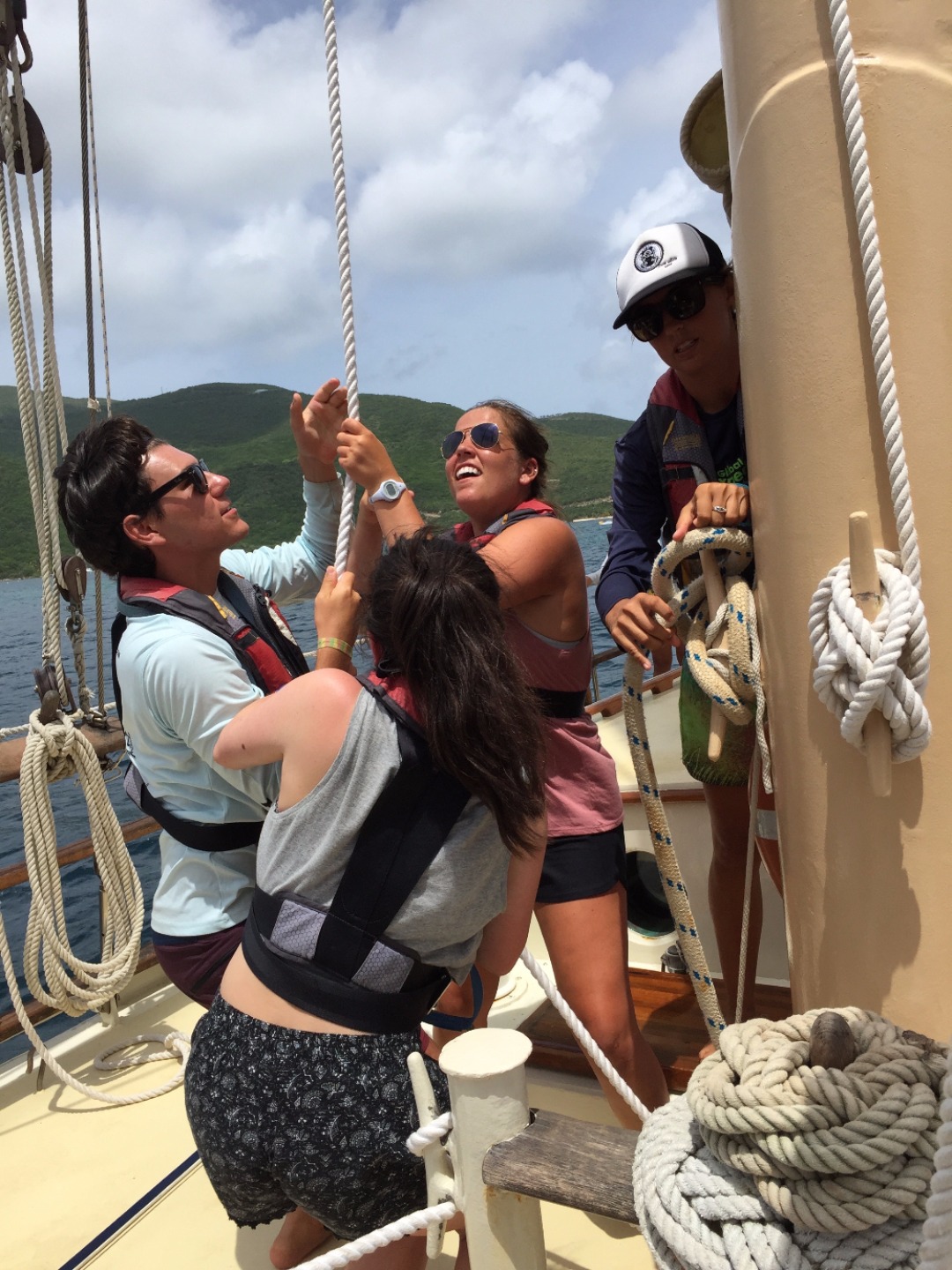 After a quick breakfast and an hour ashore to prepare ourselves, we set off on our first long voyage to Nevis. The sails go up, and we organize into watch teams, the groups responsible for working in shifts to sail the ship for the next 36 hours straight. The hours blend together as the ship overtakes wave after wave after wave. The constant rocking causes a few members of the crew to go green in the face; the others take turns helming the ship, learning to steer all 89 feet of Ocean Star. We struggle to keep our meals from blowing away in the relentless wind, but we still find the time to come together as a crew and enjoy one another’s company.