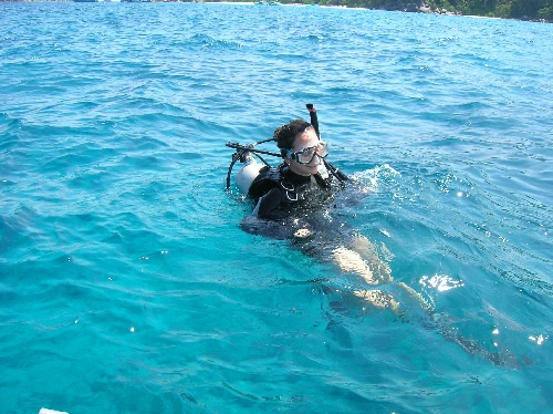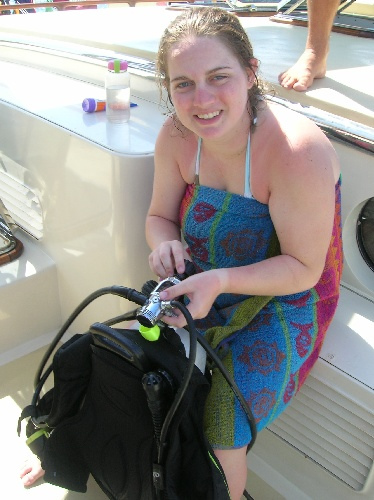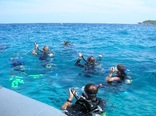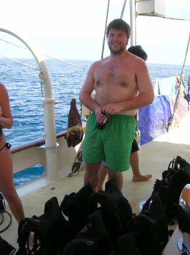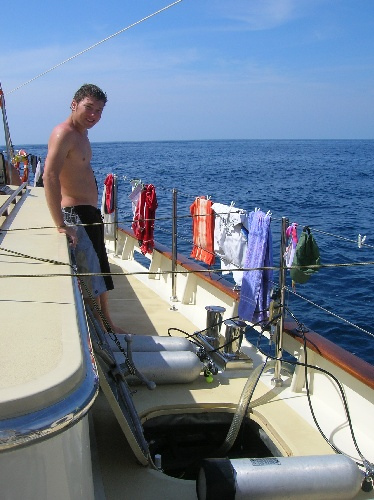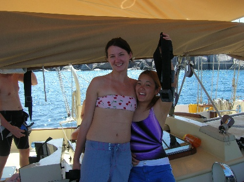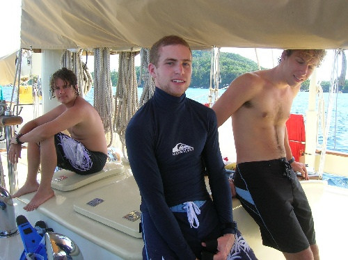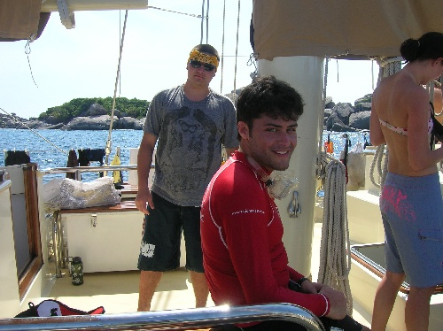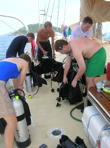 Today a busy and exciting day, was had by all. After breakfast, we did our usual clean-up, and then the non-certified divers set up their gear to take their first breaths underwater. While the group of to-be divers did their preliminary skills, the certified divers did a quick review and then went to the beach. After lunch, the certified divers took their first dive of the trip, and what a dive it was! Surrounded by schools of colorful fish, the divers decided unanimously it was one of the most exciting dives that we’ve seen yet. The engineer of the day, Abbey, was in charge of pumping the scuba tanks so that the to-be certified divers could complete more practice. The cooks returned to the boat to make dinner while others helped to frost a cake for Mike C.’s birthday. The crew enjoyed a dinner of dried pork curry and birthday cake. Currently, the to-be divers are working on their knowledge reviews while the certified divers are preparing a game of charades. A fun day was had by all! Hi Mom and Dad!