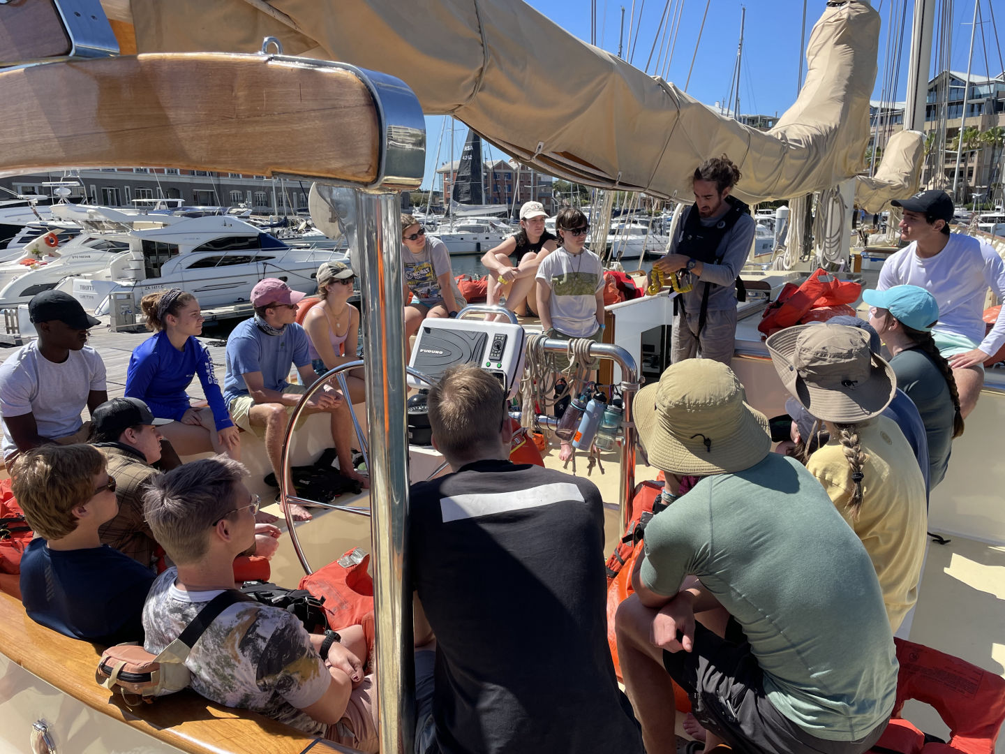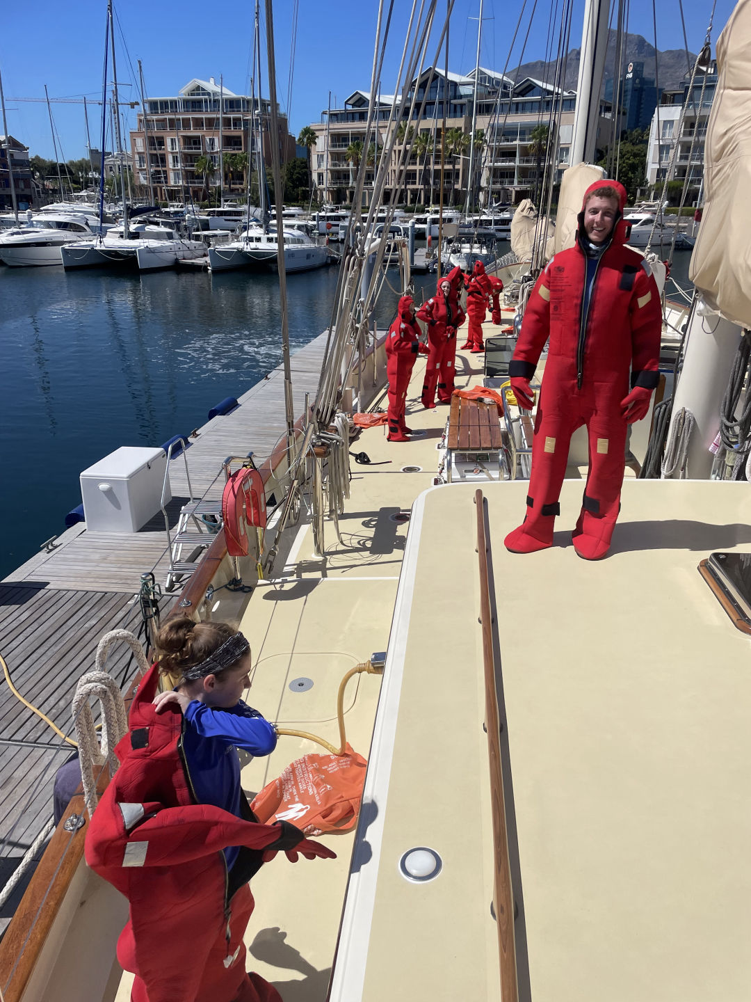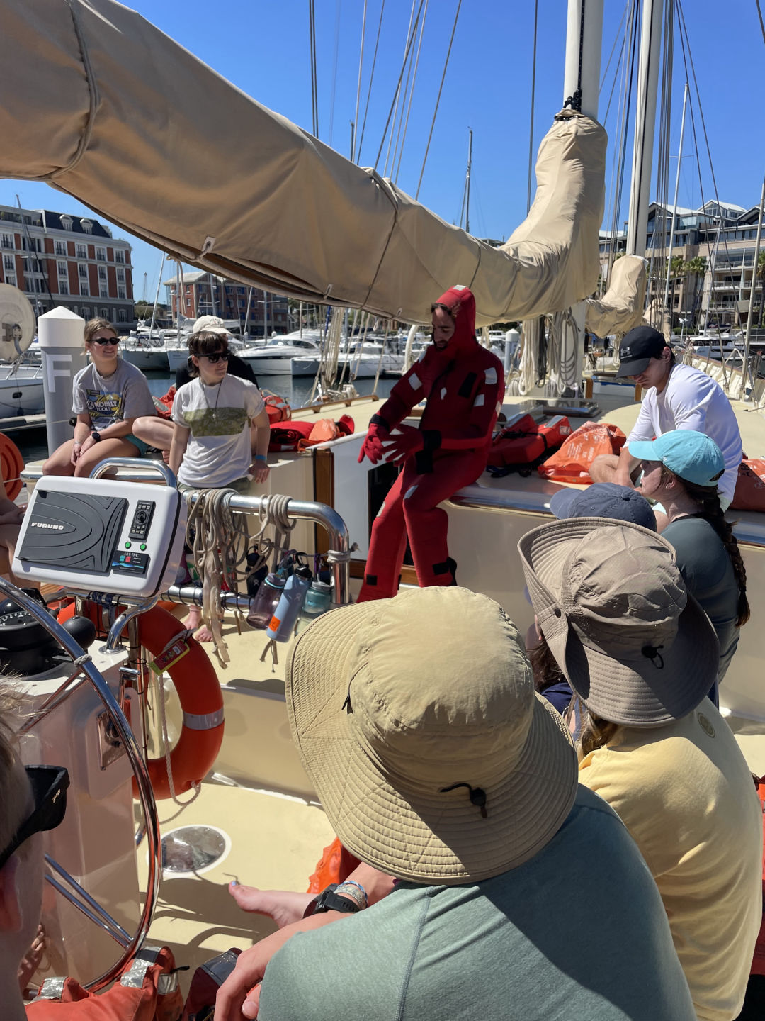 Today is our first full day on Argo, and we have already had a very productive, informative, AND fun day! At 7 am, everyone was so excited to wake up to the sight of table mountain in the backdrop across the marina. Groups of sea lions swam around the boat; some of them poked their head out while the more intrepid ones twirled in the water to show how great of a swimmer they were. Occasionally, we heard some powerful groans from them. After a quick breakfast, we spent time going over the program policy, followed by a detailed walkthrough of the safety procedures. This included going over how to properly fit and wear the life jackets, Personal Flotation Devices (PFD), and gumby suit, which is a waterproof immersion suit used in the unlikely case of abandon ship.