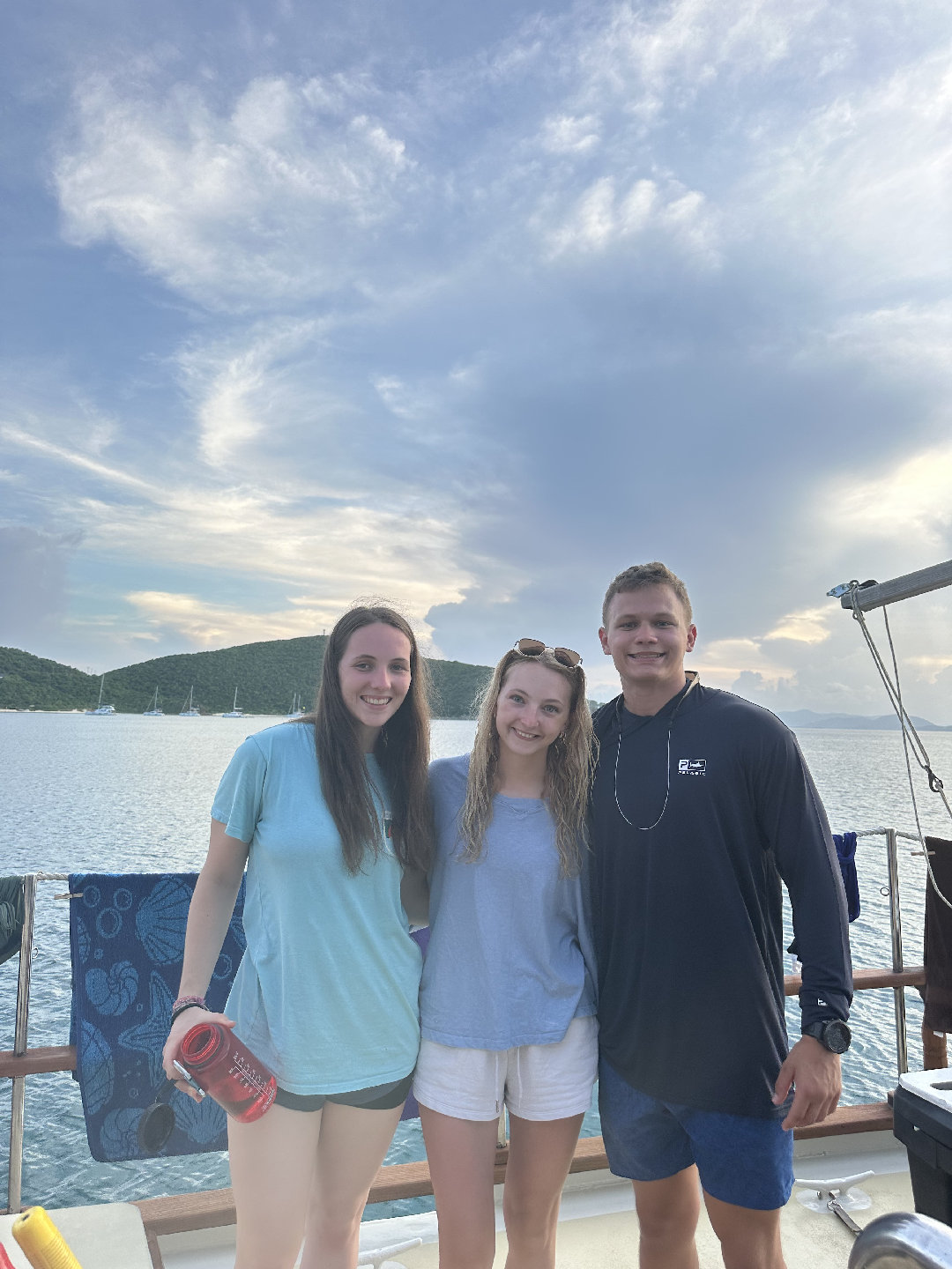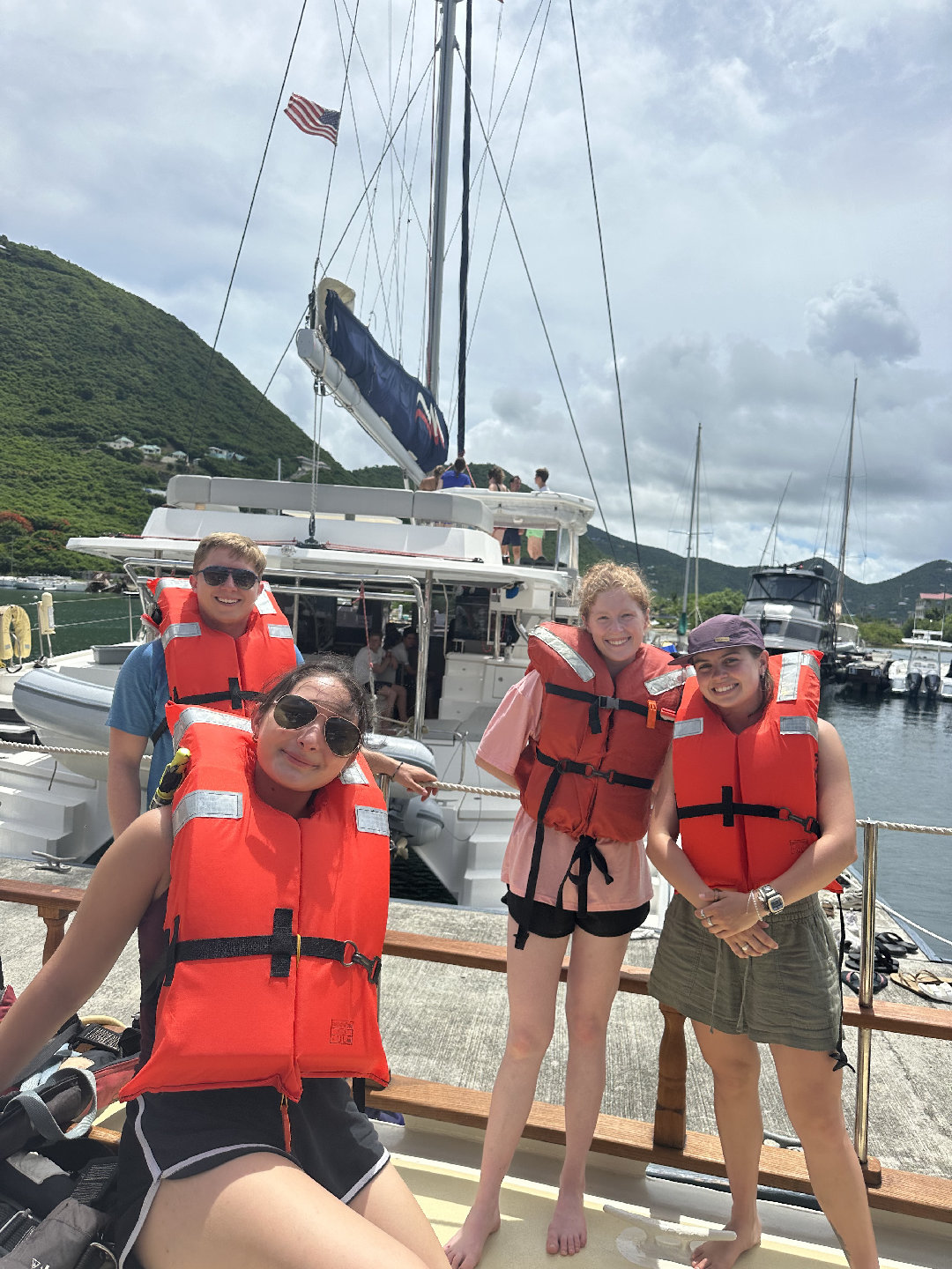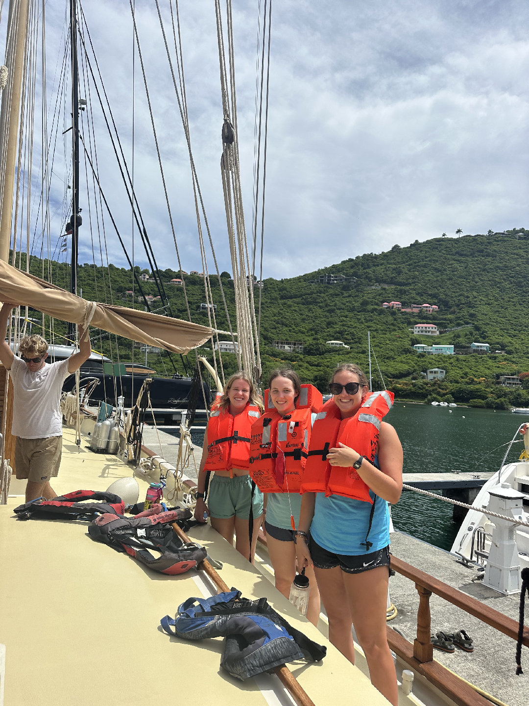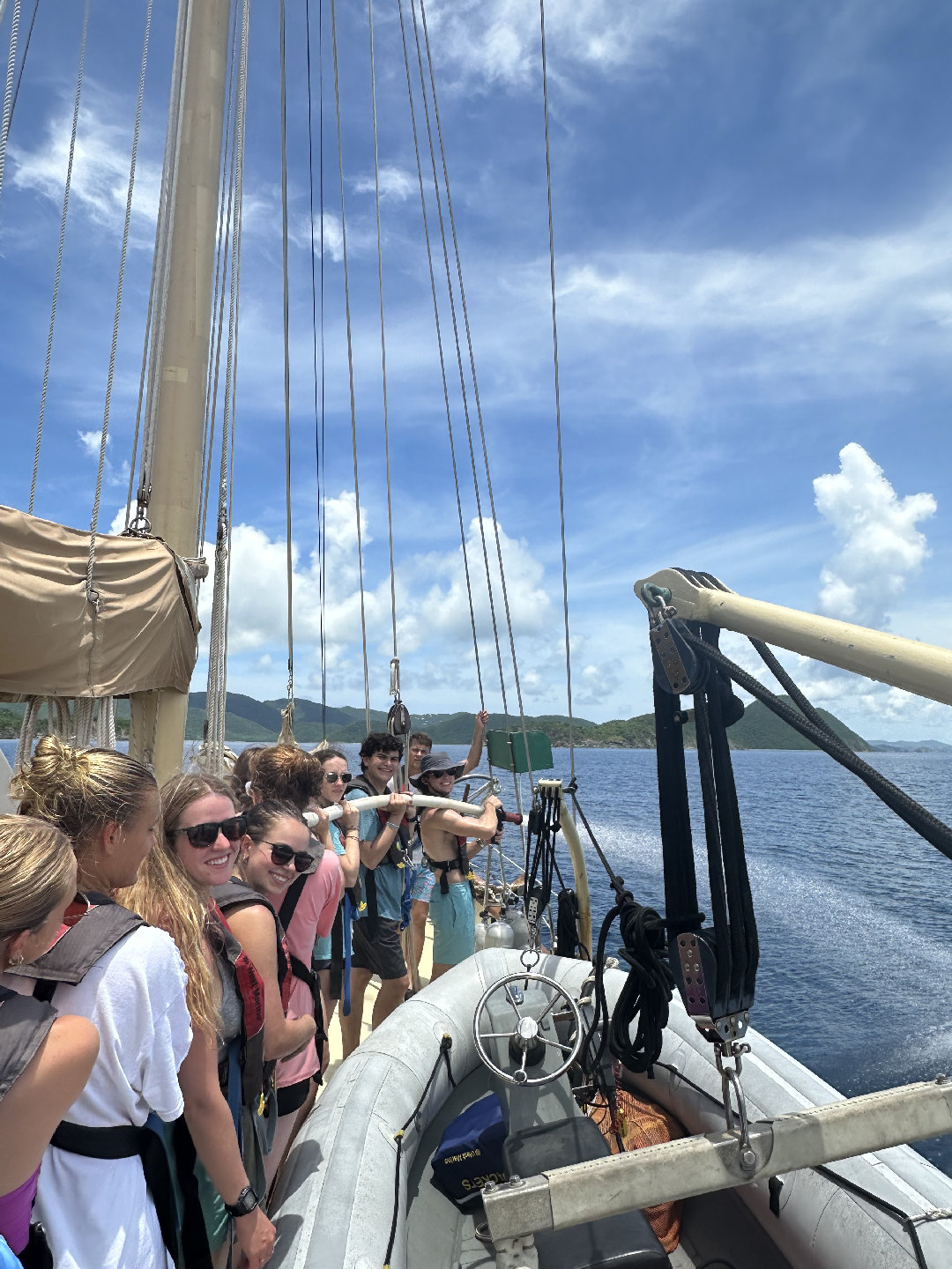7 am came very quick this morning causing many of us to slowly get out of bed. For breakfast, we had a coffee cake with fruit and yogurt. After breakfast, we had a very fast clean up, causing us to beat the cat (the other seamester boat), which we are very proud of. We all went to the cat to run through some Seamester policies and chatted about PFDs. Shortly after, it was time to leave the docks. We all helped take lines off the boat and set sail for Savannah Bay. On our way to Savannah Bay, we had a fire drill; everyone worked to get their PFD type 1 to make it to the cockpit and then got the dings and life rafts ready. Shortly after, we continued our sail to Savannah Bay. Throughout the sail, Madelyn, Lucia, Maya, Emily, Trevon, Eric, and Chloe all completed their first two dive videos. I took the helm and steered the boat while Nick played some tunes on his guitar, which everyone enjoyed. Once we got to Savannah Bay, Suzette, Sky, and Spencer all helped to lower the anchor. We were all dying to get in the water as soon as we arrived, but first, we had to complete a swim test: 4 laps and tread water for 10 min. After the swim test, we all swam around and enjoyed the water. Hana, Weston, and Ethan all got their snorkel mask to check out the cool water. We then all took ocean showers, which is much more fun than an at-home shower but has many of us questioning if we are even clean. For dinner, we have sloppy joes and are wrapping up the day with another dive video for everyone working on their open water certification and chill time.