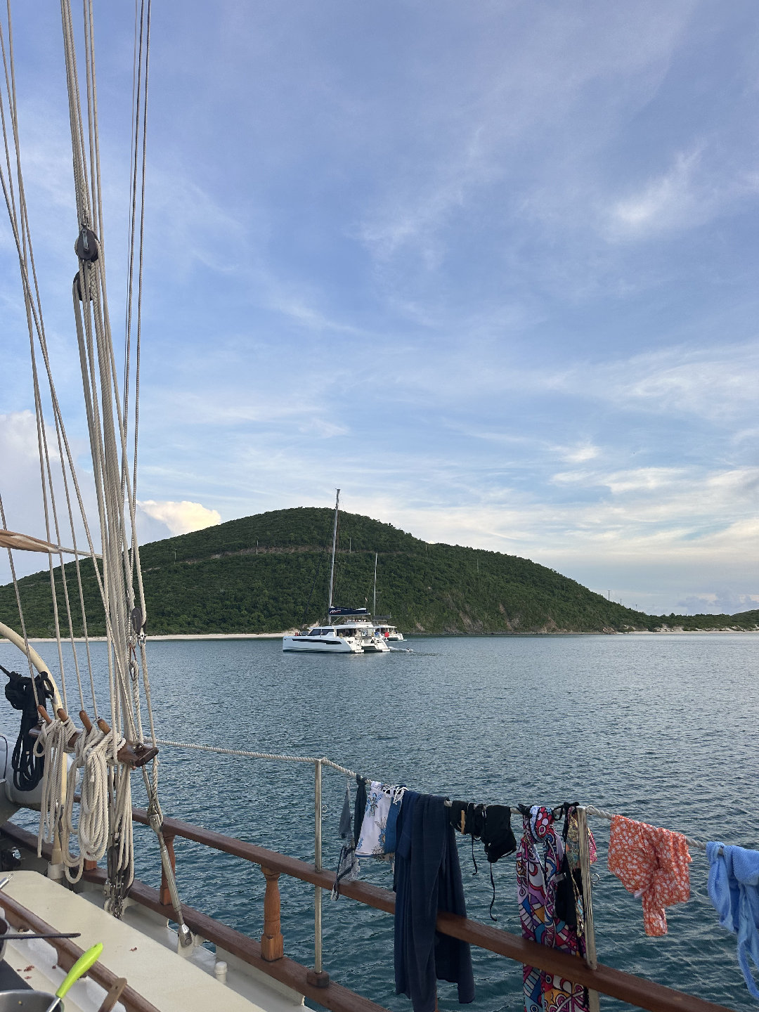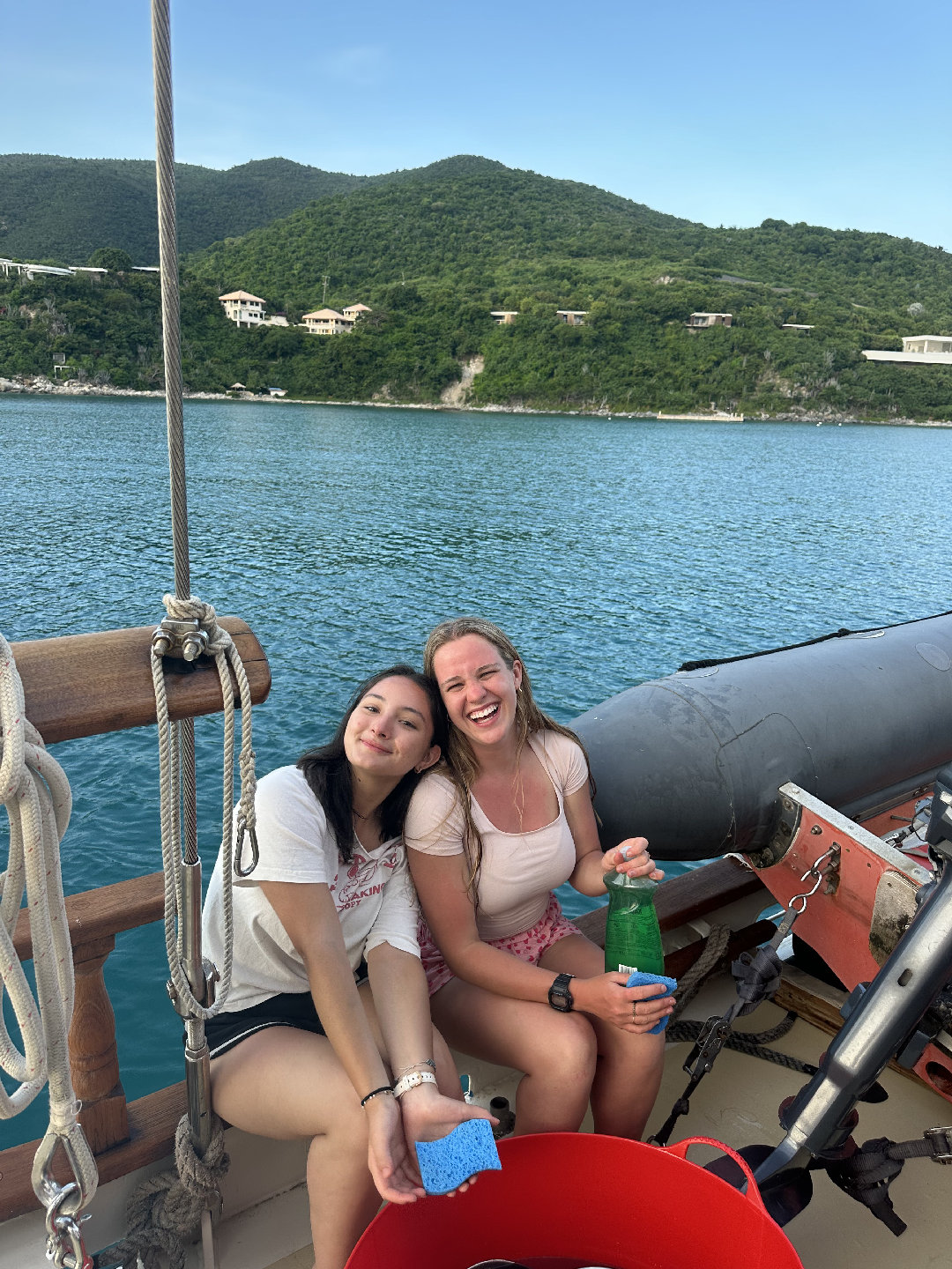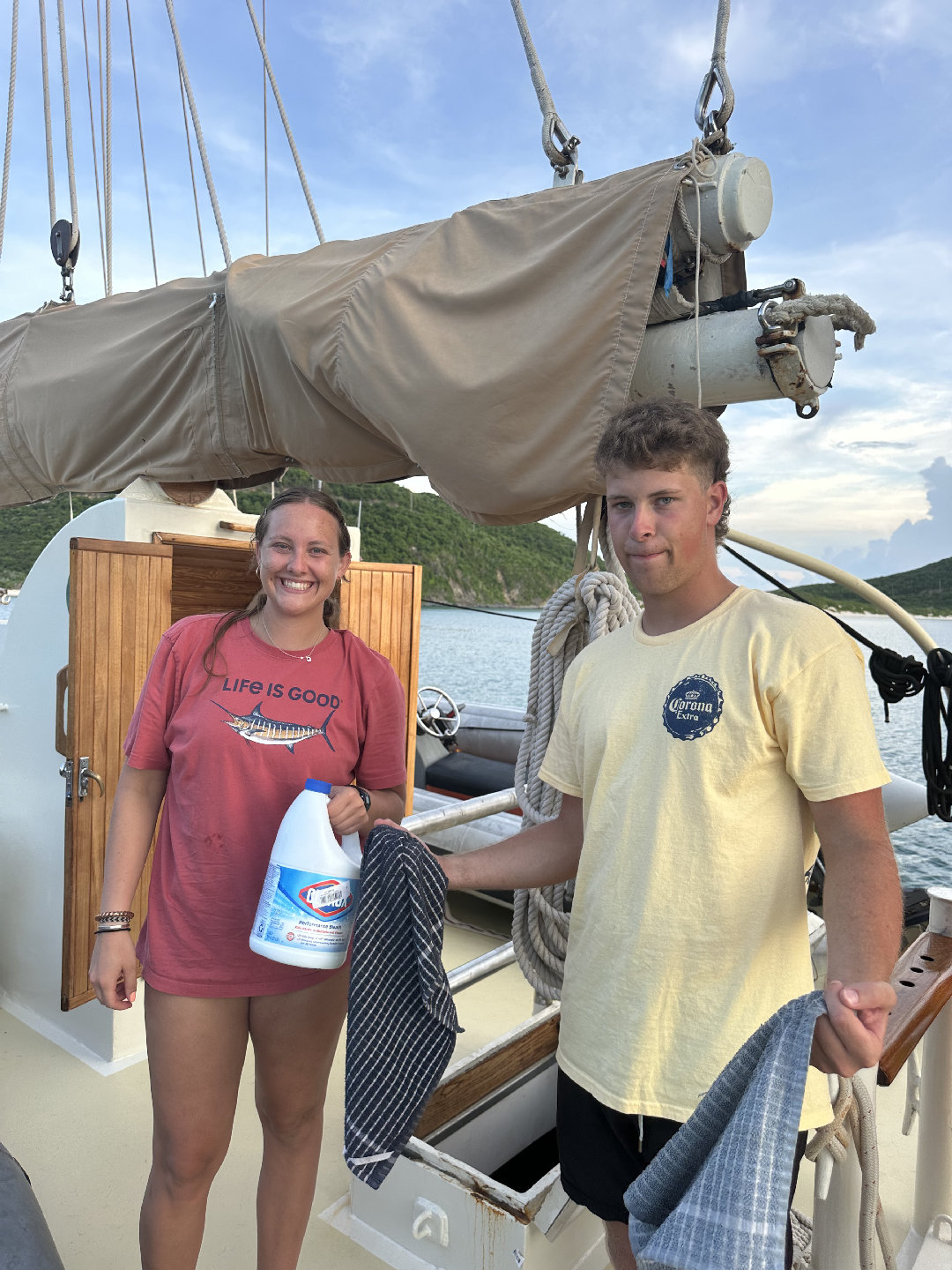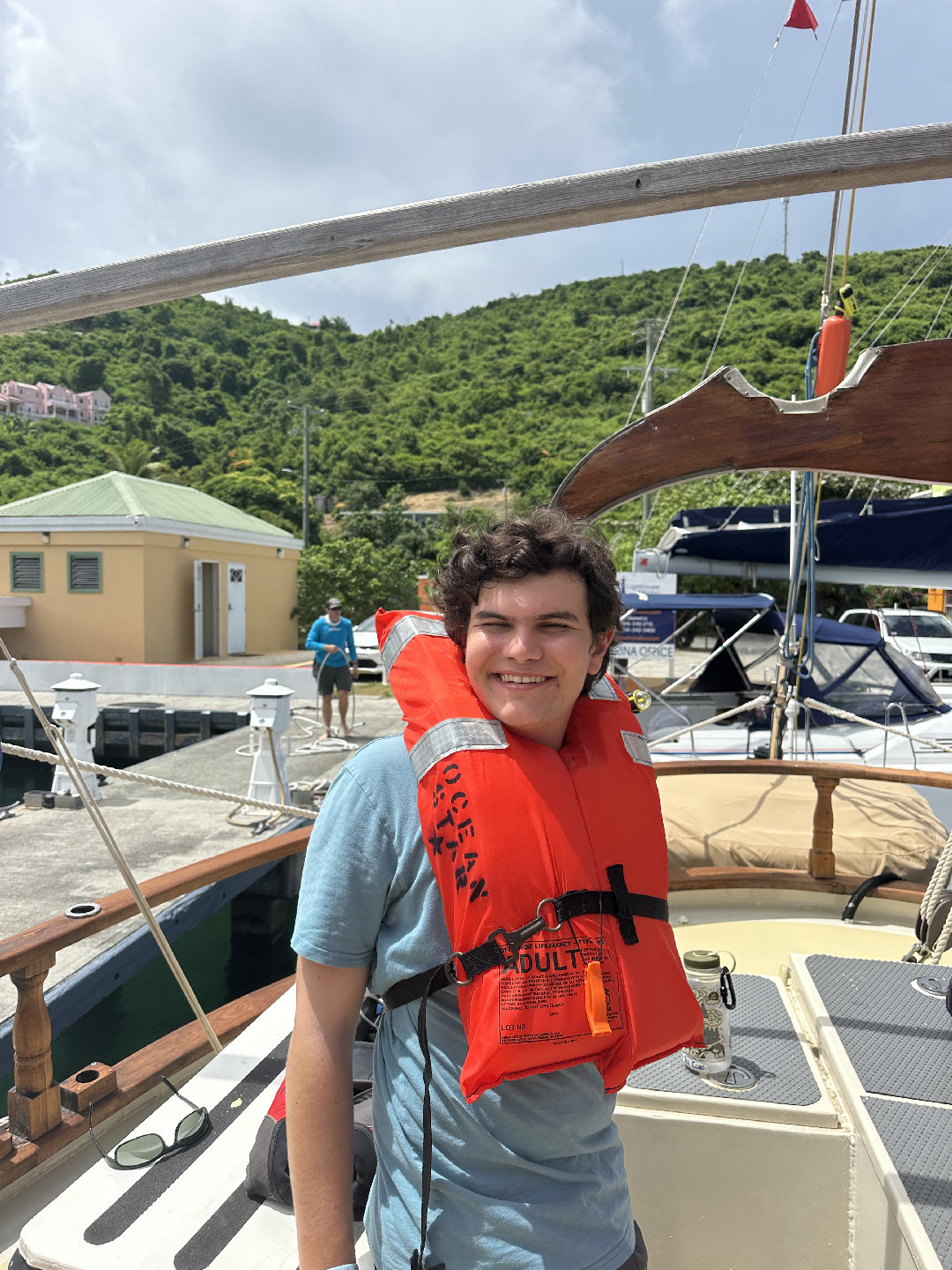 7 am came very quick this morning causing many of us to slowly get out of bed. For breakfast, we had a coffee cake with fruit and yogurt. After breakfast, we had a very fast clean up, causing us to beat the cat (the other seamester boat), which we are very proud of. We all went to the cat to run through some Seamester policies and chatted about PFDs. Shortly after, it was time to leave the docks. We all helped take lines off the boat and set sail for Savannah Bay. On our way to Savannah Bay, we had a fire drill; everyone worked to get their PFD type 1 to make it to the cockpit and then got the dings and life rafts ready. Shortly after, we continued our sail to Savannah Bay. Throughout the sail, Madelyn, Lucia, Maya, Emily, Trevon, Eric, and Chloe all completed their first two dive videos. I took the helm and steered the boat while Nick played some tunes on his guitar, which everyone enjoyed. Once we got to Savannah Bay, Suzette, Sky, and Spencer all helped to lower the anchor. We were all dying to get in the water as soon as we arrived, but first, we had to complete a swim test: 4 laps and tread water for 10 min. After the swim test, we all swam around and enjoyed the water. Hana, Weston, and Ethan all got their snorkel mask to check out the cool water. We then all took ocean showers, which is much more fun than an at-home shower but has many of us questioning if we are even clean. For dinner, we have sloppy joes and are wrapping up the day with another dive video for everyone working on their open water certification and chill time.