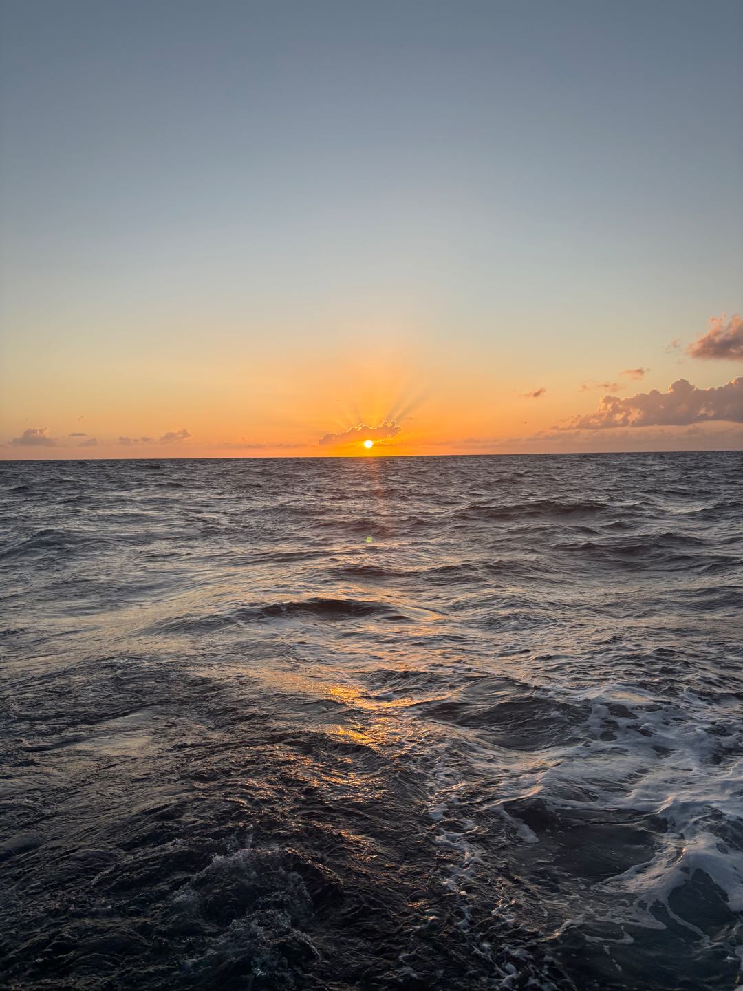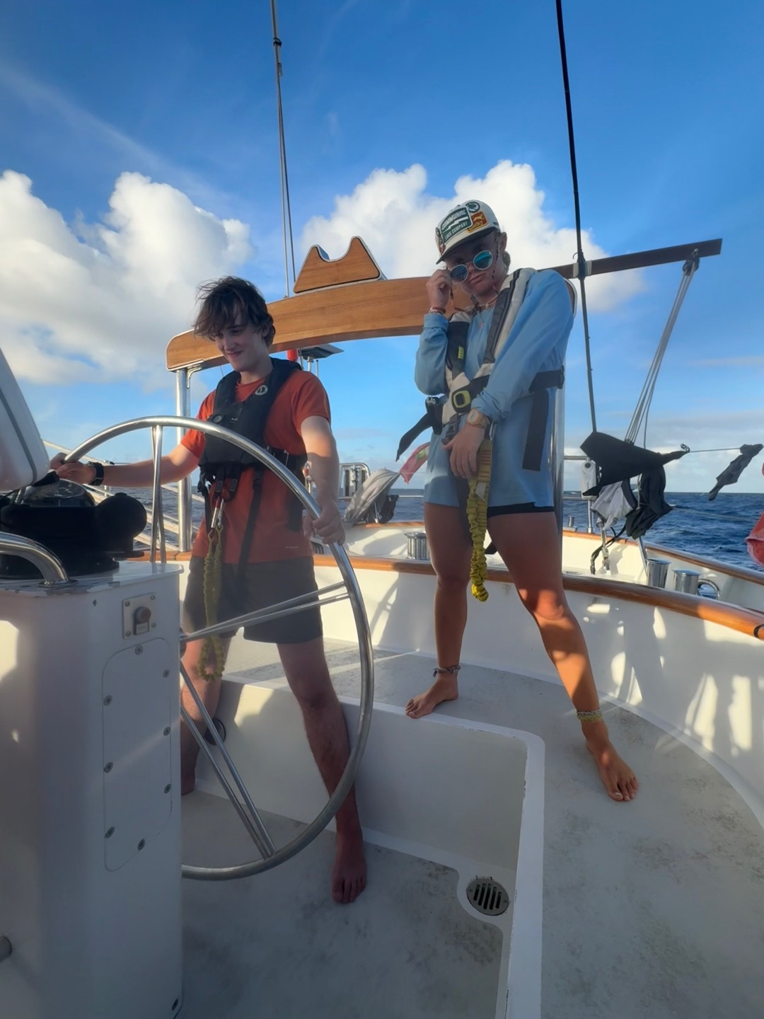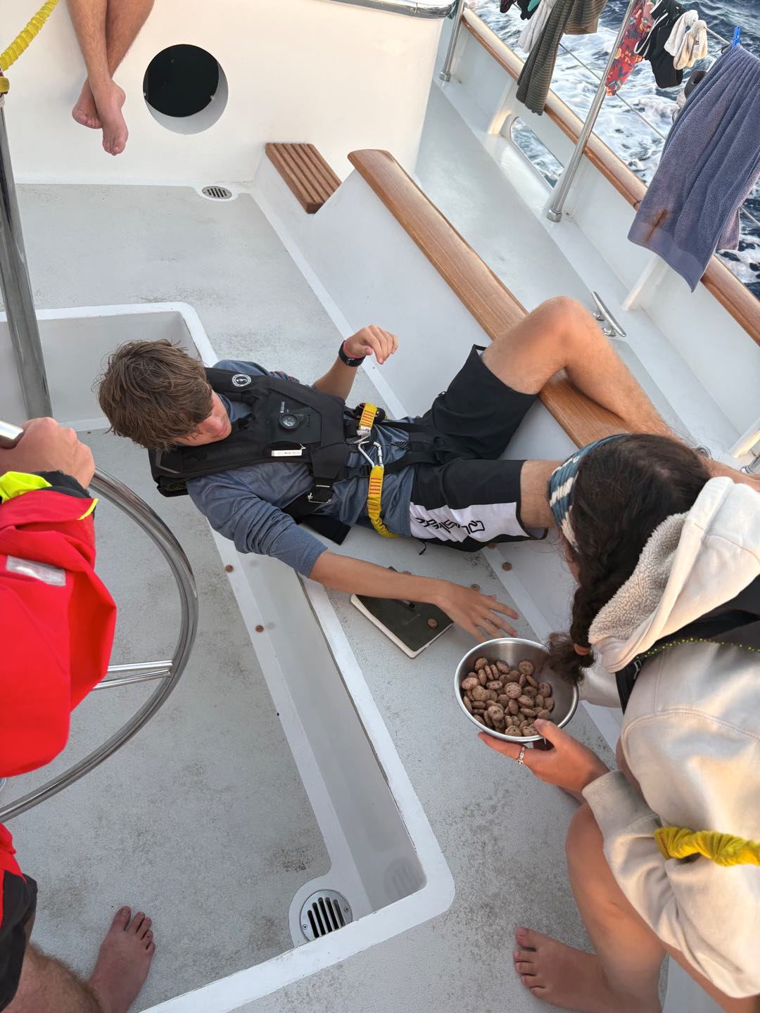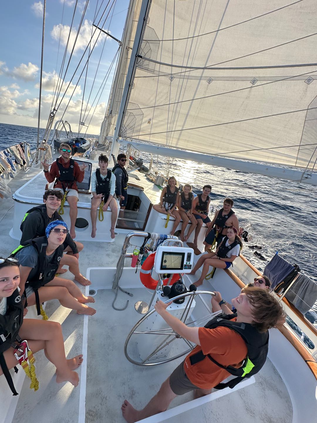 Today is a monumental occasion; its our first full day of passage! The day was relatively quiet and peaceful, although a lot of us arent used to the strange schedule that comes with watch; everyone enjoys doing their own thing. James and Harry saw some dolphins off the martingales while working in the anchor box during their watch, later in the day everyone was woken up for lunch we had some burritos and we then proceeded to leadership and oceanography, after class everyone helped trim some of our sails on our way to Bonaire. We then had some free time before dinner where many of us did some schoolwork, took naps, and hung out. While making dinner the chiefs made a discovery that one of the jars of pickles had exploded under Jakes bunk so that room smells not great, but dinner was served it was chicken/chickpea tikka masala, we then ate together. Morgan G made some of her world-famous naans, and for some reason, some were used as a frisbee. After that, we cleaned up under the setting sun. Some of us went to sleep, and some got ready for watch
