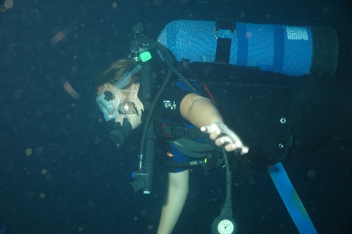 After a couple of classes in the morning, most went to shore for one last time in the Saints to enjoy French baguettes, cheap phone calls, and wonderful ice cream. Everyone was back on board by 2:30 p.m., and we moved the boats to the Pain de Sucre, the site for our night dive. We prepared for the dive, had a good dinner of burgers on the grill, and jumped in the water for our first night dive of the trip. Beaker and Chantale’s groups slowly swam along the reef, looking for cool night critters, while Boomer’s group turned their lights off and tried to swim by undetected. Boomer successfully snuck up on Katie and yanked on her fins in the dark. The bioluminescence and moonlight made the dive especially nice. We finished the evening with late-night showers and a rave with the glow sticks from the dive.