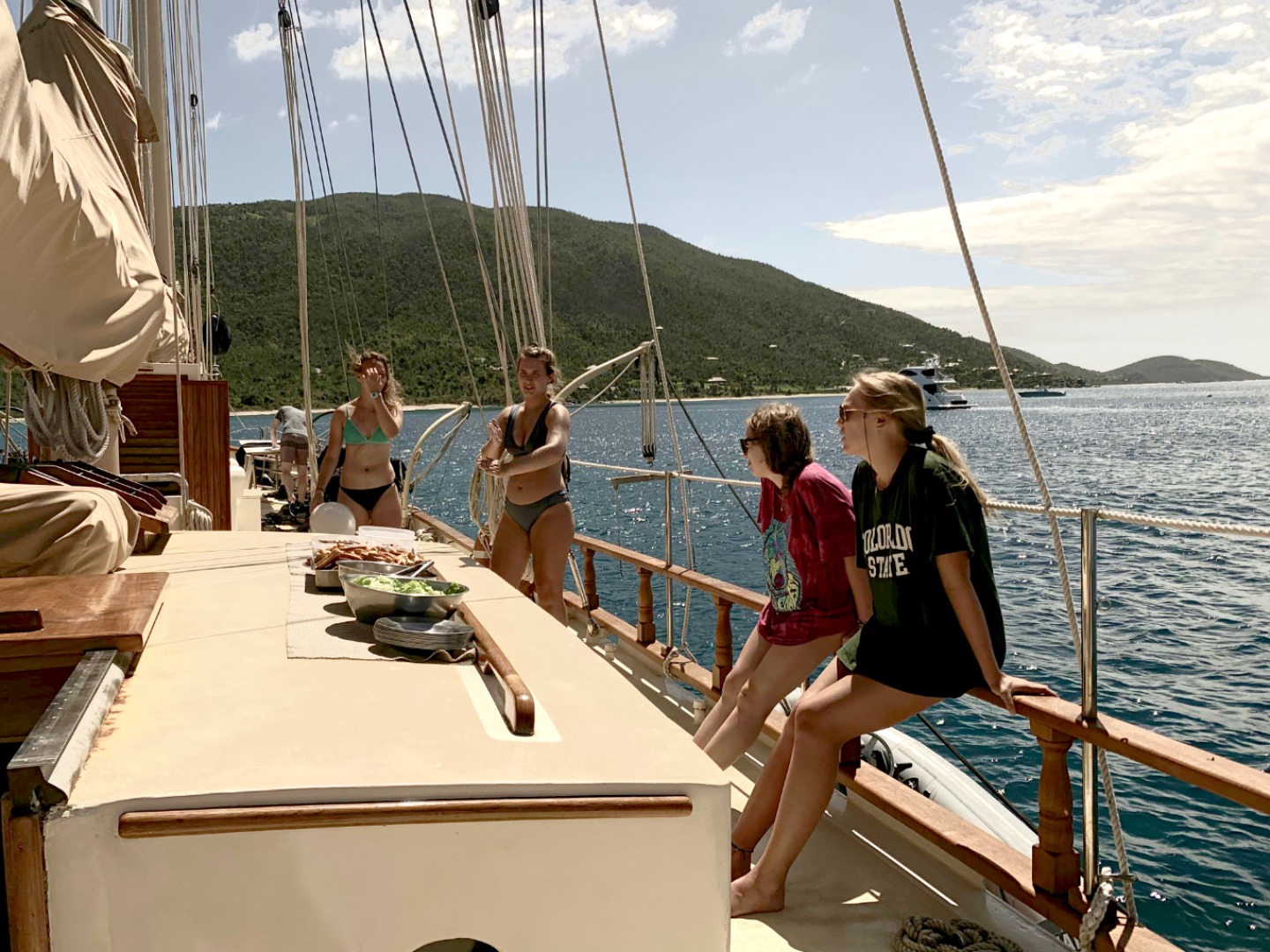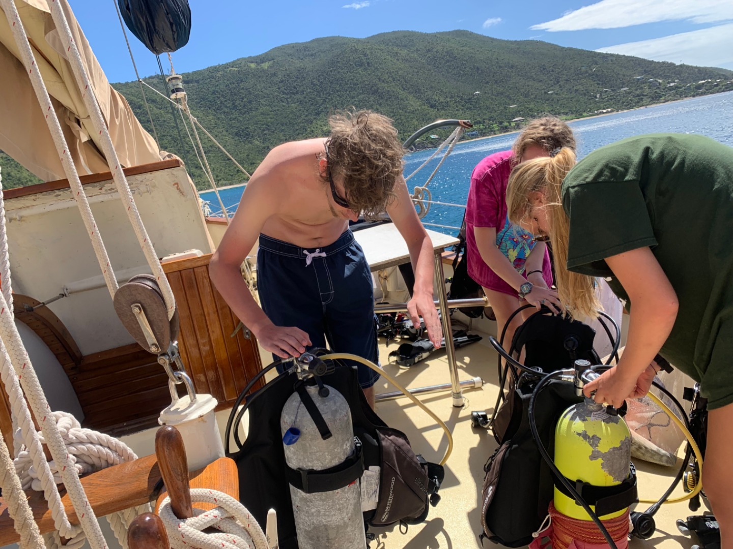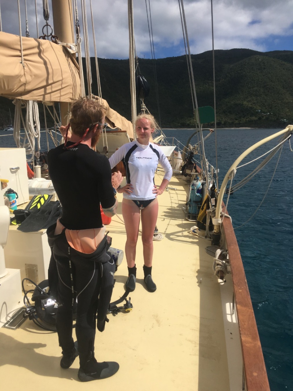 two real dives. While most of us just sawfish and corals, Tina’s group was extremely lucky to be approached by a hawksbill turtle on the first dive of the day! For lunch, Dan and Miranda made quite possibly the best-grilled cheese sandwiches in the entire world. They were the perfect balance between crispy and cheesy. After the second dive, we all realized how fun showers could be when you’re jumping in the ocean with friends. When we all dried off, we took a nice long break from all of the fun and excitement to study, nap, and journal. Many of us ended up sleeping on deck after finishing drafts of our leadership autobiographies. We are all very much looking forward to our first oceanography lesson tonight with Alex and our sail in the morning to Peter Island.