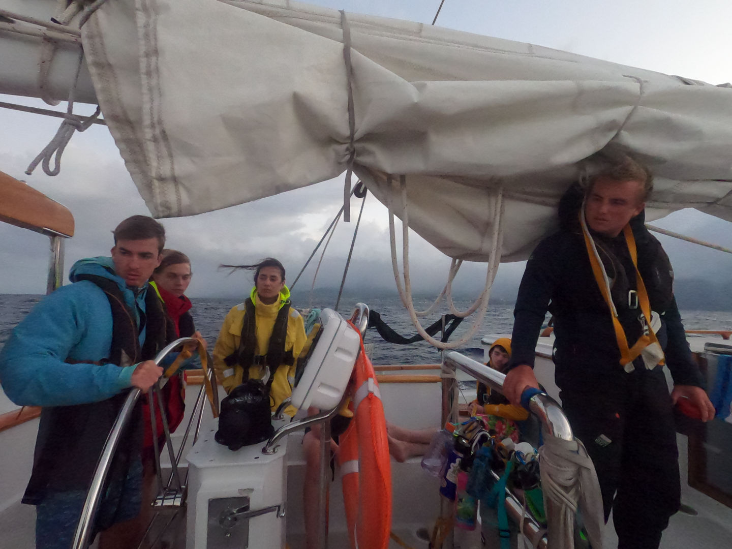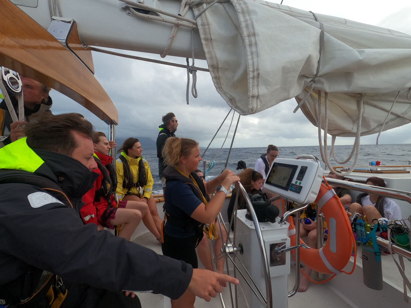 Last night after dinner, we started our first overnight passage from Antigua to Le Saintes, which everybody was really excited about, as it was our first duty on our Watch Teams. After we raised all the sails, Watch Team 1 with Smash and Dylan took over from 8 PM to 12 PM. Everybody else was trying to get some rest before their watch, but as the waves were so high (4ft), multiple people got seasick, and nearly nobody was able to sleep. Doors, people, PFDs, and foul weather gear were flying around in the salon and cabins all night long. (EDITORS NOTE: this was the student’s first attempt at sleeping underway, they will eventually not be able to tell when the boat is moving vs. not and will laugh at this slightly rolly night) After Watch Team 2 was up on deck from 12 PM to 4 AM, I was woken up to start my watch with Watch Team 3 from 4 AM to 8 AM. The first few hours were pretty calm, and we took down one sail, but around 7 AM, the waves and the wind suddenly increased, and it started to rain, which nobody was really excited about. After my watch was over, I was able to take a nap before waking everybody up at 9 AM for breakfast, which we had after anchoring in Les Saintes. After breakfast and cleanup, the uncertified OWD groups of Matt and Steph got ready to go on their first “real” dive after the bad luck we had in Antigua. Smash’s group, as well as the certified divers, stayed on Vela and either worked on their Species IDs for Marine Biology or took a desperately needed, long nap after last night’s passage. After Matt’s and Steph’s group came back from their dive, we had lunch, and then Smash”s group got ready to go diving, and the “qualified people” (Carla, Ted, Miles, Ben, Charlie, Lake, and me), as Ted likes to call us went snorkeling at the shore and saw some great fish and corals. Carla even claims she saw an octopus, which nobody else did, but I guess we believe her… After we returned to the boat, which was around 5 PM, everybody took an Ocean Shower up on deck and did some jumps from the boat. After that, we had dinner of stir fry and chicken satay and did the daily “Squeeze,” which is always followed by clean up. Tonight, everybody is really looking forward to hopping into their bunk, and we are all hoping for a better goodnight sleep in a less rocky Vela.