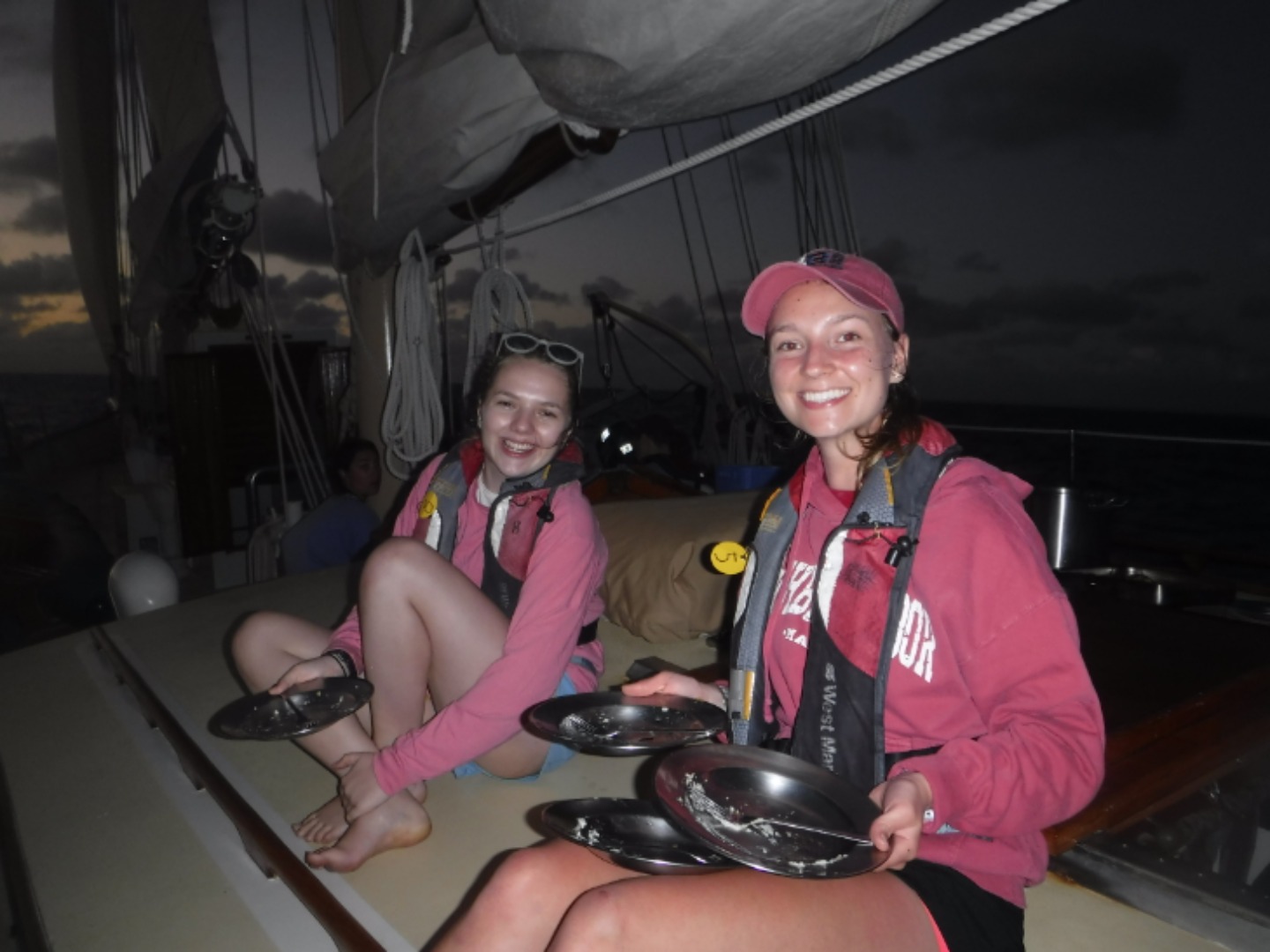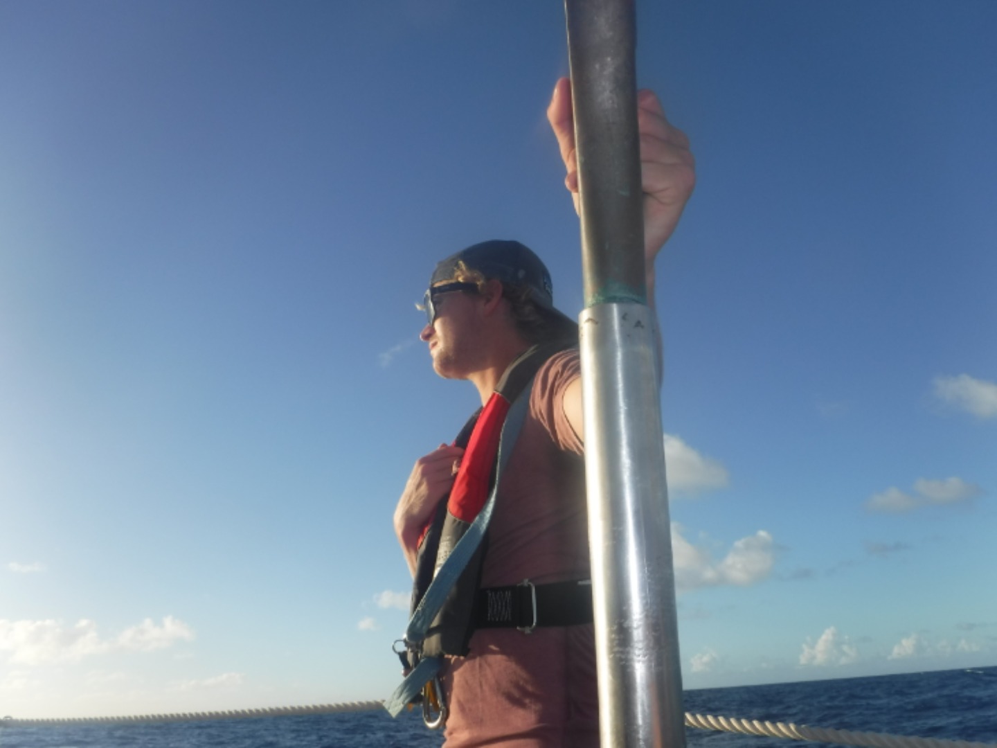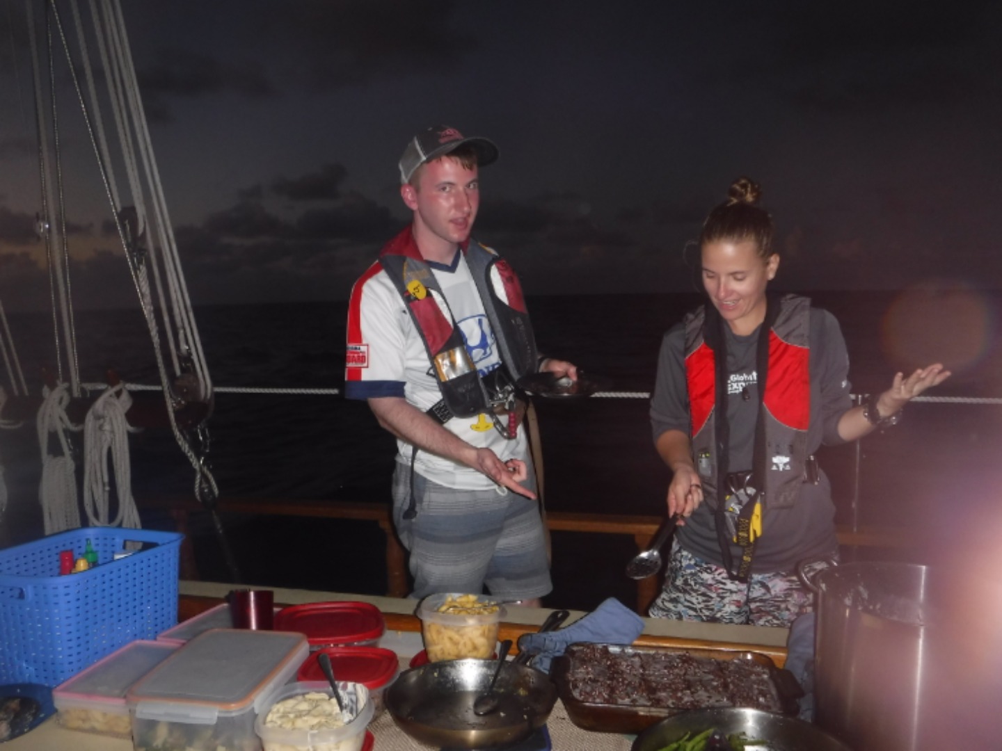After a night spent four hours on and four hours off of watching the boat and doing hourly boat checks, the whole team was excited to see the sun come up and get some grub. Although these new hours have been hard to get used to, everyone has been helping each other out in getting accustomed to this new way of life. We were all very excited to get out on the water, but what was even more exciting was when we turned the engine off and were sailing using only the power of the wind around us. It’s amazing to look out and see the ocean and sun for miles; this beautiful day helped give us the extra energy we needed to get through. Not only that, but we got to see a majestic breaching humpback whale swimming beside us, which only fits with the dolphins that swam alongside us only the day before. We also had a major jam session while watching the sun slowly creep down the horizon, followed by the tastiest chicken I think we’ve ever had.