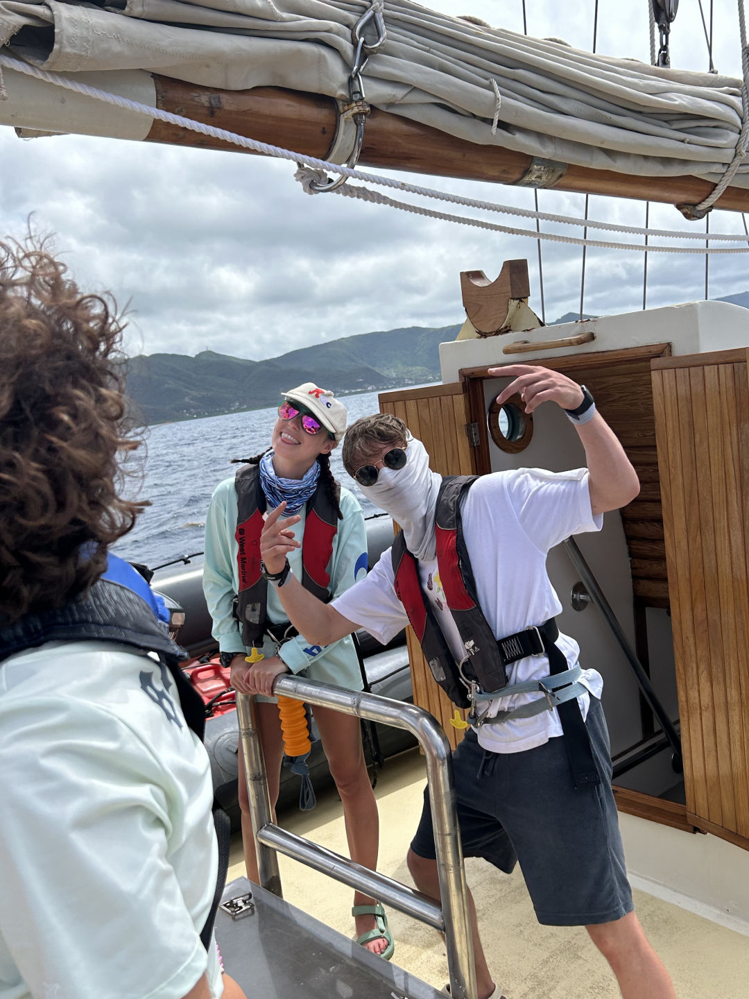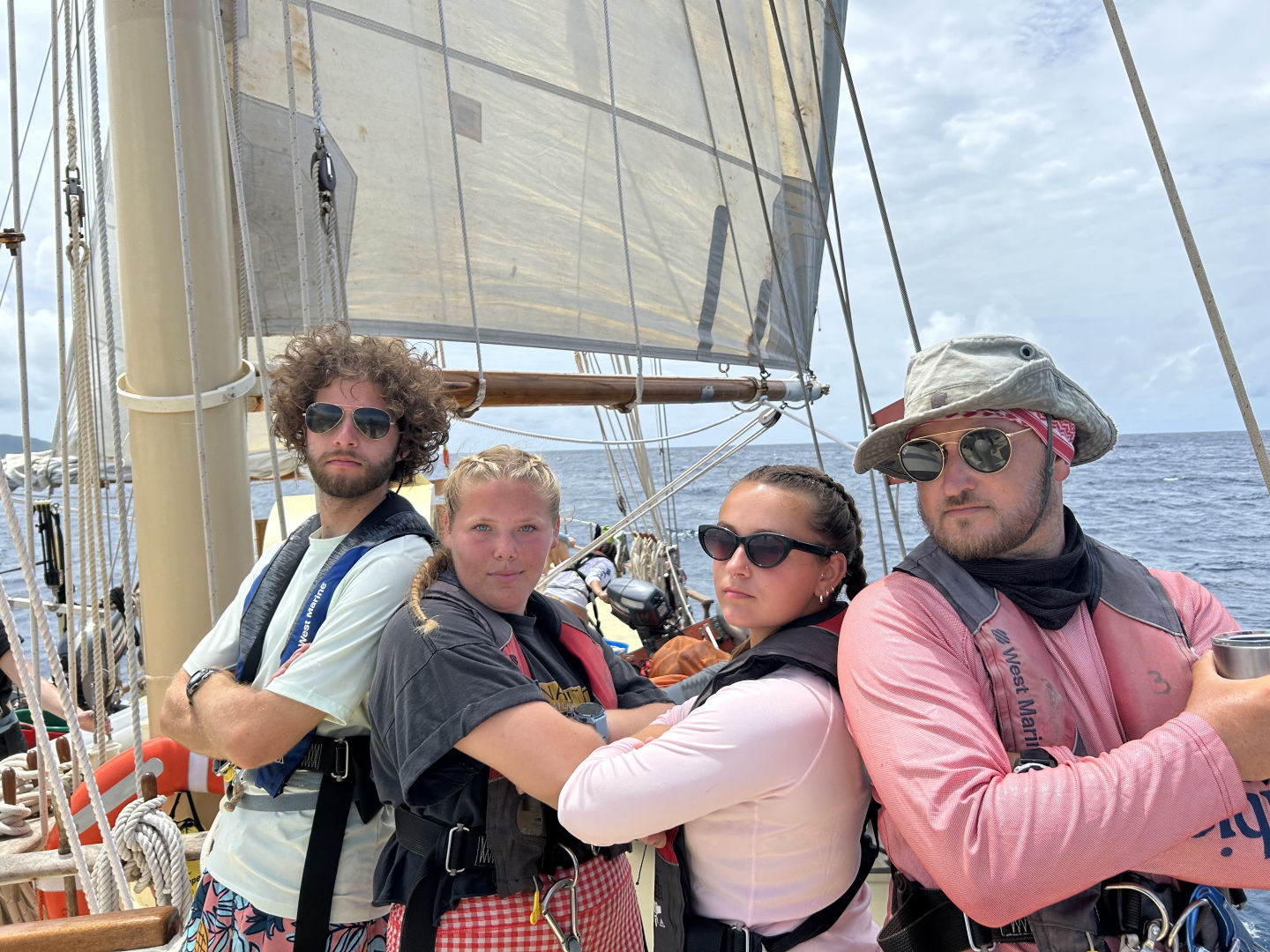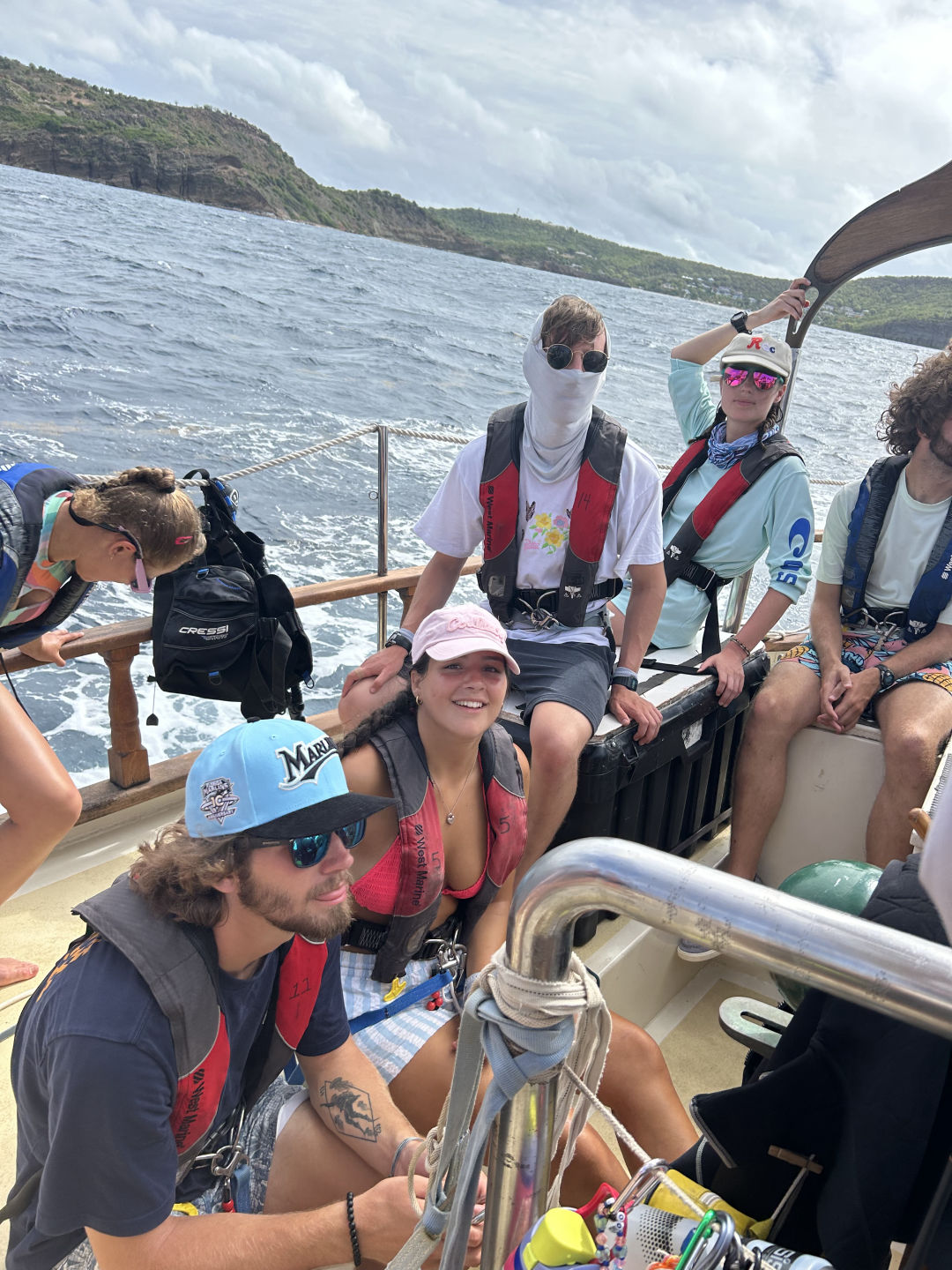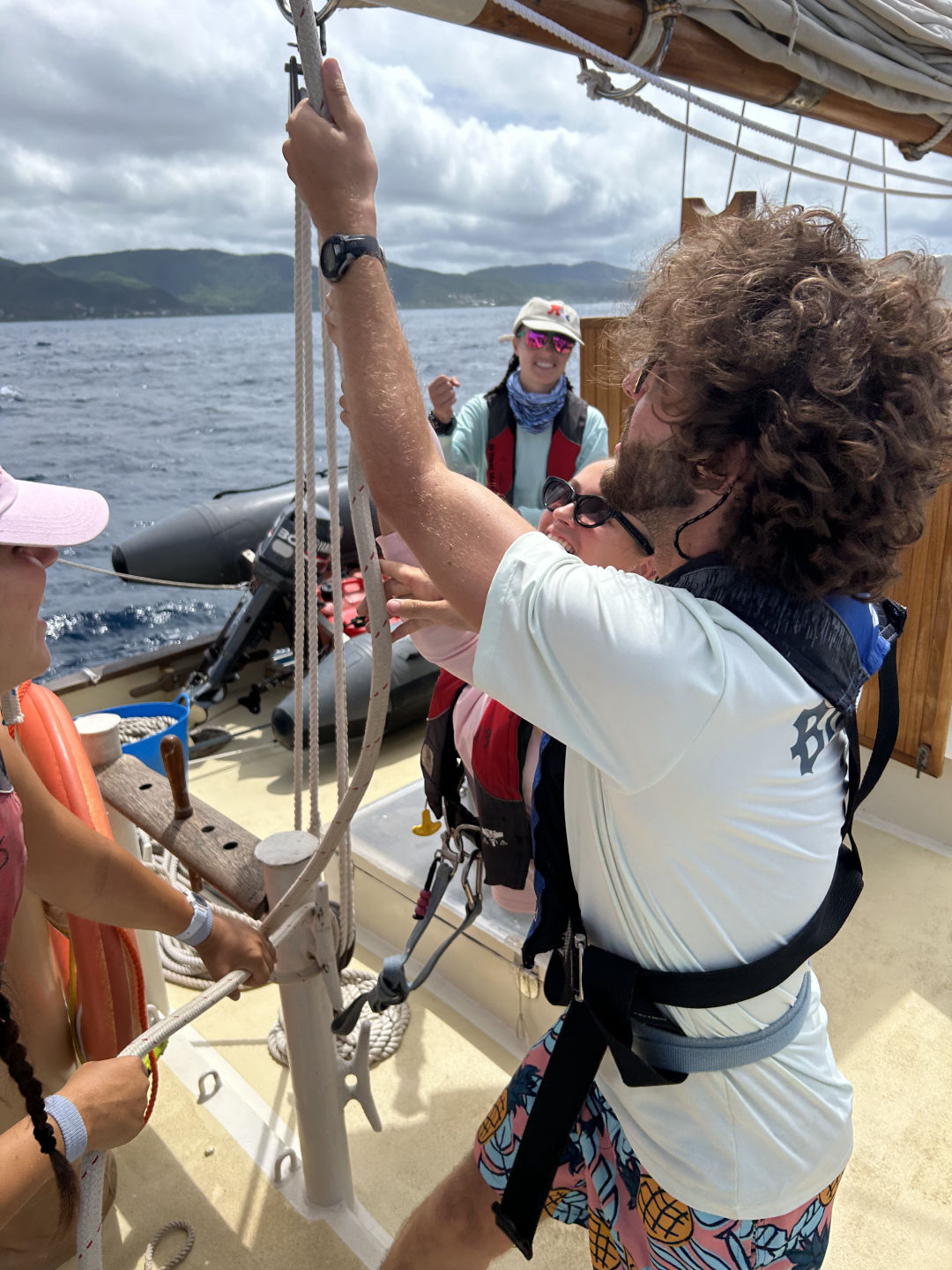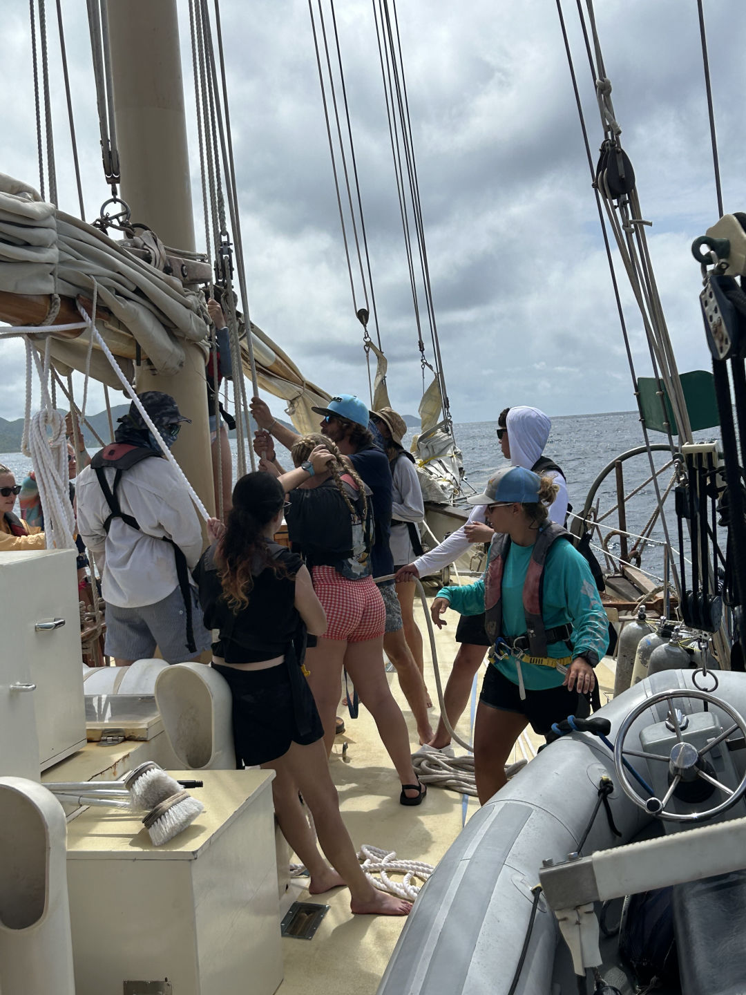 Waking up with the thoughts of sailing on our minds, the day was off to a good start. Some of us were worried about getting seasick but were on our toes since we got off the dock. It was exhilarating. Everyone was a little skeptical about their full knowledge of sailing but the pressure of time and knowledge from our seamanship class led us to a successful passage. We left at 9 am and arrived in Nevis at 6:30 pm with one class in between and a hearty lunch. A good group of us were watching for buoys as we went into anchor outside a town in Nevis while sailing directly into some rain which was fun and cool to see. Looking at the volcano and sites of various quaint towns was a site that many of us hadn’t seen and enjoyed. It was epic to look in every direction and not see land at one point.