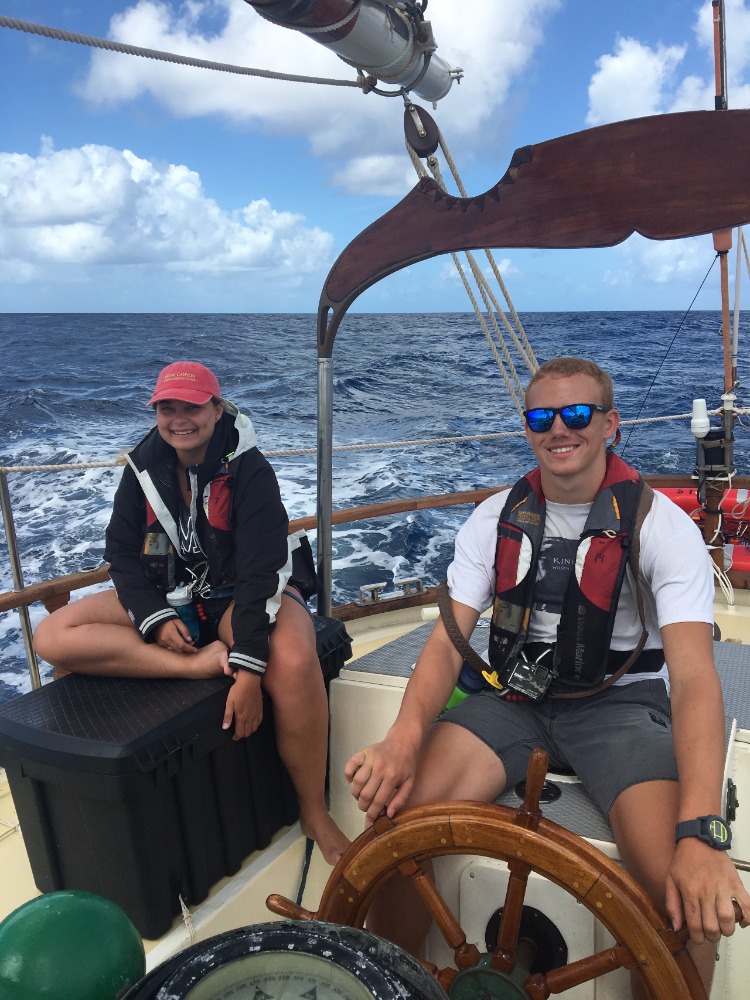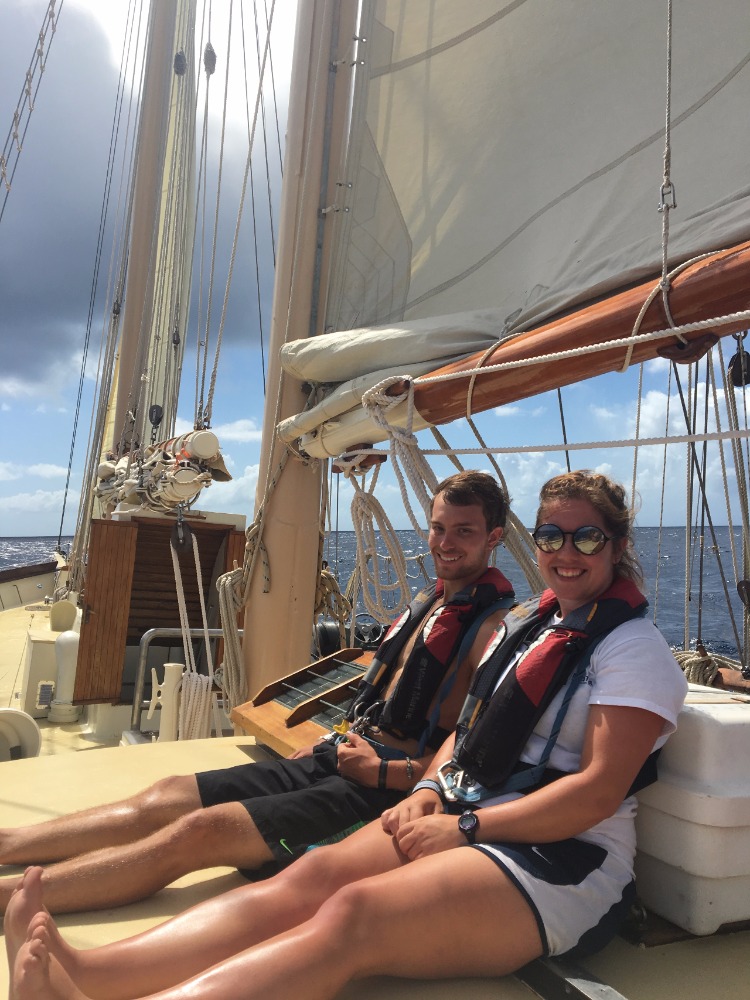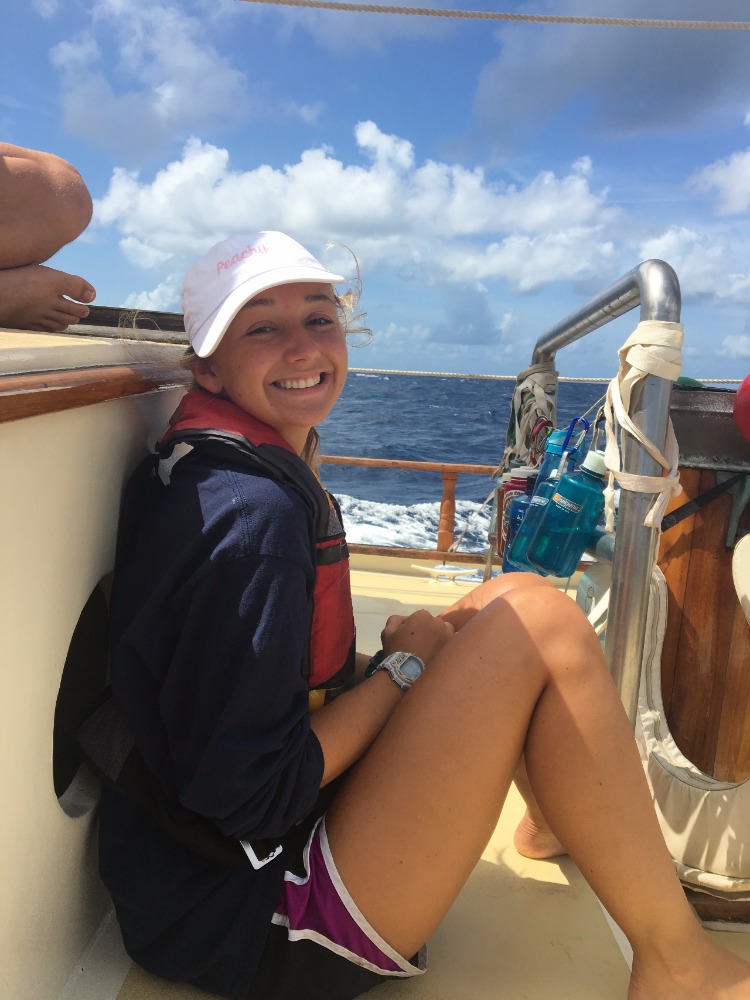 The crew woke up bright and early to a nice little bowl of boatmeal (oatmeal on a boat) before their first class. We then proceeded below deck to learn about ocean sediments, which in our case were some M&M’s and strawberry hearts in our very own candy lab. Once the crew was sugared up and ready to go, we ate a quick lunch before raising the anchor and starting our first voyage to the island of Nevis. The trip would take a full 24 hours of sailing, which meant the crew would have to split up into three watch teams to keep the boat on its path while others were sleeping. During our four-hour shifts, we would have to do a boat check every hour, which included making sure the galley was 40/40 (clear of objects that could go flying), checking the sails, and keeping track of the boat’s course, speed, and the atmosphere around us. The seas had Ocean Star rocking back and forth tremendously, making it difficult for the crew to stay on their feet, so to stay safe, we would clip into lines around the boat in order to move without sliding everywhere. The trip was proving to be a challenge, but I can honestly say that the crew is getting some quality bonding time and growing as a team.