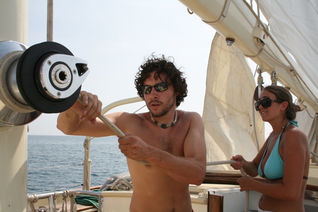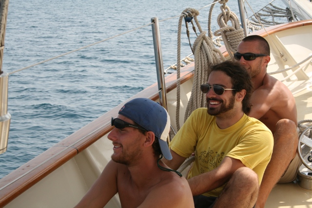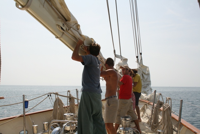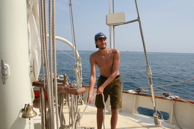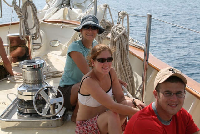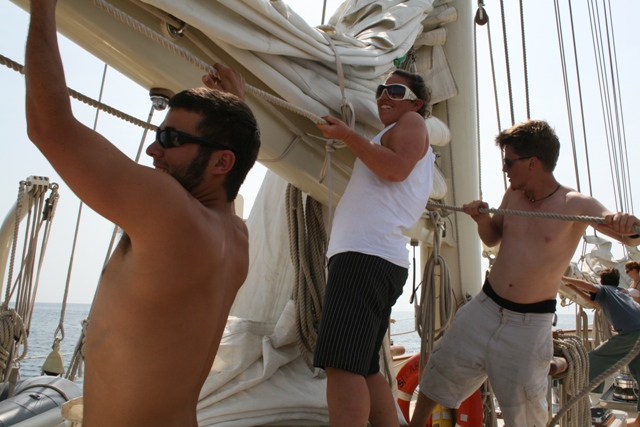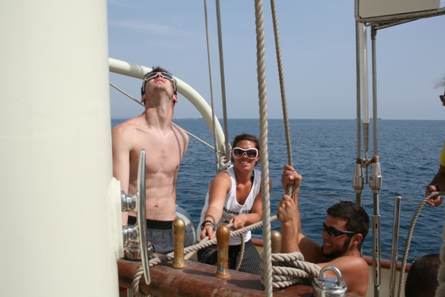 Today was day four of the journey. The day started with our splitting up into four watch teams, each of which was led by one staff member. Each group was shown and taught the names of the sails and lines, which was followed by reviewing safety and survival techniques in an abandoned ship drill. After lunch, we set sail for the first time for the afternoon. While out on the water, we practiced a few different maneuvers with our watch groups and also had a man overboard drill. It was a beautiful day, and everyone had a good and exciting afternoon, finally setting sail for the first time aboard Argo.