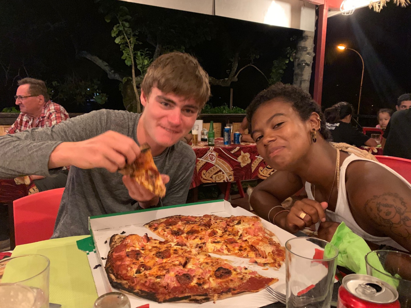 David and Kai are sharing a massive pizza.