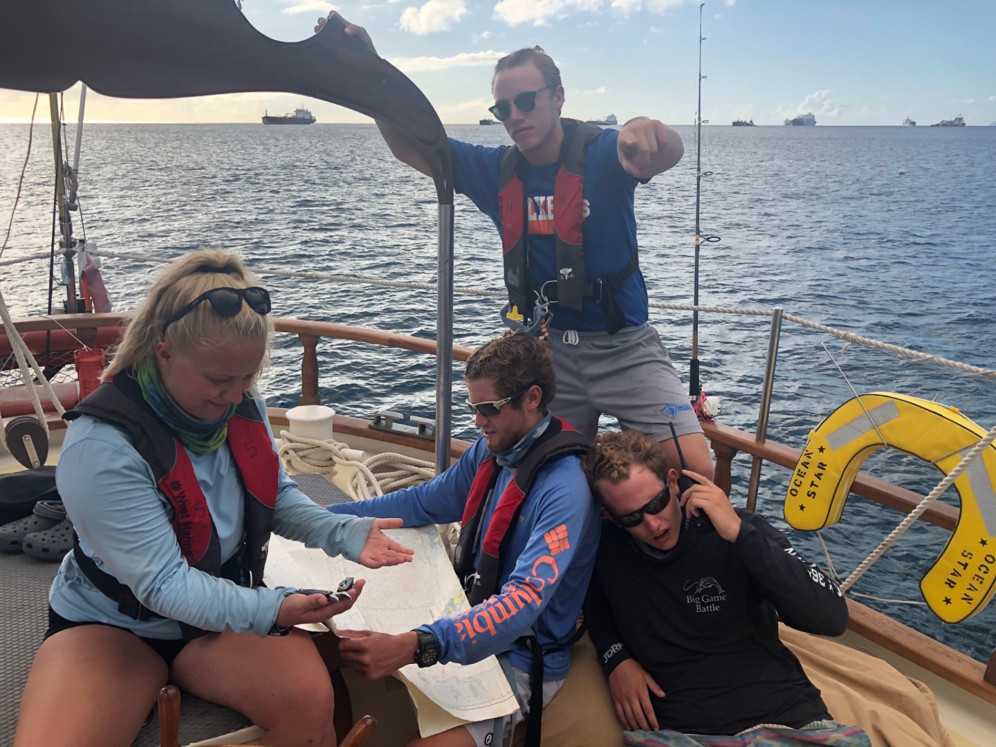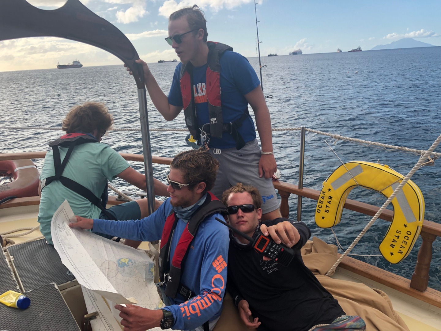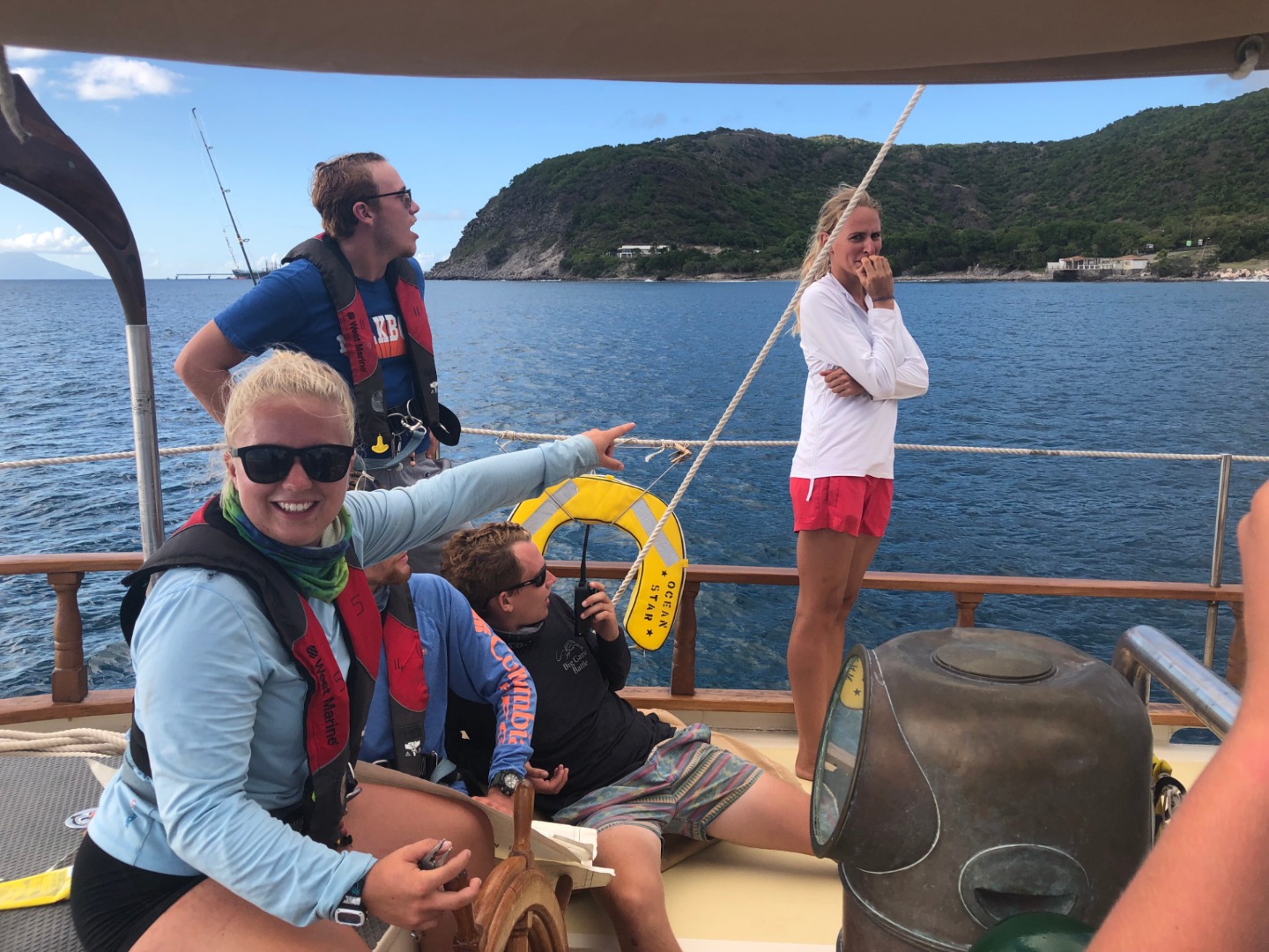 After some nice food made by Kennedy, I had to forfeit my job as skipper to Eli, the elected skipper for the day for our first student-led passage. Steff, Jill, and I were elected as representatives under Eli and were assigned as Navigation, Engineer, and Bosun. We started our journey to Statia around 0900, about an hour after we planned on departing, so we were all worried that we were going to be late arriving at Statia. We had smooth sailing until we were about an hour out and realized that we had a dilemma at hand: either navigate through the oil tankers that were about a mile off the coast or go around them completely and take more time. As Skipper, Eli chooses to go through them after we had warned him about the floating gas lines they could have in the water that we read about the night before. Thankfully under Matthew’s navigations skills and the rest of the crew’s help, we were able to navigate through the “minefield” of fuel lines. We had just pulled into where we were going to anchor right on time at 0330, and Carolyn was very excited that we didn’t have to navigate at night through waters we hadn’t seen before. After dropping anchor, Eli and Jill decided to go snorkel the anchor to make sure we were secure before shutting the engine off. Thankfully we nice and dug in, and now it was time for the rest of us to go have fun and snorkel in some new waters. After hopping in the water with Ridge and Kaiden, we swam around but didn’t see anything until we saw two sea turtles swimming near the boat anchor. Before yesterday, none of us had swum with them, and we were so amazed at how gracefully they glided through the clear Caribbean waters. Only two weeks left to go, so we’re all pretty bummed out about going home. Gotta make the most out of these two weeks. All righty y’all, this is your boy for the last time on the Ocean Star blog. I love you all, have a great life.