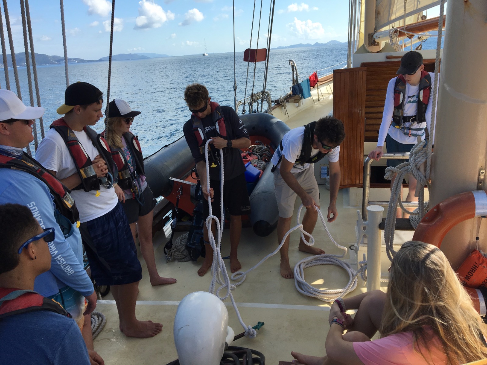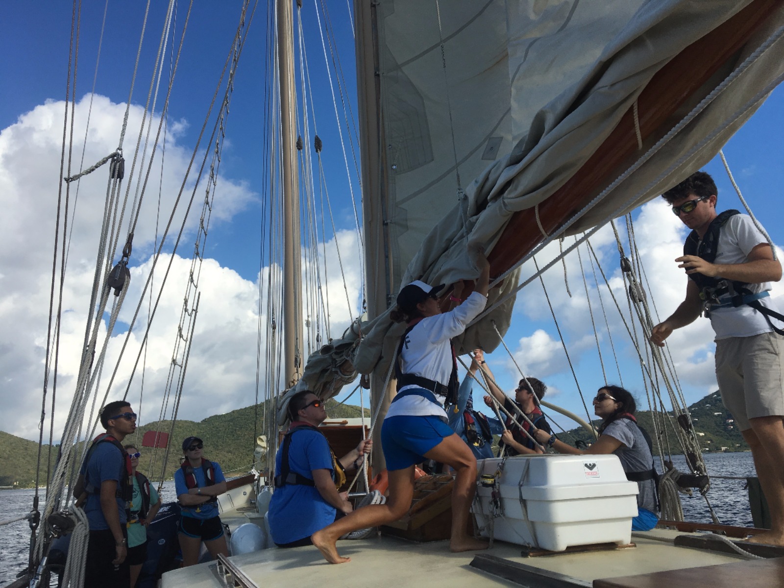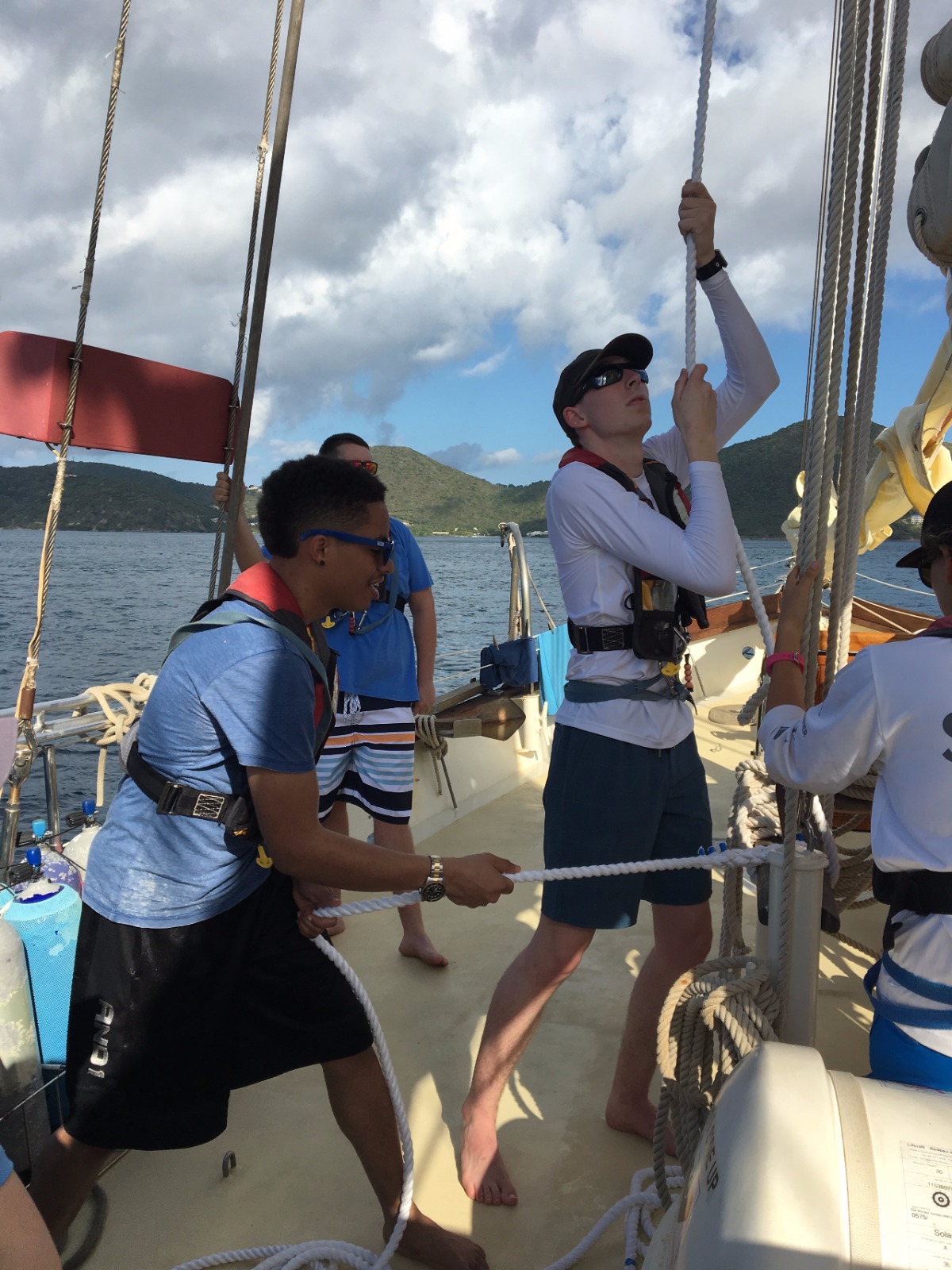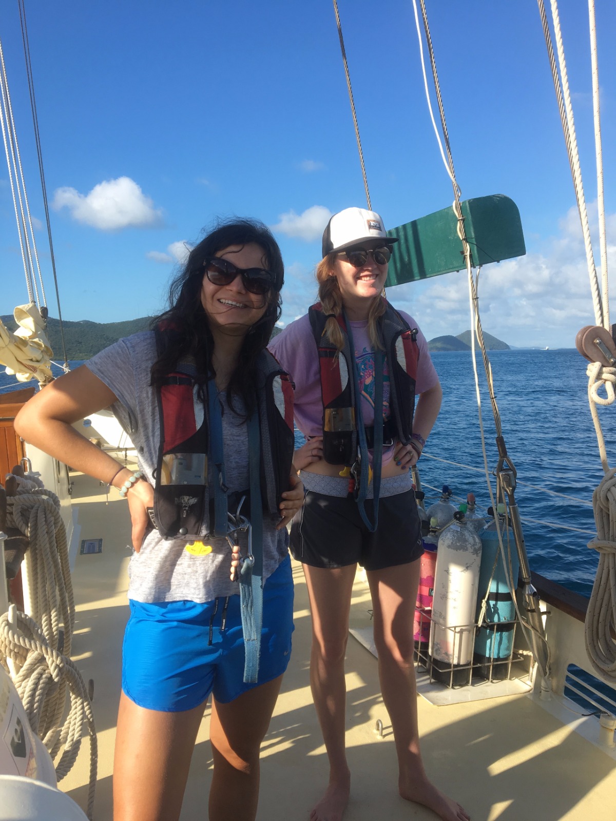 Today, we set sail for the first time to experience what it feels like to coast through the water, the wind carrying us towards our next destination. After making it off the dock, we ate breakfast and learned how to raise the sails and change their direction as we spun in circles in the water. Once we made it to Peter’s Island, we finally got to jump off the boat and felt the Caribbean waters as we took our swim test. Those undergoing their open water PADI training then got their first chance to dip their heads beneath the calm shores of the island and experience what it feels like to breathe underwater. Hovering over the white sand with meters of aqua blue water above my head was beyond magical. Returning to the boat, we were greeted by those already certified, and we quickly ocean-showered and prepped for our taco dinner. With the boat next door bumping the tunes, we got a quick lesson in proper boat etiquette and what not to do while in a peaceful bay. As the deck was cleared and cleaned after dinner, we were headed back to our dive class so we could continue to explore the aquatic world underneath our feet.