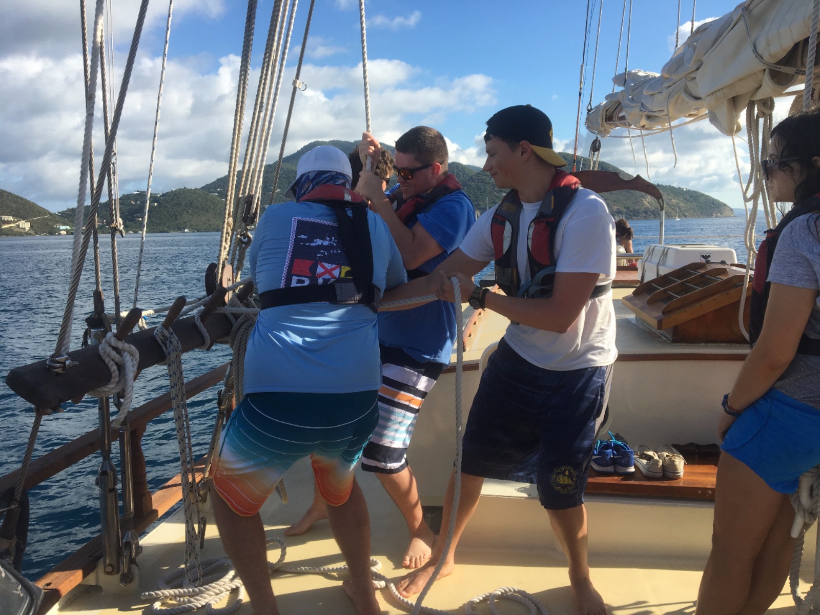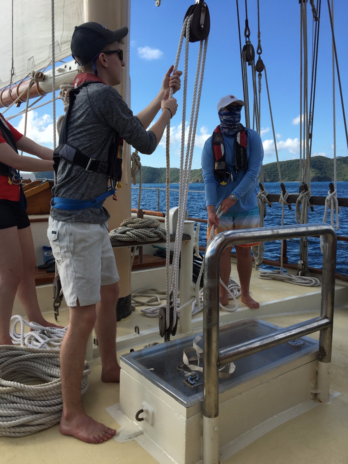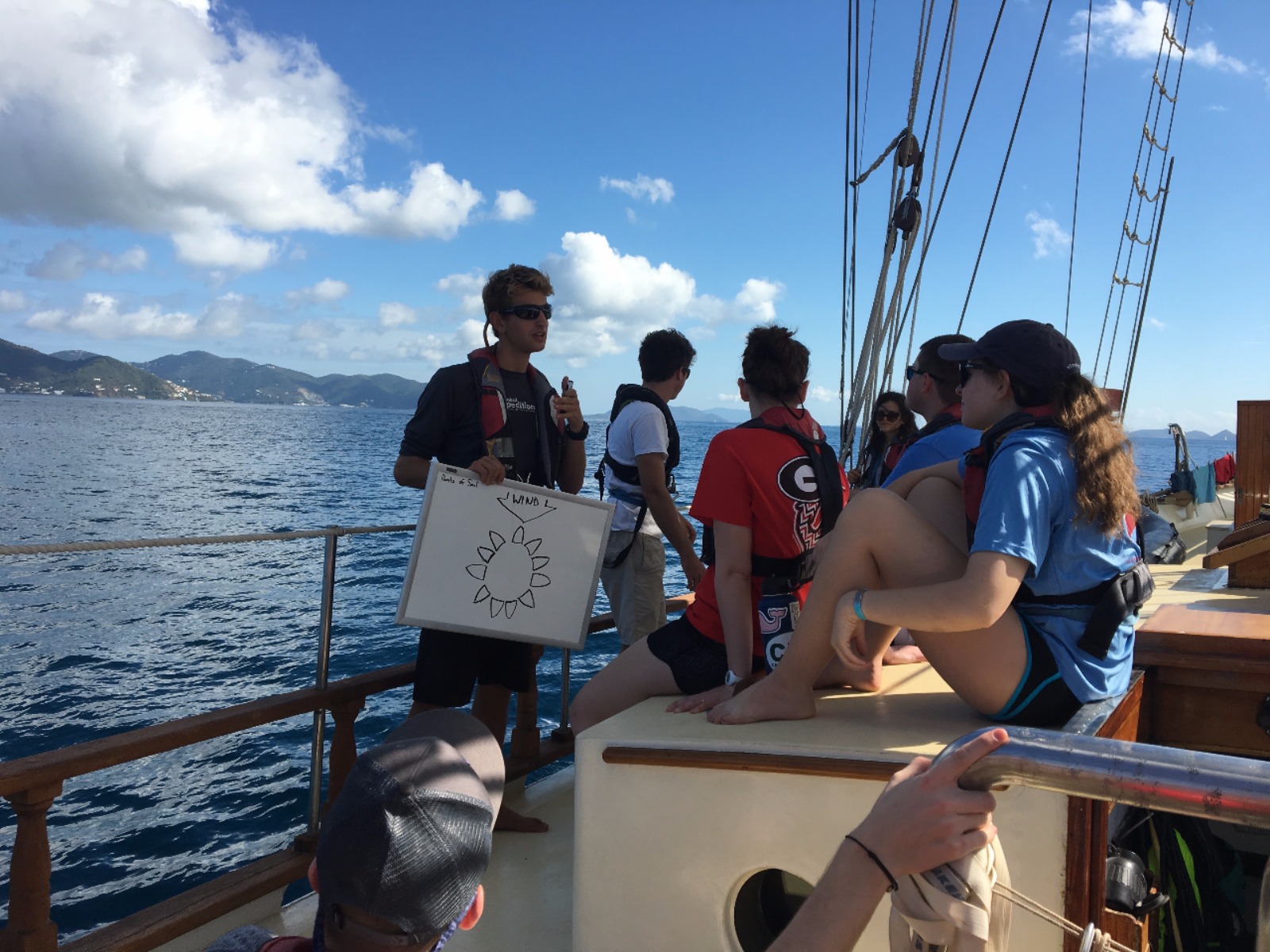 Today, we set sail for the first time to experience what it feels like to coast through the water, the wind carrying us towards our next destination. After making it off the dock, we ate breakfast and learned how to raise the sails and change their direction as we spun in circles in the water. Once we made it to Peter’s Island, we finally got to jump off the boat and felt the Caribbean waters as we took our swim test. Those undergoing their open water PADI training then got their first chance to dip their heads beneath the calm shores of the island and experience what it feels like to breathe underwater. Hovering over the white sand with meters of aqua blue water above my head was beyond magical. Returning to the boat, we were greeted by those already certified, and we quickly ocean-showered and prepped for our taco dinner. With the boat next door bumping the tunes, we got a quick lesson in proper boat etiquette and what not to do while in a peaceful bay. As the deck was cleared and cleaned after dinner, we were headed back to our dive class so we could continue to explore the aquatic world underneath our feet.