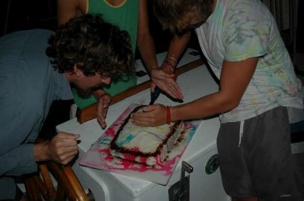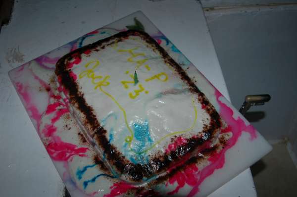 This morning, the crew was woken up to a wonderful breakfast of bacon, eggs, sausage patties, and bagels, quickly followed by a wonderful Marine Bio class, where we learned about all sorts of fascinating deep-sea organisms, such as the angler fish. In case anyone was wondering, the male angler fish becomes parasitic to his woman and literally latches onto her, taking nutrients from her and eventually completely fusing to her. After a science chat, we did an awesome hike to the rim of a crater, after which Josh and I started prep work on a piece of modern art for Jack’s “23” birthday. This cake was all but your average strawberry cake. Jackson Pollock would be proud of this modernistic-styled dessert.