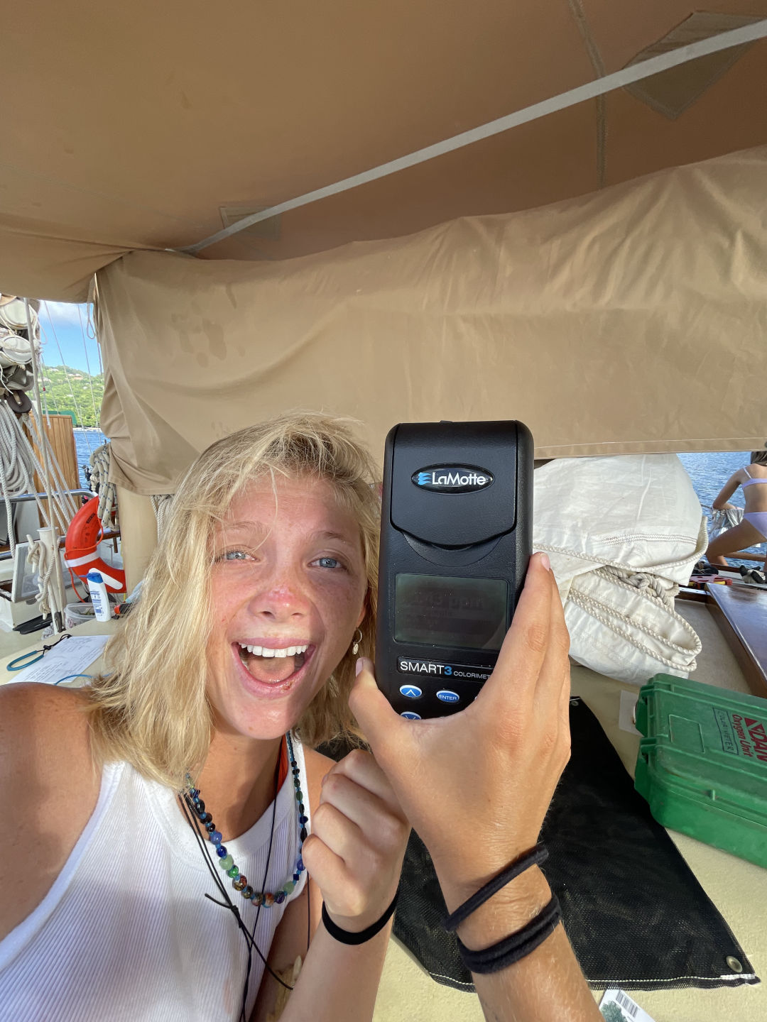 The day began with a delicious breakfast of egg wraps cooked by Liana. Shortly after, we underwent our fish ID dive, continuing to progress through the advanced open water course. On the dive, we saw many species of fish and recorded them on the dive slates. Following the fish ID dive was a lunch of spring rolls. The peanut sauce was particularly enjoyed by all. Then came everyone’s favorite part of the day: sciencing. We broke off into our respective science teams to begin working on our group research projects; our team (pictured in photo 2) began collecting phytoplankton samples and testing the abundance of nutrients in the water. If you thought we were finished with fish ID, you’re wrong. We had the fish ID quiz! Porites porites – the finger coral – was well remembered by the students. After the quiz (and lecture) was one of the coldest showers to date. The one-minute-long marination in Hibiclens did not help. Luckily we had stir fry for dinner to warm us up. It was an exhausting day, hence, the lackluster blog. But it was a good day.