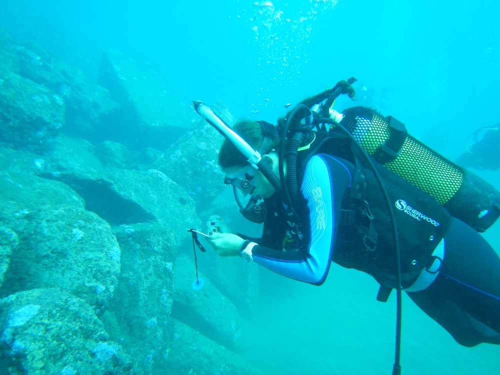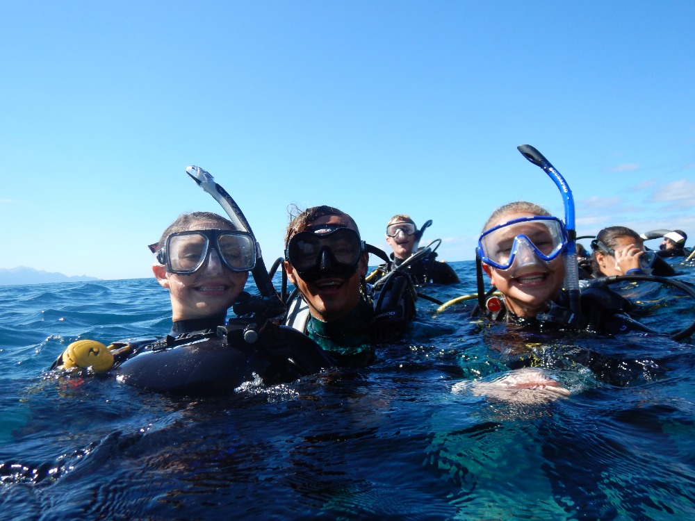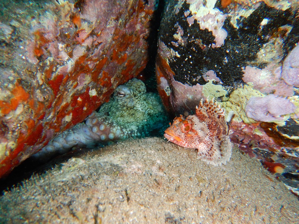 The dive site was one of the best yet. For many of us, this was also our first dive since becoming certified Open Water Divers. We were moving on to try to become Advanced divers. The PADI Open Water course focuses on learning to dive safely and all of the things you need to do to keep yourself safe. As an Advanced Diver, we start to focus on improving our skills so we can fully start to explore underwater. The options are almost endless, but learning to navigate, diving deeper, diving at night, improving buoyancy, and underwater photography are just some of the possibilities. Today, Jess was helping us to start to identify fish. Brightly colored hermaphrodite parrot fish, goat fish sifting through the sand with their whisker-like barbels, butterflyfish which use distinct patterns to confuse predators as to which way they plan to make their escape, blennies, and sand divers that camouflage themselves in the sea bed were just some of the fish we spotted. However, the highlight was definitely the curious octopus that came to say hello. He was so close you could feel the water pumping out of his siphon.