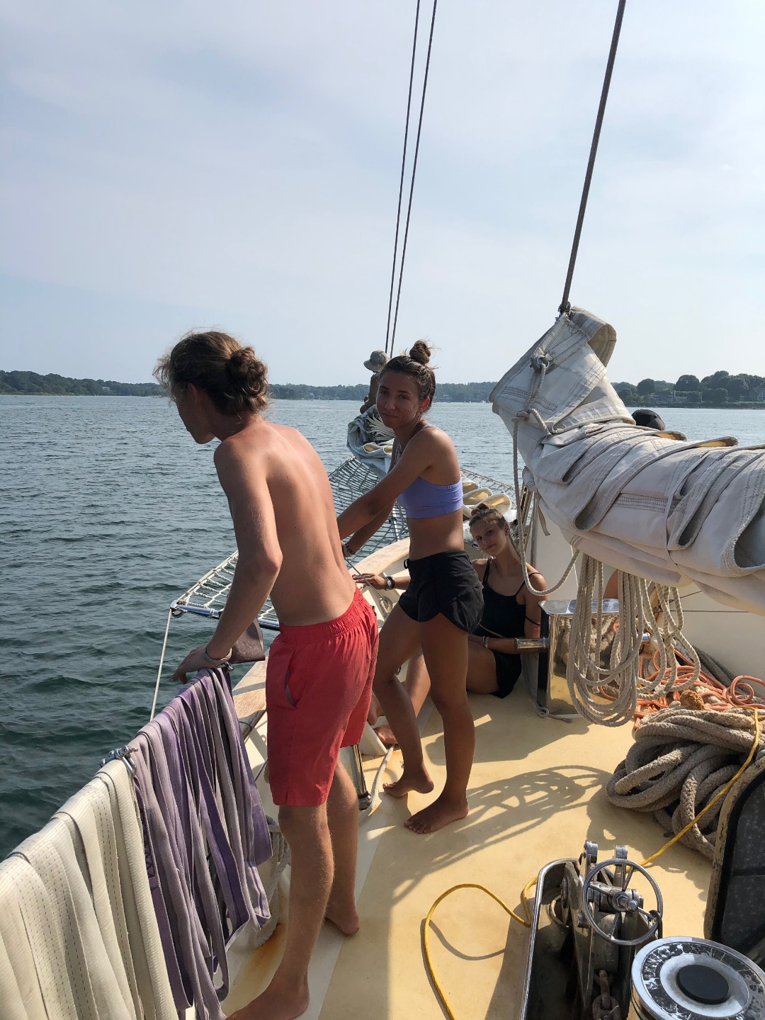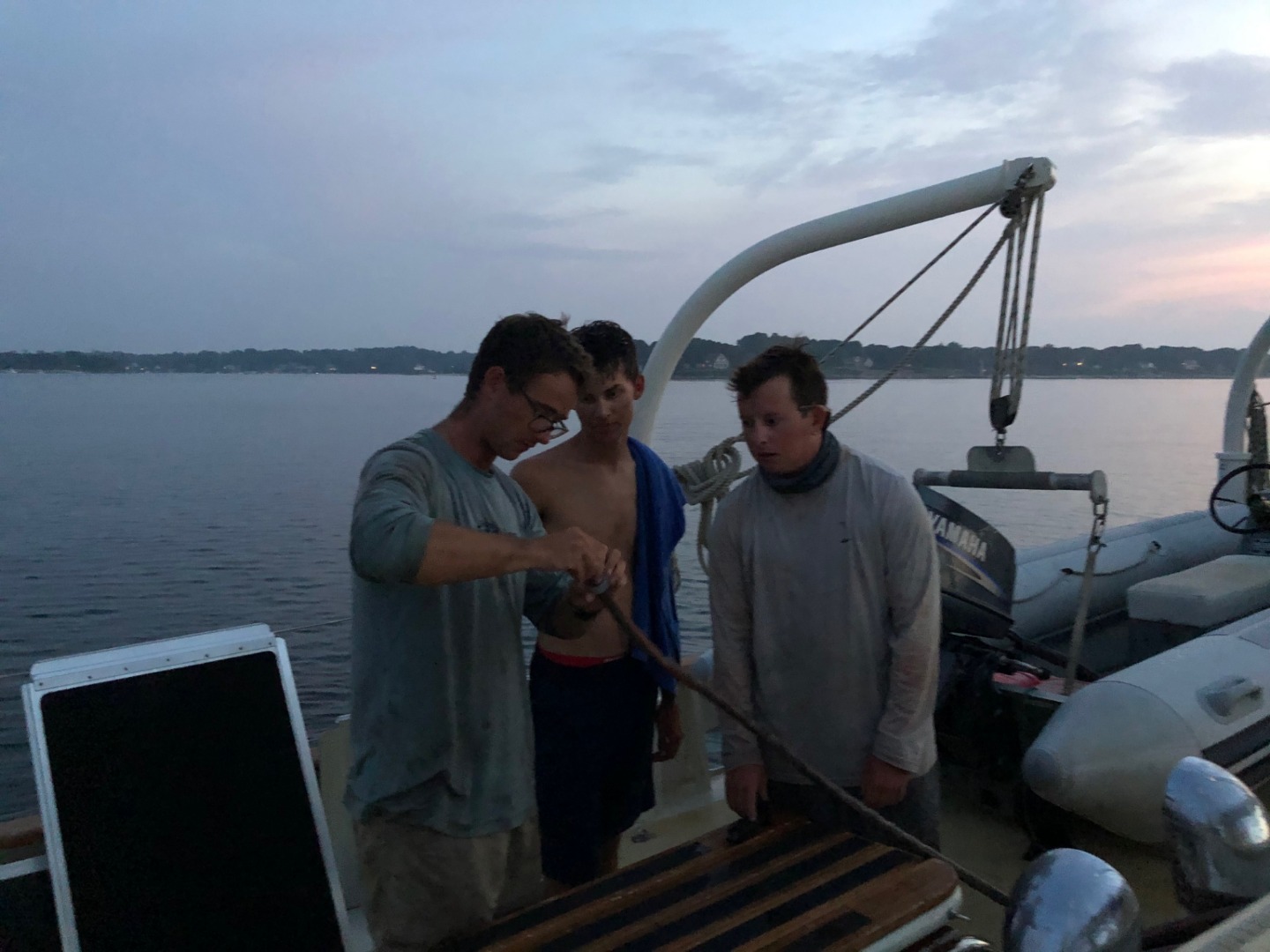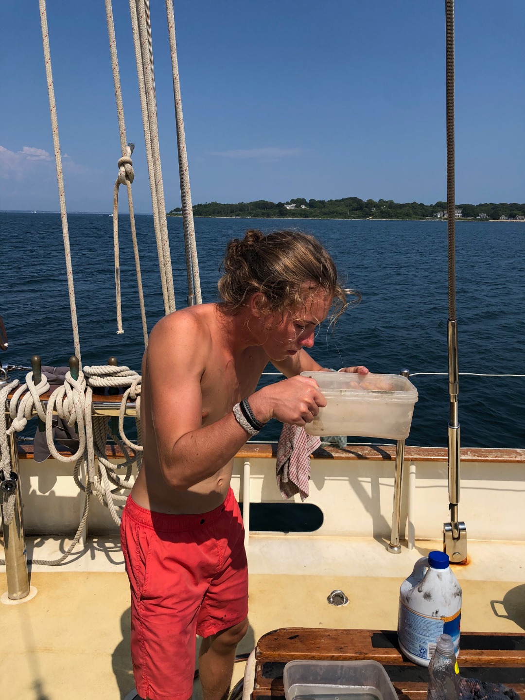 Today some folks on our boat had a 5;45am wake-up so they could head out and walk a trail on a beach nearby. The ones who stayed back woke up at 7 simultaneously to the Hikers coming back. Josh, Katie, and Evan prepared us some awesome Pancakes for breakfast. After the cleanup was done, we raised our anchor and headed out towards Fishermans Island, which is located just of the coast of Mystic. It took us roughly 3 hours to get there. We had lunch and then a brief on our afternoon. We separated into different teams to make the cleanup more efficient. Some people cleaned the Laz, some did the Galley, and others the Grey Water tanks. It took a lot of effort to complete all of these jobs, so we all were super hungry for delicious Shepard’s Pie. We even had to get out Tortillas and Peanut butter because we were so hungry. Tonight will be our last day in Anchorage before we head to Mystic tomorrow.