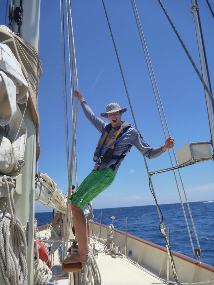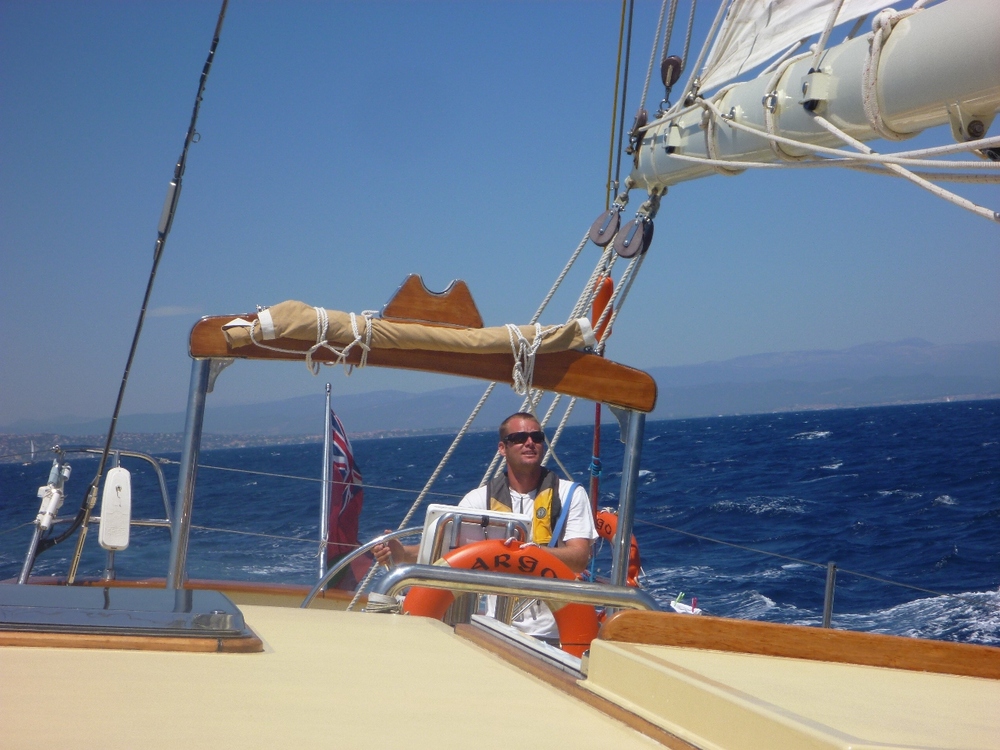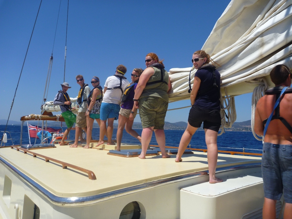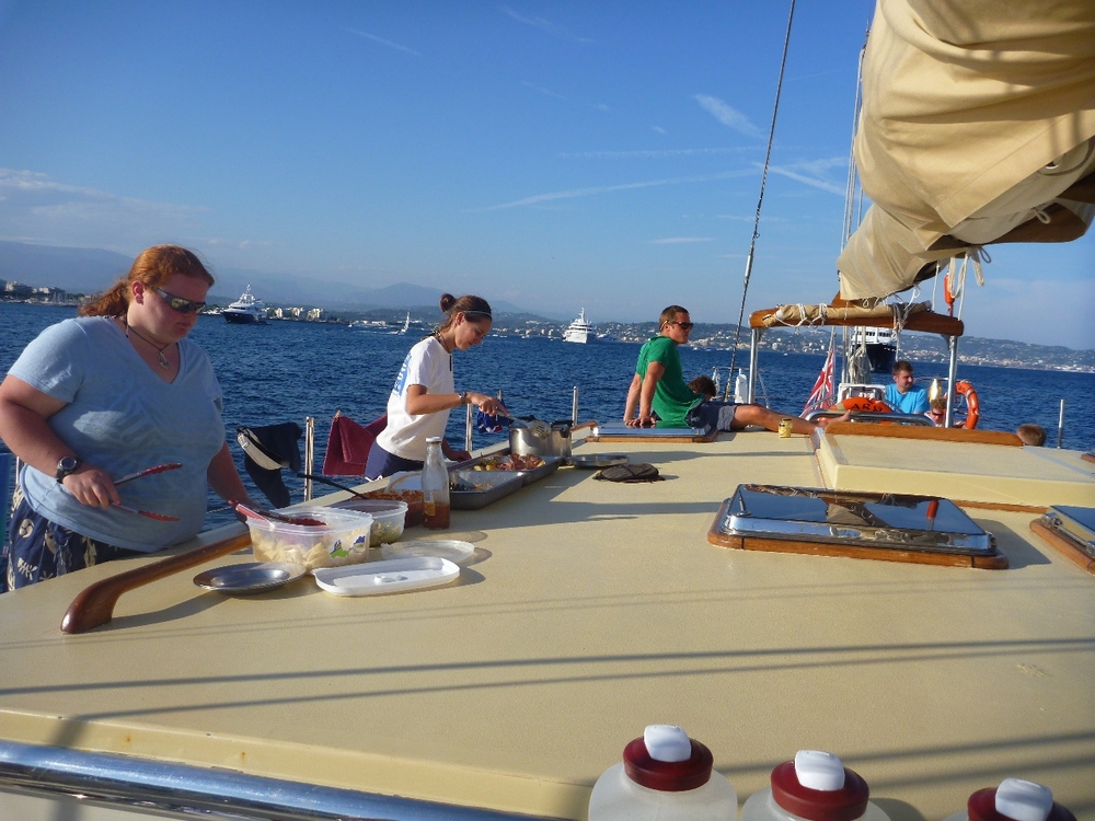 The day began with the students going ashore in San Tropez. The major spectacle of the city was a large flea market that ate up most of our time on land. While the girls were doubtlessly fascinated with the jewelry and dress stands (the guys managed to “lose” them at one point roughly 15 minutes in), I was drawn more towards the stunning (and aromatic) displays of olives, meats, bread, and cheeses. Everyone stocked up on souvenirs and various knickknacks before we returned to Argo in preparation for the day’s move. During our journey from San Tropez, we set the mainsail, main staysail, forward staysail, and jib and, thanks to some nice winds, managed to exceed 9 knots on sail power alone. During the sailing, we were taught about the various points of sail and, while experimenting with them, had several exciting moments full of crackling sails, swinging booms, and sea spray crossing the deck. Following the sailing class, we all collected for Oceanography class, where we learned more about salinity and the elements dissolved into seawater than I could ever hope to fit into this blog. Following class and putting down the sails, we anchored off of La Napole. In the succeeding free time, we went swimming, where James tried valiantly to accomplish the surprisingly difficult task of riding an inflatable fender in the heaving ocean, and Andrew mostly managed to complete a head-first dive after half an hour of spirited attempts and rampant, conflicting advice from staff and students alike. Meanwhile, the writing of this blog is being severely derailed by the “dancing” antics of Laurie and John, which, though highly amusing, seem to consistently devolve into ridiculous posturing and bouts of laughter.