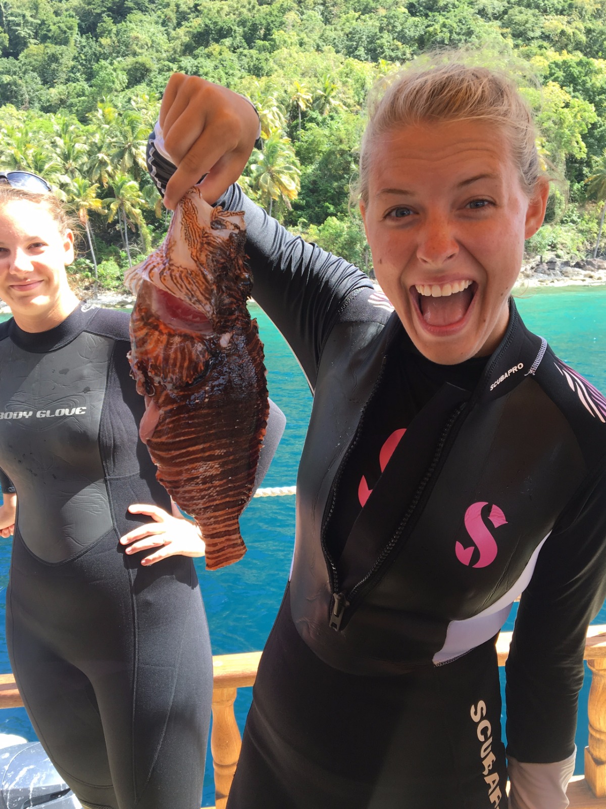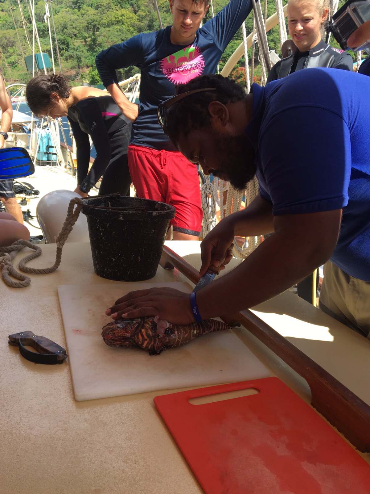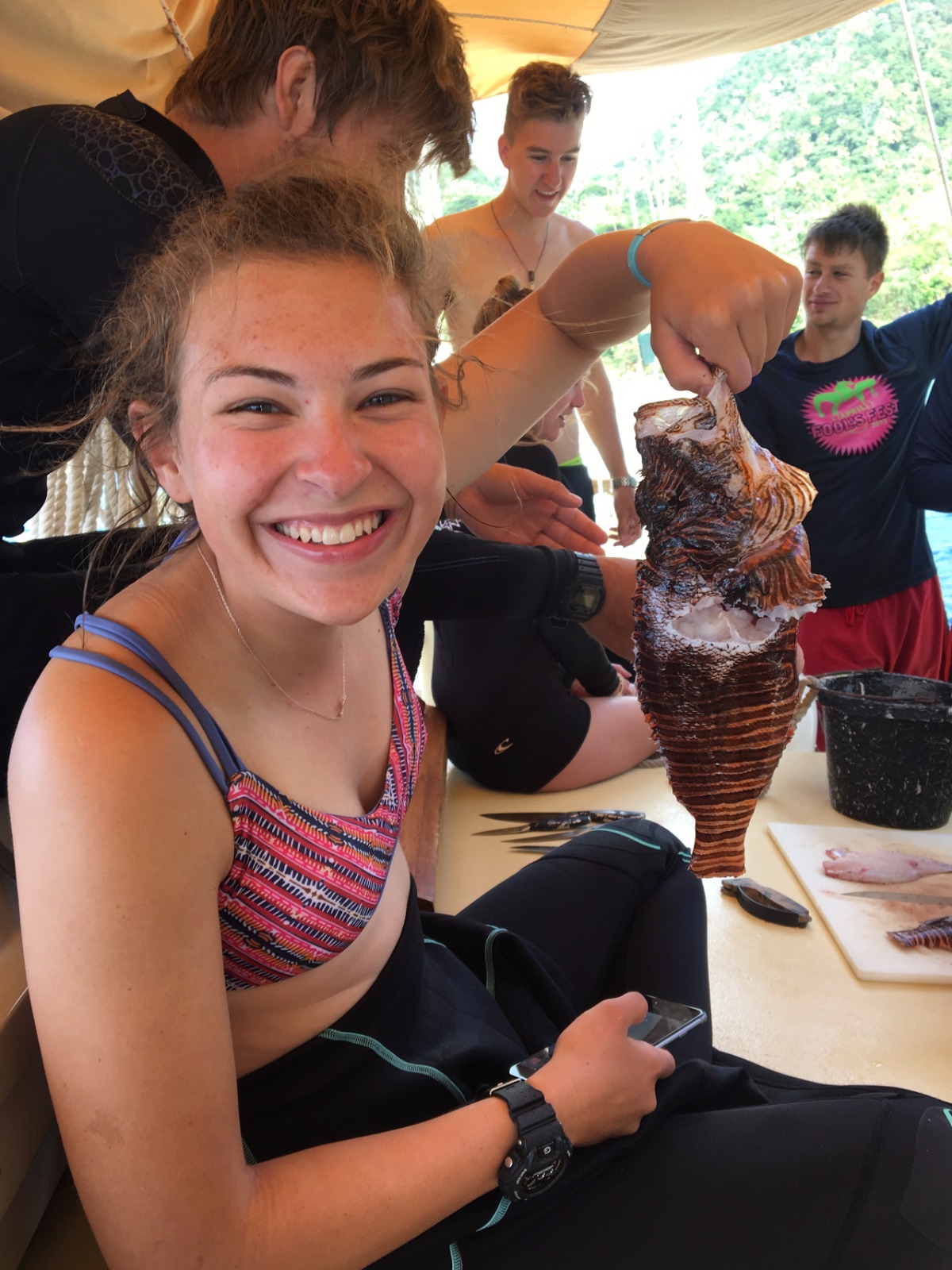 The days we’ve had in St. Lucia so far have been filled with amazing sights, from the colorful botanical garden to the warm natural springs. None, however, compares to that of Petit Piton towering above Oceanstar, most beautiful as the rays of the sun hit in the early morning. As with every morning, the crew was awoken by the skipper, playing music to get everyone out of their bunks for breakfast. Before lunch, representatives of the SMMA (Soufriere Marine Management Association) dropped by the boat to give the students an introduction to the marine park in St. Lucia and what they have been doing to conserve the reefs surrounding the beautiful island. This includes everything from picking up trash to monitoring sedimentation rates and managing invasive lionfish populations. A brief lunch break was taken before everyone geared up in their SCUBA kits for another training dive: the PADI advanced open water deep dive! The SMMA transported the crew to the dive site known as Flight of the Superman, where they would participate in their very first drift dive. Once in the water, the students followed the SMMA guide, carried by the current along the reef. Not only was this a training dive, but a mini lionfish derby as well, during which the students were in charge of spotting lionfish for the guides to spear and store in a zookeeper to bring up at the end of the dive. With everyone back on board, the lionfish caught were dissected, and the filets were kept for dinner in the evening. The lionfish was marinated and prepared by Carter, which perfectly accompanied the vegetable and rice stir-fry cooked by head chef Ciara and her sous Isaiah. Post dinner, we all answered the squeeze question chosen by the skipper of the day: rose, thorn, and bud, meaning our favorite part of the day, our least favorite part of the day, and what it was we were looking forward to. Lastly, everyone sat down to watch the documentary Racing Extinction before turning in for the night, ready to move to Marigot Bay, St. Lucia, in the morning.