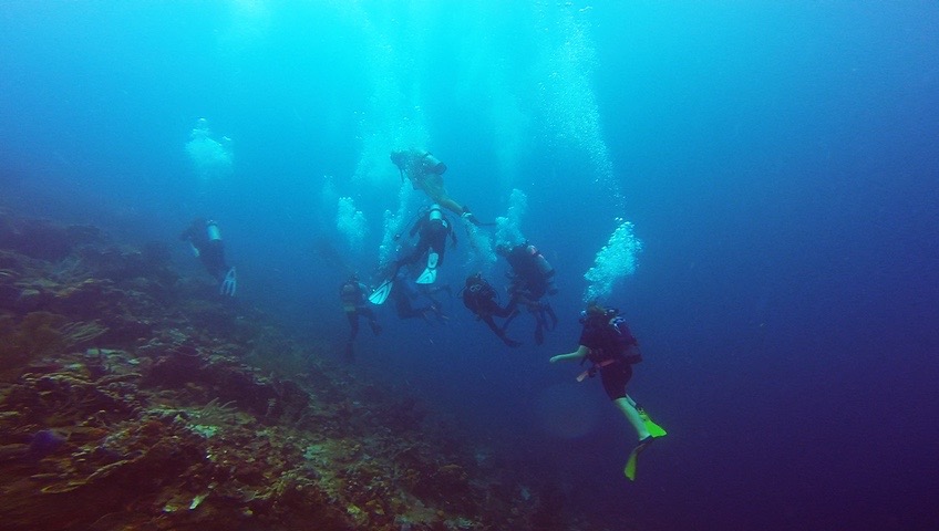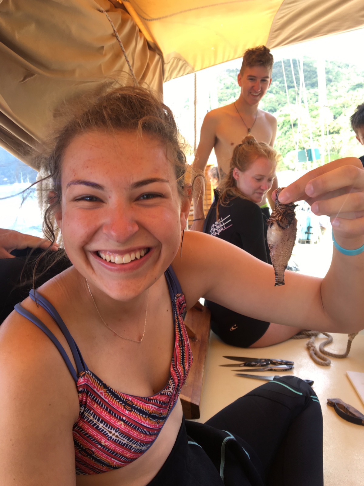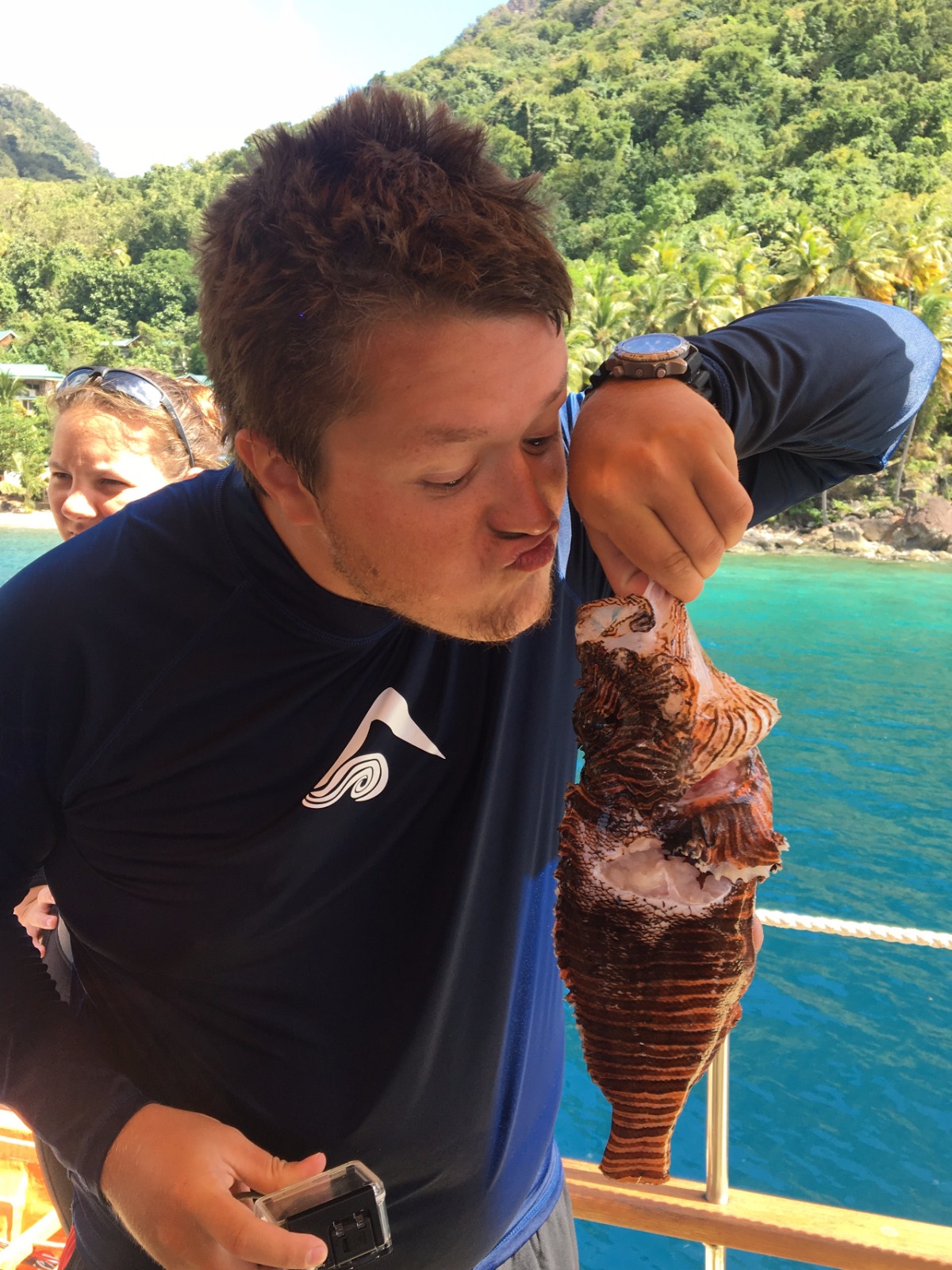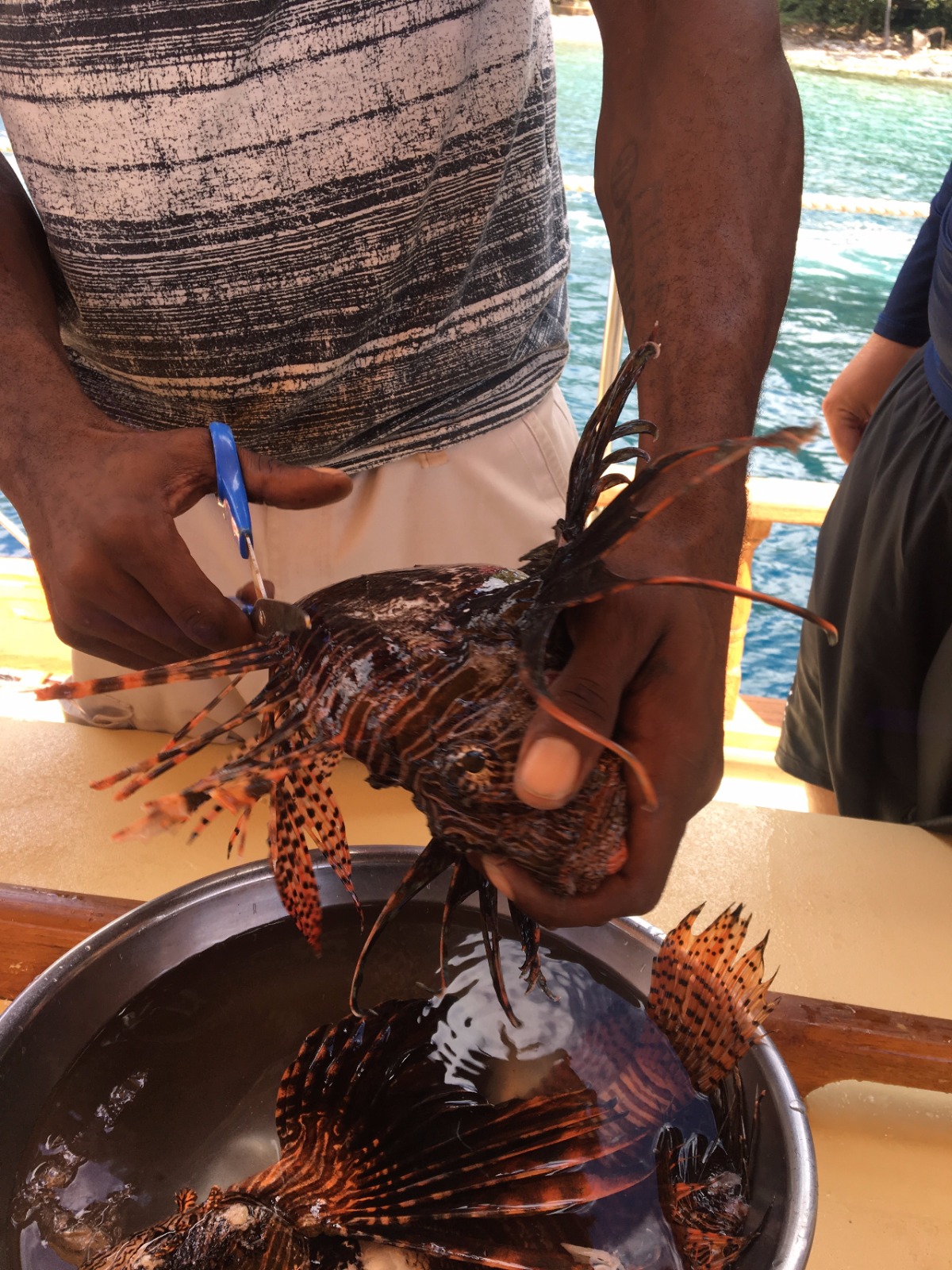 The days we’ve had in St. Lucia so far have been filled with amazing sights, from the colorful botanical garden to the warm natural springs. None, however, compares to that of Petit Piton towering above Oceanstar, most beautiful as the rays of the sun hit in the early morning. As with every morning, the crew was awoken by the skipper, playing music to get everyone out of their bunks for breakfast. Before lunch, representatives of the SMMA (Soufriere Marine Management Association) dropped by the boat to give the students an introduction to the marine park in St. Lucia and what they have been doing to conserve the reefs surrounding the beautiful island. This includes everything from picking up trash to monitoring sedimentation rates and managing invasive lionfish populations. A brief lunch break was taken before everyone geared up in their SCUBA kits for another training dive: the PADI advanced open water deep dive! The SMMA transported the crew to the dive site known as Flight of the Superman, where they would participate in their very first drift dive. Once in the water, the students followed the SMMA guide, carried by the current along the reef. Not only was this a training dive, but a mini lionfish derby as well, during which the students were in charge of spotting lionfish for the guides to spear and store in a zookeeper to bring up at the end of the dive. With everyone back on board, the lionfish caught were dissected, and the filets were kept for dinner in the evening. The lionfish was marinated and prepared by Carter, which perfectly accompanied the vegetable and rice stir-fry cooked by head chef Ciara and her sous Isaiah. Post dinner, we all answered the squeeze question chosen by the skipper of the day: rose, thorn, and bud, meaning our favorite part of the day, our least favorite part of the day, and what it was we were looking forward to. Lastly, everyone sat down to watch the documentary Racing Extinction before turning in for the night, ready to move to Marigot Bay, St. Lucia, in the morning.