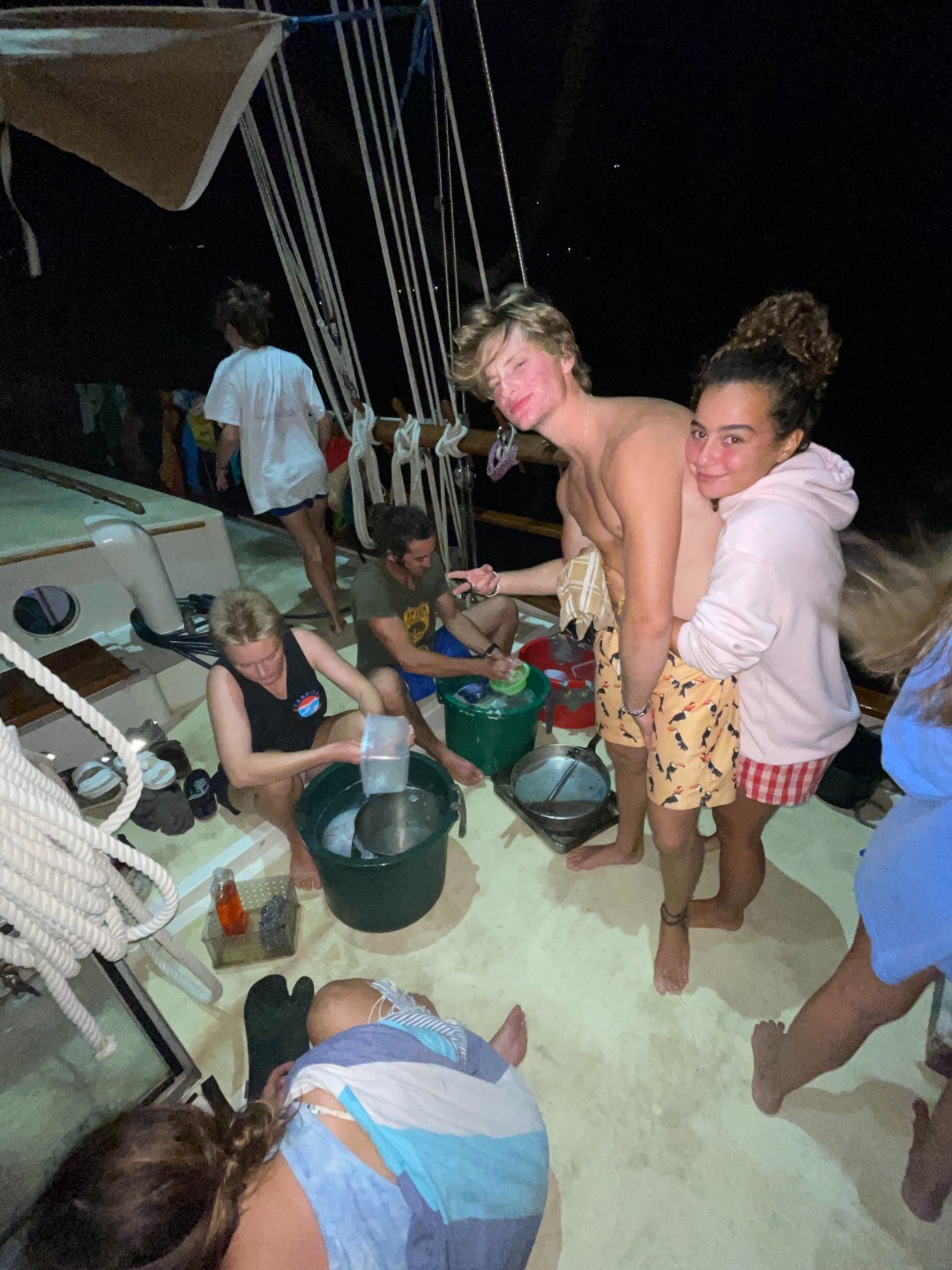 This morning I woke up to the sound of dive gear getting set up, which can only mean that we had a rescue scenario. At the sharp time of 6:45 am, we “rescued” 2 people, which was a great way to start our second to last full day. After we debriefed the scenario, we ate breakfast, and the first group got ready to go dinghy sailing. Once we got onto the dinghy, we went to the dock and walked about 15 minutes to the sail academy. Once they demonstrated how to use the sail dinghies, we got onto them and went off. I got onto a sail dinghy with Quinn, and within the first 10 minutes, we flipped it, went outside the boundaries and over a reef, and almost got hit by the boom countless times. Once we got the hang of it, after being followed around by the instructor for like 20 minutes, we lost them and started doing a lot of tacks. We watched Asta fall off the dinghy that had Sam, Hedrick, and Maxime also because her foot strap broke, and it was super funny. We then watched Tate and Eamon flip the sail dinghy, and we were laughing at them and 2 seconds later, we flipped ours too, so that was super funny. Hedrick also was getting told how to sail, which was super funny – he very politely said, “thank you so much for the tips.” After we finished doing that, we took a leisurely walk back to the dock, and on the way, we stopped and got snacks and drinks, which was quite funny watching everyone stress out about their ice cream melting. Once we got back to ocean star, we did a messy boat appreciation in preparation for tomorrow. We then ate dinner and had a confession squeeze which was so amazing to hear all of the confessions. This is all so weird to see come to an end. I can’t even imagine what it will be like not living with all of these amazing people. I am currently writing the blog while the pit is scream-singing Love Story by Taylor Swift and am about to start crying because I don’t know how to live in a house anymore, and I am going to miss every little moment that has happened on this boat. I wish I never had to leave, and I wish I never had to say goodbye to the most amazing group of people I’ve ever met. Bye Bye Blog, and if any of my shipmates read this after the trip ends, text me right now, and I love you all so so so much.