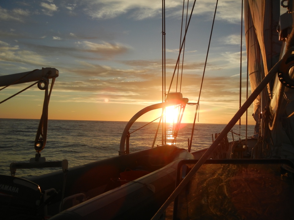 When we were all done with cleanup, we had a Marine Biology lecture which is always very informative unless the boat is rocking you to sleep, we did our best to stay awake and finally finished our marine mammals section of the class which we will be having an exam on in the coming week. After Marine Bio was Seamanship, where Big Mac presented a video documenting the sailing experience from 1902, which was extremely humbling given the common safety practices we use nowadays. After classes were done, we went right back to watch, or if it wasnt your watch, you had some free time to either nap or do some work on our literature reviews. Mac, on the other hand, took this fishing gear on deck and managed to reel in his second Mahimahi Tuna for the trip. For our Galley team, it was right back to work where they prepared our next meal, which was PHILLY CHEESSTEAKS! You can understand the scenes as it was most of our first time seeing steak since we all came from our respective hometowns. For those who werent already awake smelling the steak being prepared, I coerced them out of bed for dinner. We ate our cheesesteaks on deck with a beautiful sunset and were joined by a pod of dolphins to top it off. Cleanup after dinner went much smoother than it did earlier in the afternoon as some of us got ready to tuck in for the night in preparation for an early watch or if youre on watch team 2 (Talia, Lillian, Caterina, Grace C, Dan, Mac, Boston, and I), we went straight into watch. We expect to be in Essaouira sometime early in the coming morning, and Im sure you will hear from most of us as we regain service to our phones. Holly, Jeff, and Dan want me to tell you that he did, in fact, smile today (which he always does), but that was his request. That is all for now, we miss you, signing off.