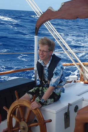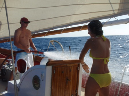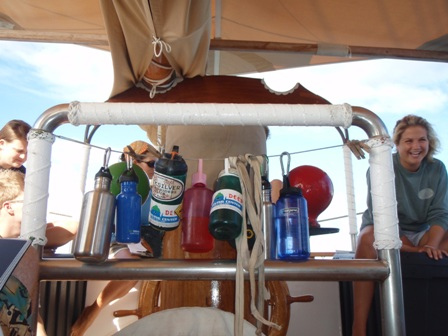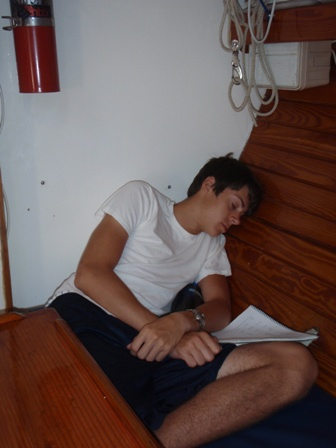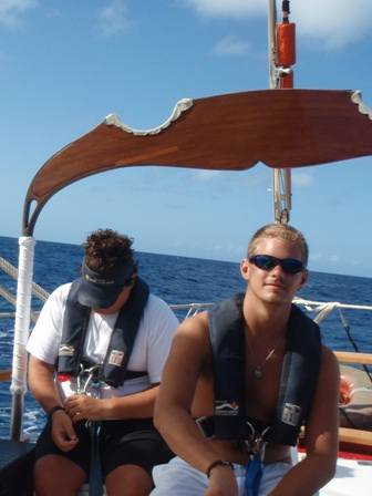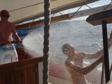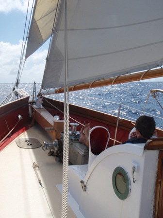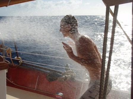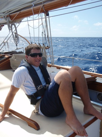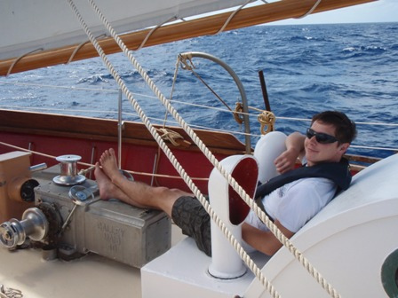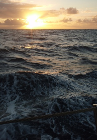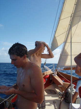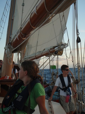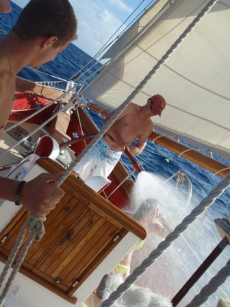 For Watch Team 3 and Ocean Star, the day began around 5:30 AM as a faint glow appeared off our port and gradually intensified as the sun rose to the east over Dominica in the far distance. We’d spent the 3-6 AM watch quietly, enjoying the clear view of the night sky, counting shooting stars, and identifying new lights as stars, planets, and satellites. At the same time, the light of the stars was mirrored by the sparkling bioluminescent plankton, agitated by the waves against the hull of the ship. By the end of our watch, our view of the stars was obscured by the rising sun. Watch Team 1 relieved us, and we crawled into our bunks to sleep away the day, waking up only to eat lunch and stand watch again at noon. Before a delicious dinner prepared by Annie, who cooked for us without complaint while being tossed around in a hot galley all day, shipmates had their first chance to shower in 2+ days. The hitch: no jumping in the ocean while underway. Instead, Kevin stood on the bow armed with the salt-water fire hose and looking a bit too eager. A few brave souls took their turns bracing against the spray and trying not to slip around on the rolling deck. We gathered together in the cockpit around 5 for the squeeze and dinner and enjoyed yet another spectacular sunset under sail. Having this opportunity to see the sunrise and set over the ocean every day, breaking up the cool starry nights and warm sunny days, is extraordinary and a big highlight of the trip so far. The day ended much the way it began, with Watch Team 3 on deck from 9 to midnight, gazing at shooting stars, sailing peacefully Until several well-aimed flying fish launched themselves at the ship and shipmates, hitting Steve squarely in the chest while he stood at the helm, and later Carter in the shoulder. Both fish and shipmates were a bit stunned, but no injuries were sustained, and the fish was sent back over the side before we retreated to our bunks for the night.