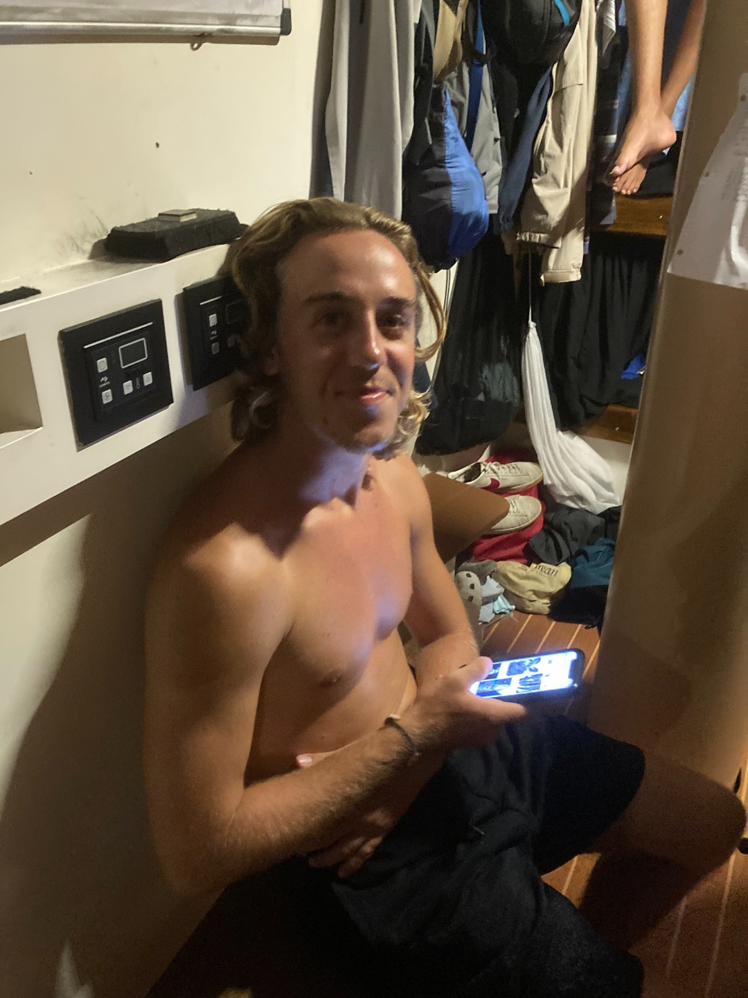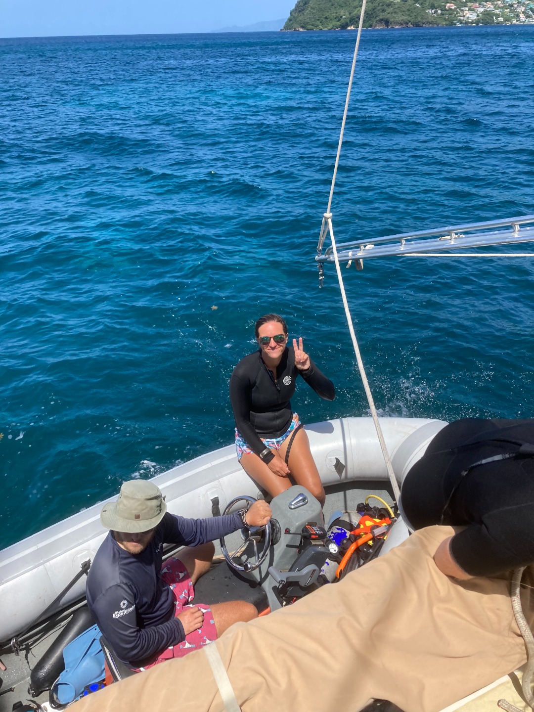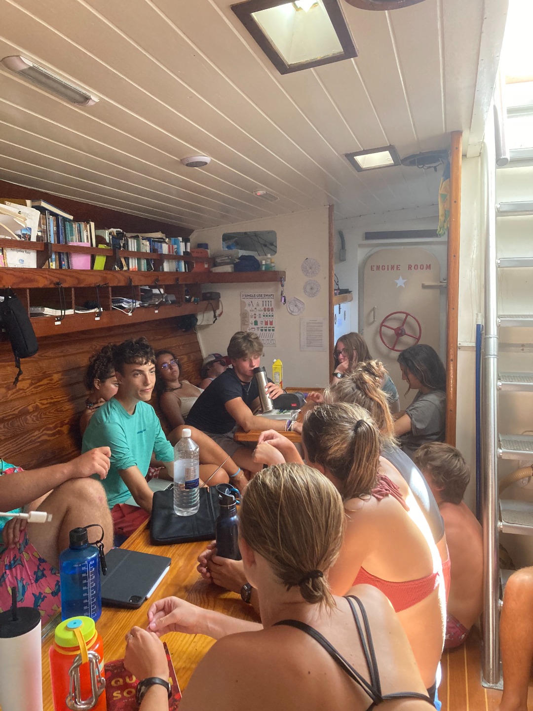 Between breakfast and lunch, the first dive group practiced their “boat” diving at the neighboring reef while the rest of us caught up on schoolwork or even more sleep – except for Fred, who was blessing the saloon with free smells from the galley. After lunch clean-up (which included the Surf’s Up soundtrack), we had a Leadership class to which Maxime led a discussion about different characteristics in leaders. After class, the second dive group headed out to complete their boat dive. My Oceanography research group and I saw this as an opportunity to get some data regarding coral abundance at different reefs. Turns out, being new to diving and trying to be a scientist is really hard. But it also makes for quite the entertainment. You could describe our dive as rather chaotic… The research group was juggling transects and quadrats while Quinn and Alexis were doing their own thing and Scuba Sam and Maxime were too distracted by fish while Staff Sam was trying to gather all of us at the same time. It was an experience.