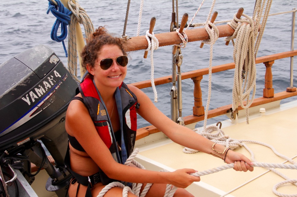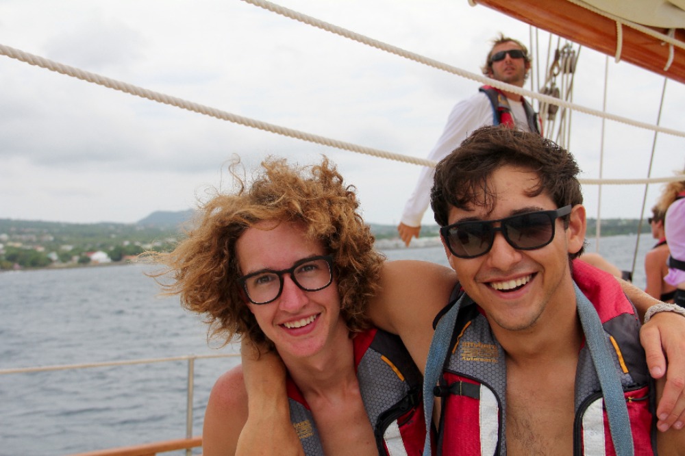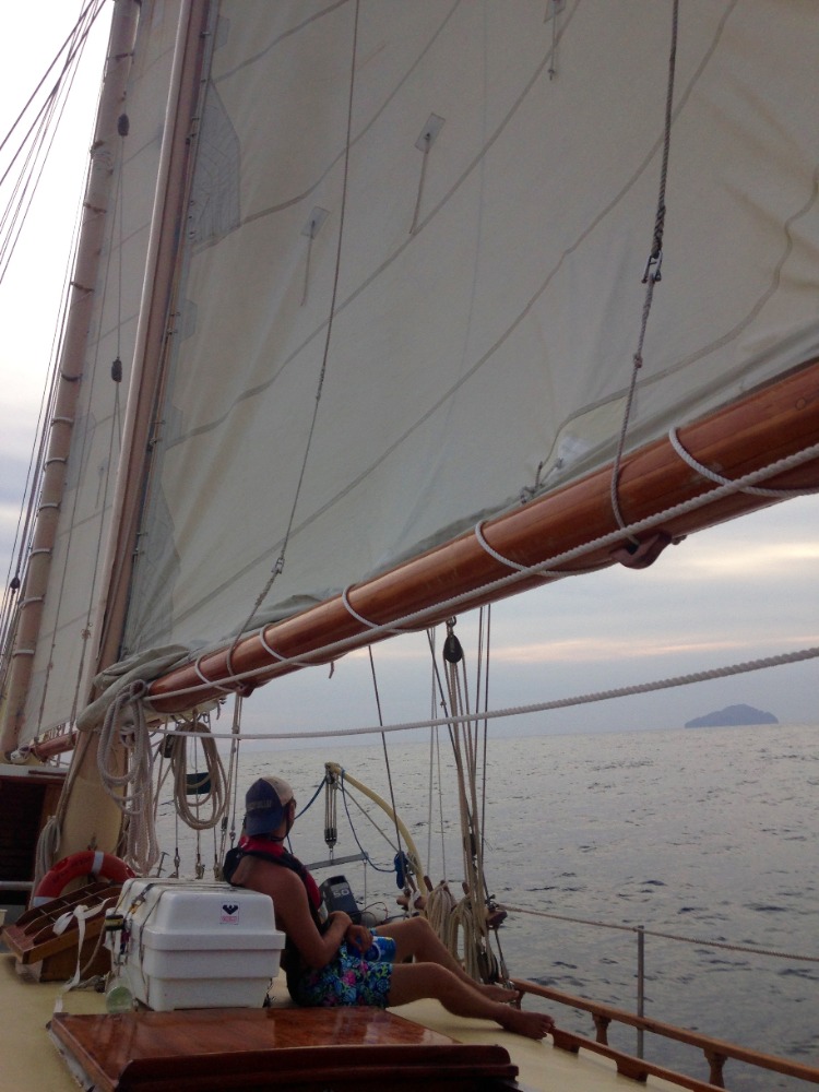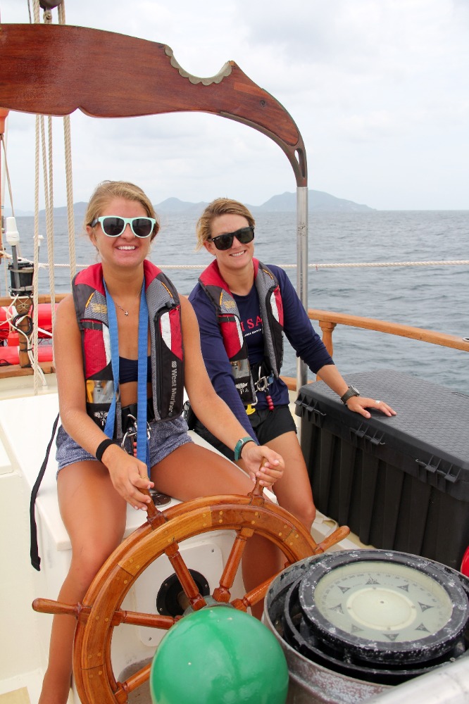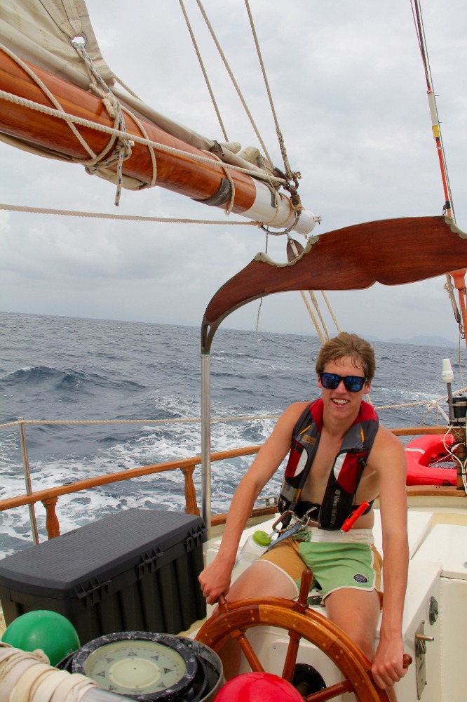 Another day, sailing to another new country – just another day in life. This morning, we awoke anchored off of Nevis. It was a bit overcast and windy, but it just highlighted the fact that up until now, we have had gorgeous weather – pretty impressive for two straight weeks. After breakfast, we all got together for our first SLD (Student Leadership Development) class of the semester and talked about some of our goals for ourselves for the trip. We then got into passage prep to get ready for our day sail to Montserrat. We are all really starting to get the hang of things on board, and passage prep is going much more quickly than it did even a week ago. When we finally picked up the anchor with Caroline at the helm, we turned into the wind and quickly raised the mainsail, foresail, staysail, and a new one for the semester – the jib. We then broke up into our watch teams, as each group took the deck for 3 hours to the helm, trim sails, complete boat checks, and, in general, get our group where we needed to go. Watch team 3(my watch) did an awesome job, with Cathleen, Joaquin, and Yi, each taking the helm for an hour, steering us at a close haul towards our destination. Due to the wind, we had some more waves than our last trip, as well as a heel to the leeward side. It took a little while, but eventually, everyone figured out how to walk with a slight lean so that you actually are standing up straight, even if the boat isn’t. Nick also had two fishing lines out for most of the passage and caught several fish, although, unfortunately, none of them were deemed appropriate for dinner. Just after dinner, we arrived at our destination, the island of Montserrat. We had already learned a little bit about Montserrat in oceanography classes when we were talking about tectonic plates and the volcanic formation of the islands that we are visiting on this trip, and we are all excited for a tour of the island tomorrow and to learn more about the island’s explosive history.