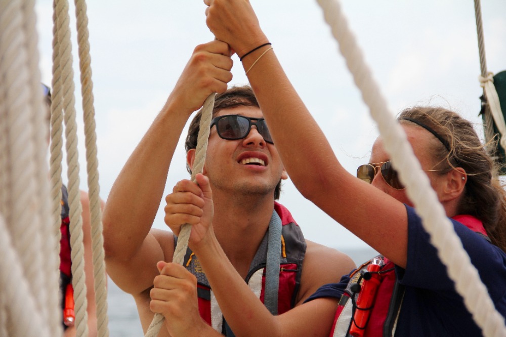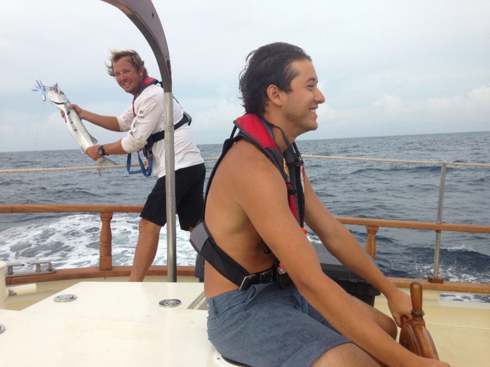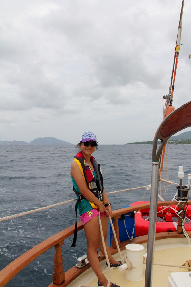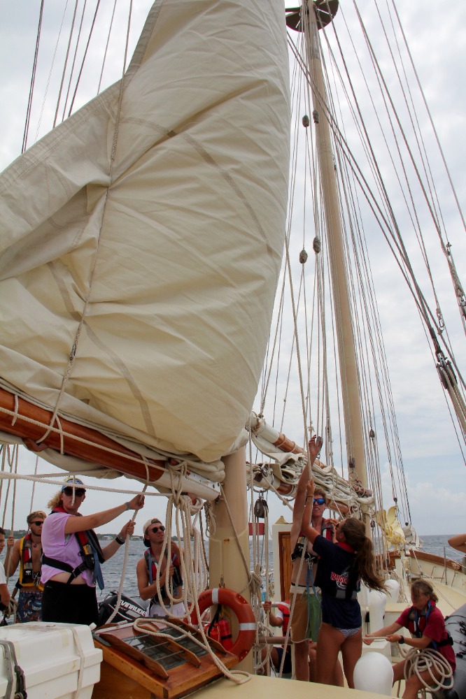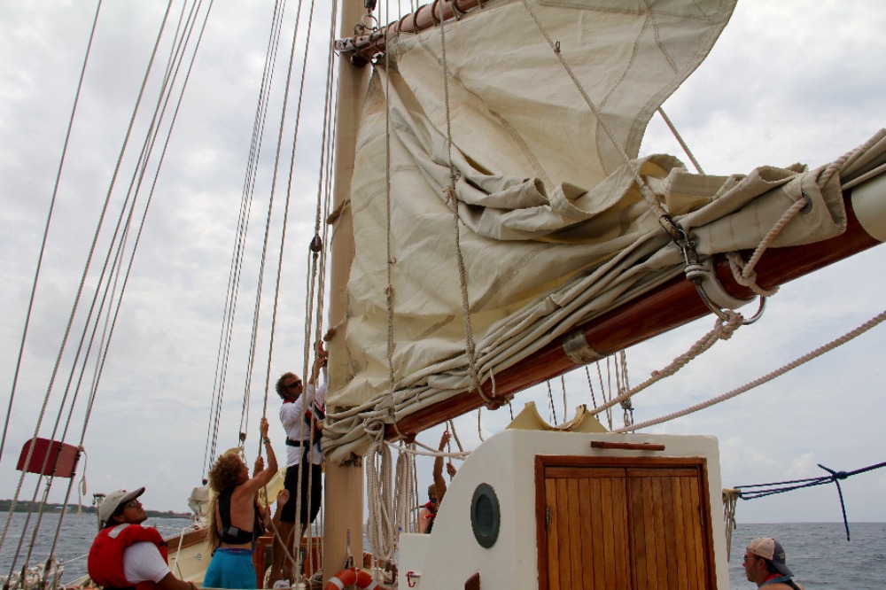 Another day, sailing to another new country – just another day in life. This morning, we awoke anchored off of Nevis. It was a bit overcast and windy, but it just highlighted the fact that up until now, we have had gorgeous weather – pretty impressive for two straight weeks. After breakfast, we all got together for our first SLD (Student Leadership Development) class of the semester and talked about some of our goals for ourselves for the trip. We then got into passage prep to get ready for our day sail to Montserrat. We are all really starting to get the hang of things on board, and passage prep is going much more quickly than it did even a week ago. When we finally picked up the anchor with Caroline at the helm, we turned into the wind and quickly raised the mainsail, foresail, staysail, and a new one for the semester – the jib. We then broke up into our watch teams, as each group took the deck for 3 hours to the helm, trim sails, complete boat checks, and, in general, get our group where we needed to go. Watch team 3(my watch) did an awesome job, with Cathleen, Joaquin, and Yi, each taking the helm for an hour, steering us at a close haul towards our destination. Due to the wind, we had some more waves than our last trip, as well as a heel to the leeward side. It took a little while, but eventually, everyone figured out how to walk with a slight lean so that you actually are standing up straight, even if the boat isn’t. Nick also had two fishing lines out for most of the passage and caught several fish, although, unfortunately, none of them were deemed appropriate for dinner. Just after dinner, we arrived at our destination, the island of Montserrat. We had already learned a little bit about Montserrat in oceanography classes when we were talking about tectonic plates and the volcanic formation of the islands that we are visiting on this trip, and we are all excited for a tour of the island tomorrow and to learn more about the island’s explosive history.