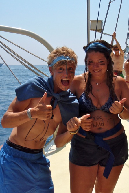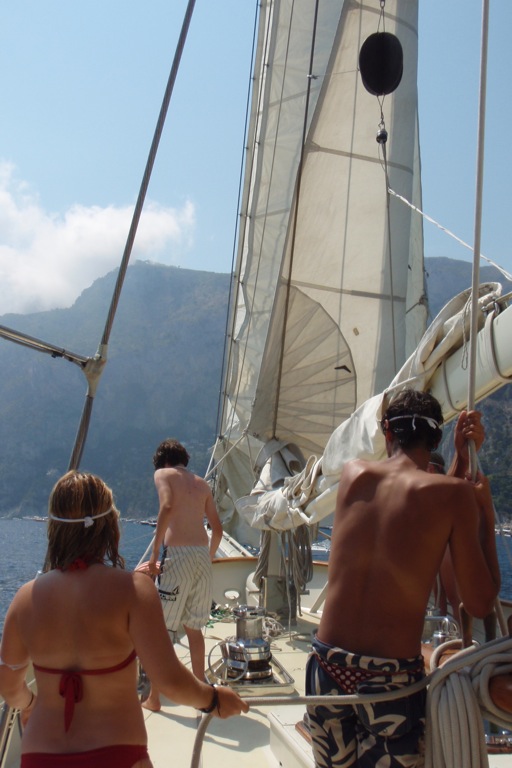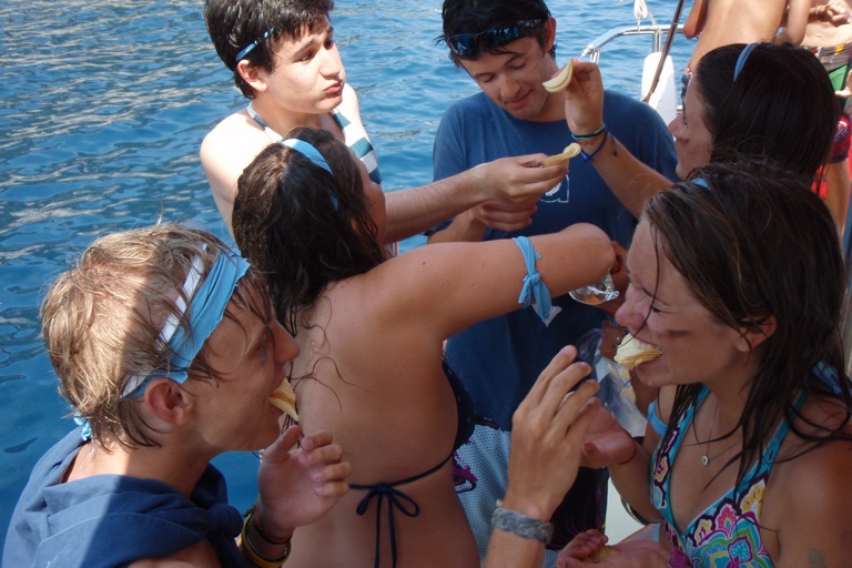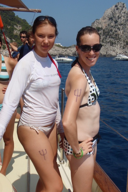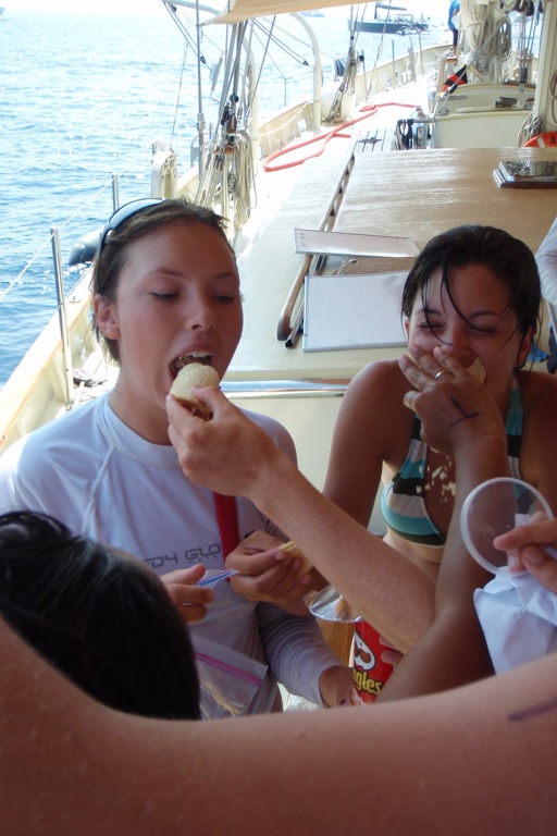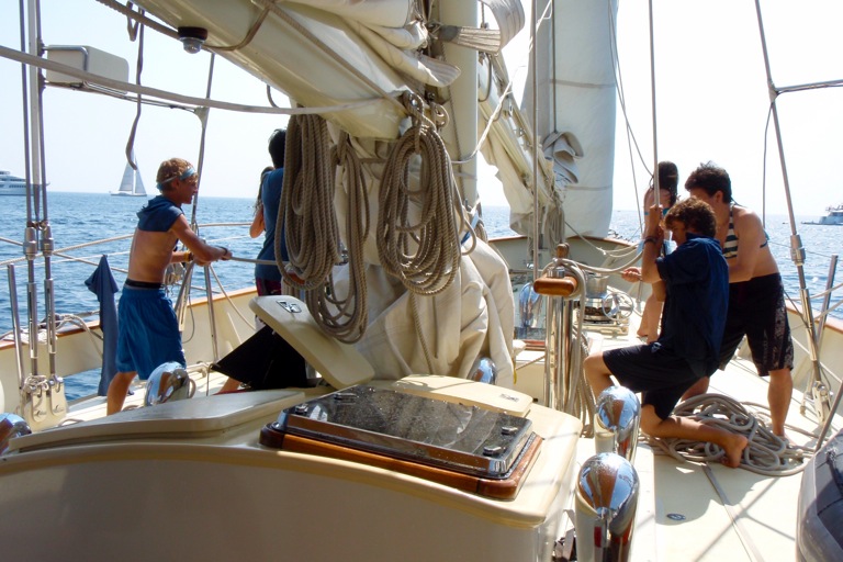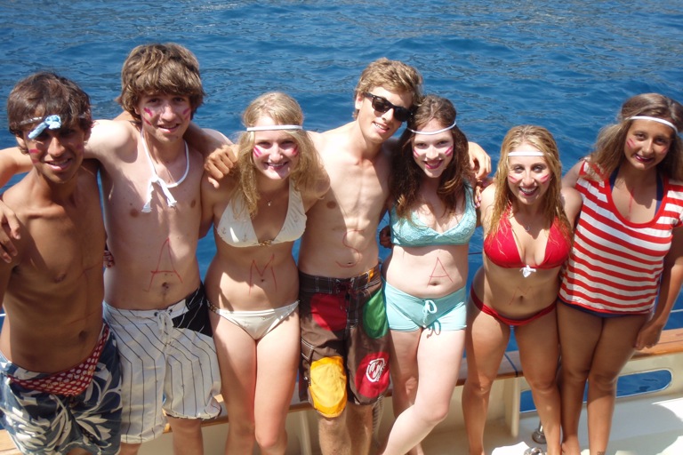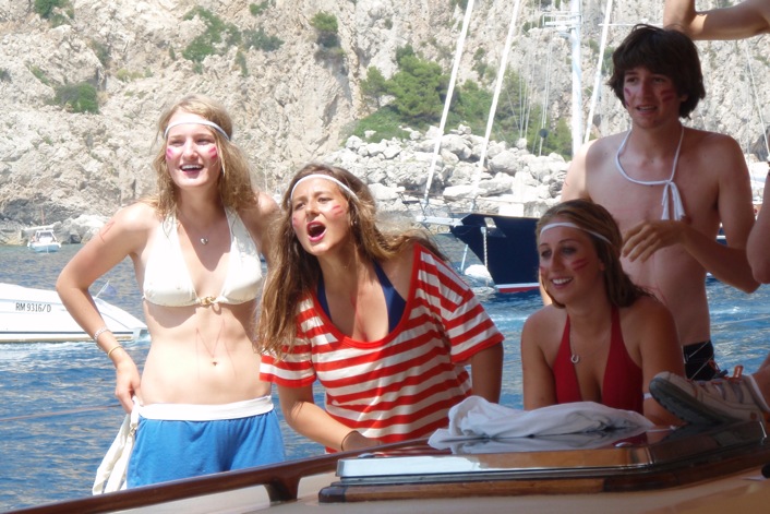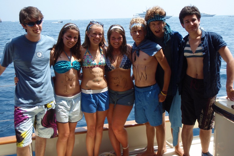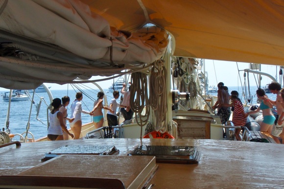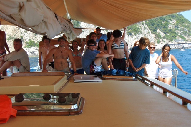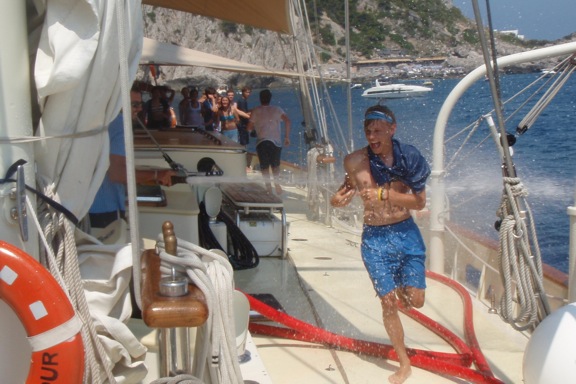 Today, the fourth day of the month of July, we, the crew of Argo, honored the struggles of our ancestors by participating in the Pan-Hellenic/Italian Olympics. Held on board in the crowded Capri anchorage. We enjoyed a brief shore leave in Capri before returning in the afternoon for the festivities. Our three watch teams competed against each other in activities varying from scavenger hunts to timed sail-raising. By the end, everyone was thoroughly soaked, and the deck was littered with debris. Although not everyone was a winner, every team had at least one gold medal in a specific event. A spectacular Fourth of July, and we are all looking forward to visiting the fabled Blue Grotto in the morning. On a side note, being in Capri has enabled us to witness some of the most impressive yachts in the world. Here is a list of just a few of the yachts anchored nearby. Be sure to check them out online: Siran, Mirabella V, Katya, Selene, Pestifer, Limitless, Yeratel G, Azucar, Utopia, Sai Ram, Pegasus II, and Silver Angel.