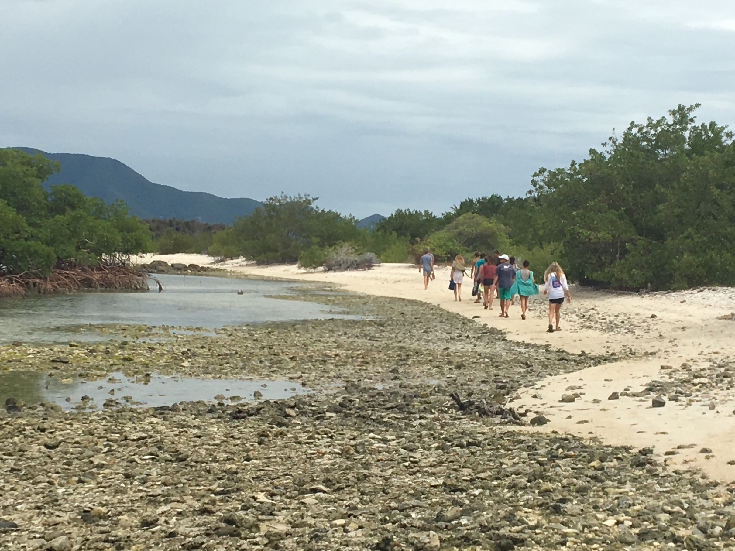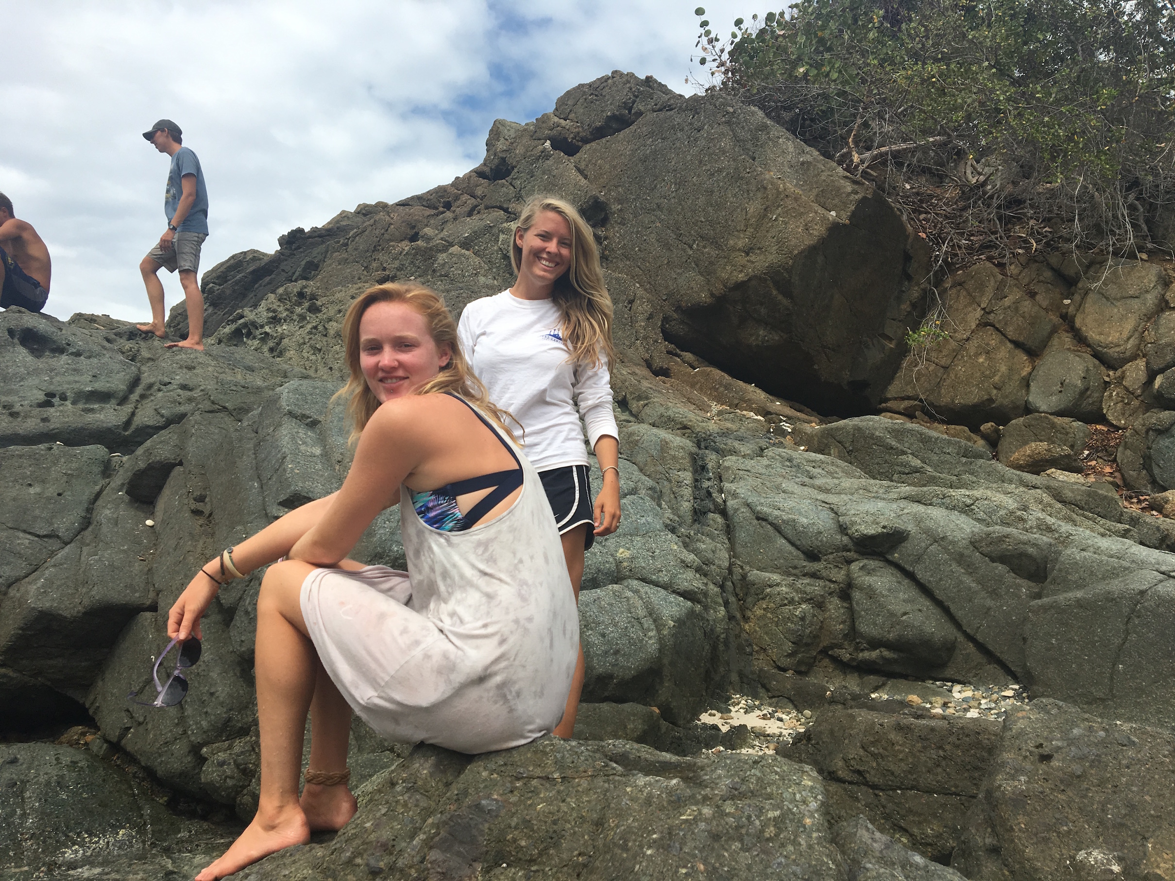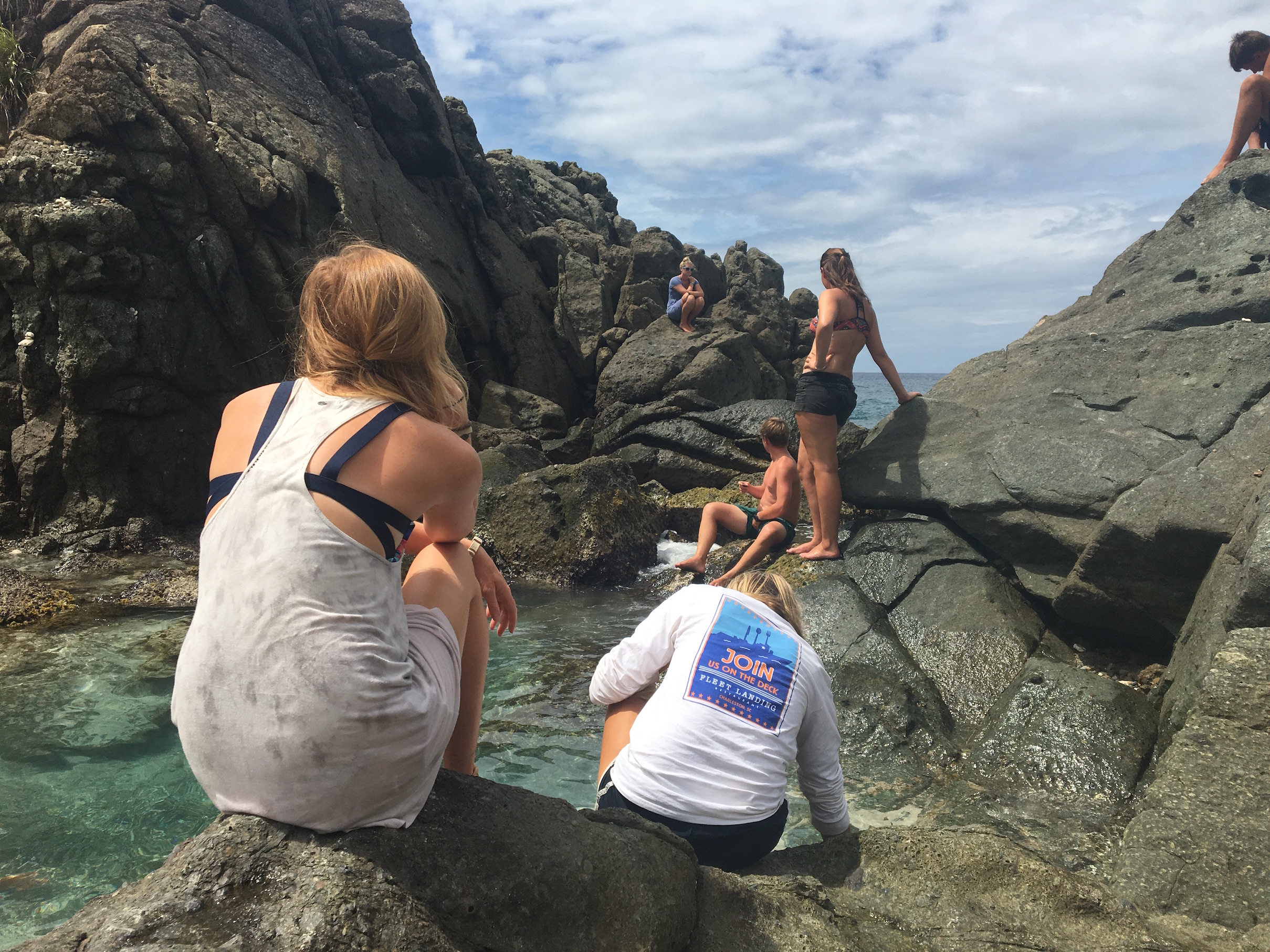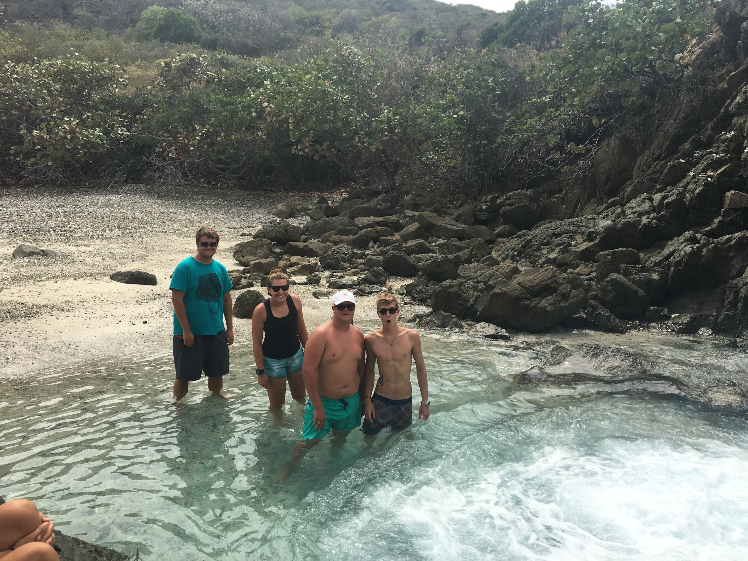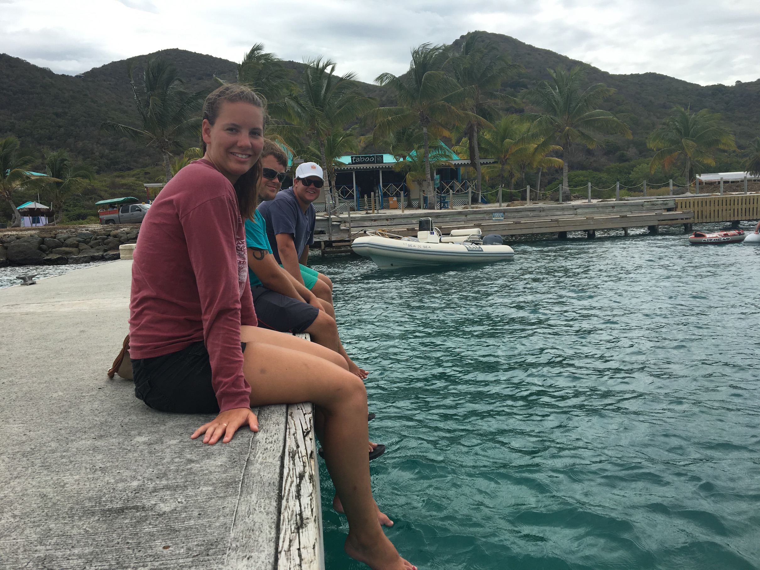 It still doesn’t feel real that this trip is coming to a close. In the recent few days, there have been many new and exciting experiences, but little things like posting cleaning checklists and confirming flights bring us back to the reality that our time here is dwindling. Therefore, we are making the most of every minute. Today started off at 7 am with breakfast bagel sandwiches. Though the weather today looked dreary, some of the crew went to Sandy Spit beach, where we played Frisbee, built sandcastles, and dove into the waves (some more successfully than others). Lunch was onshore at Foxy’s Taboo, a cute beach vibe restaurant and gift shop that stood feet from the water. It stands alone on a mostly deserted stretch of coast, within walking distance of a spot known as the bubbly pools. These pools were granted the bubbly mantle because of the waves that squeeze between rocks into a shallow salt pond, creating the illusion of hot tub jets in the fizzing water. Some jumped in; others were pushed, but we all had a great time. After cooling off, the crew hiked back to the dock, where the dinghy began shuttling crewmembers back to Ocean Star. Once aboard, we picked up anchor and motored the short distance to West End. We dropped our hook at the back of the anchorage just beyond sight of the final docking spot. We are prepared to get up early and move to that final berth just a few hundred feet further into Soper’s Hole. Dinner was sausage and mashed potatoes with vegetables, and the squeeze question fit the growing nostalgic and reflective mood: “What will you miss about this crew, and what will you miss about this experience?” After dinner, we watched a video that Ian put together, all the photos and videos of our time here. It was nostalgic, hilarious, and fun all at once; these past 78 days have been a wonderful time, and reliving those moments through the footage was uplifting. We ate a tasty brownie dessert to celebrate a great semester so far, and now we are in for a long night of packing and writing before our final full day tomorrow.
