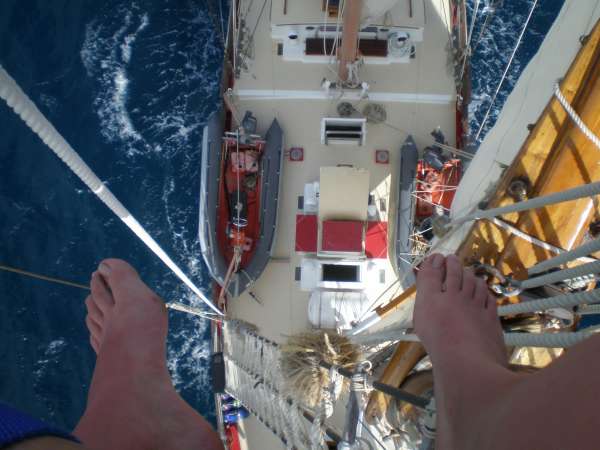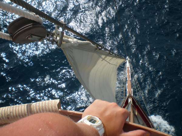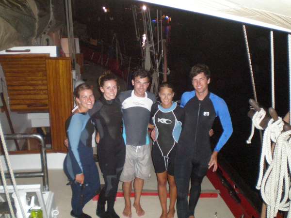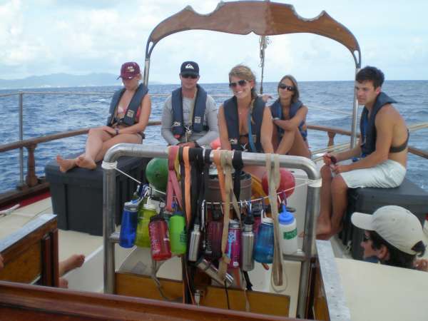 Today was another exciting day for the crew of Ocean Star. After a successful night dive last night, the crew slept long and hard and awoke anticipating our departure for St. Barths. This morning, the open water crew unraveled the mysteries of the PADI dive table and finished the last of their quizzes. We only have two more dives and a final exam before we will have some newly minted SCUBA divers! Throughout the rest of the morning, we prepared for our voyage to St. Barths, filling up on water, fuel, and last-minute items before we headed off just after lunch. The sail raise went smoothly, as the crew started to remember what each of the lines did and the order in which we needed things to happen to make this 76-ton vessel move! We headed out of English Harbour on a nice broad reach for St. Barths and were able, for the first time this trip, to just turn off the motor and just let the wind carry us. We’re currently making 8 knots toward St. Barth’s and sailing smoothly. Our chefs, Hillary and Jon, cooked up a delicious batch of chili for dinner, and the crew was looking forward to night passage under sail with bellies full and spirits high. The skies are clear, and the stars are just starting to appear in the sky- it doesn’t get much better than this!