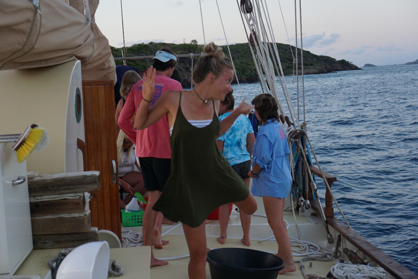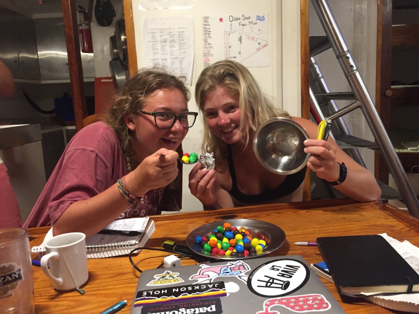 After dinner, we changed our sheets, then took our first quiz. It is good to finally know what to expect in future quizzes and tests. We then had oceanography class and a lab that contained M&M’s, skittles, and gummies to portray calcareous and siliceous ooze and a few other sediments. Best ocean floor I’ve ever tasted! We just watched a school of needlefish swim by, and one jumped into Erving, one of our dinghies. Matty grabbed it and put it back in the water to save it. He then proceeded to try to catch more with a bucket. After an eventful day of studying and eating, we are all getting ready for bedtime and then night watch. Goodnight, followers.