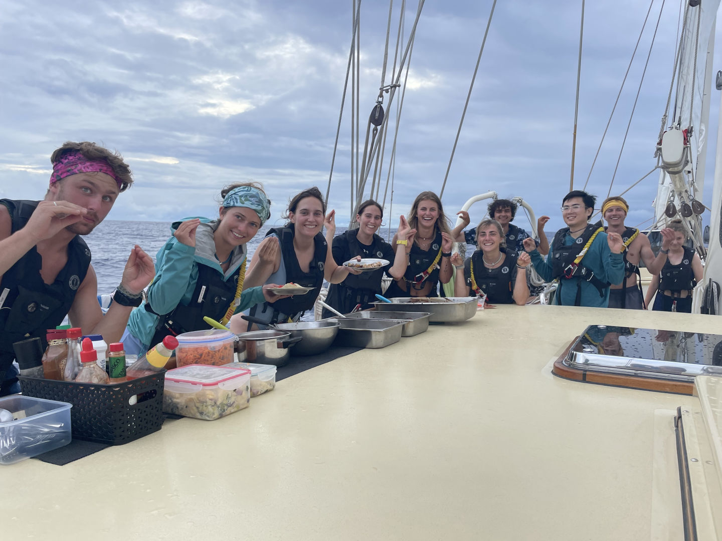 It has rained every night since leaving Fernando de Noronha, and our days have been spent trying to dry off between drizzly squalls. Every inch of the lifelines is consumed by wet laundry, hung up only to get rained on again. There is no wind to speak of, certainly not enough to get us where we’re going on time. In fact, we haven’t had enough wind to sail at all since leaving Saint Helena. This morning we put up five of our six sails: the main, the two staysails, the two jibs. No one is quite sure why we did this. It certainly wasn’t because there was the wind. It wasn’t for practice either, as if that had been the only goal, we would have taken them down again, given the lack of wind. The sails now hang off of their stays and spars, damp and lifeless, much like our laundry. Max decided to interview all of the staff with a single question: “Why are we fake sailing?” Here are our answers: