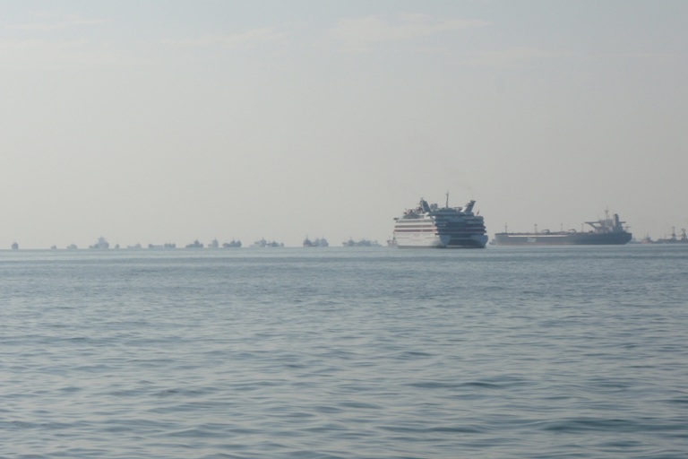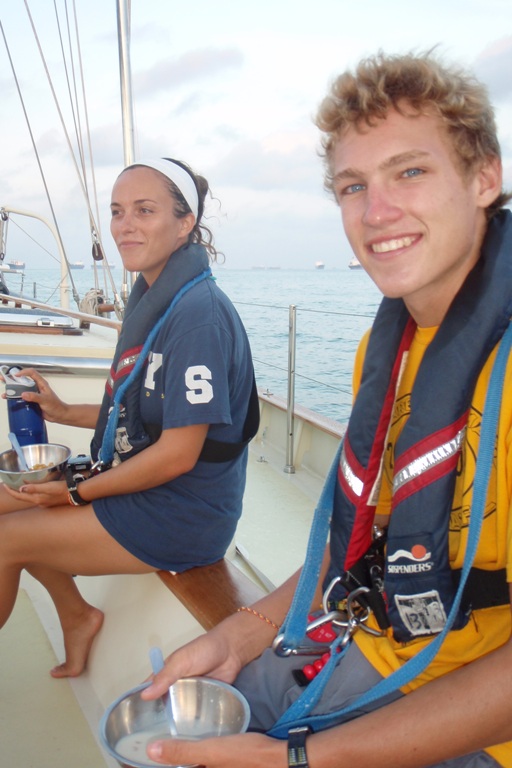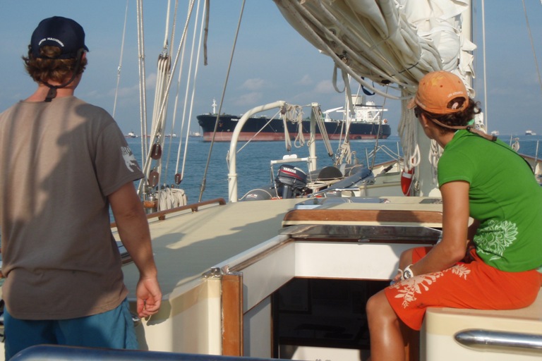 We’ve finally reached our final destination, though our journey isn’t quite over. The day started out with calm, open seas, and by 7 am, we were approaching the busiest port in the world and were surrounded by tankers. Looking back over Argo’s stern as we approached Singapore, it looked like we were staring out onto a busy city totally comprised of ships. After clearing customs and immigration, it was time to dock. Fenders tied on, and the line ready to be thrown. We battled a rather strong current to enter the marina. With Sam in the dinghy leading us in, we entered the marina. Turning the boat around 180 degrees, we proceeded to dock stern-to. With Dan’s smooth docking and piloting skills, we were quickly throwing our lines on the dock and making them off. After a quite delicious lunch of mini pizzas, we had an OCE quiz and then set about BA. It’s been commented that each time we do BA, it goes by even more quickly than the last. Before dinner, we had an opportunity to explore this very classy marina and take showers ashore. After dinner, it was time for our OCE final. Everyone is excited to be in Singapore, and we can’t wait to explore this city tomorrow!
