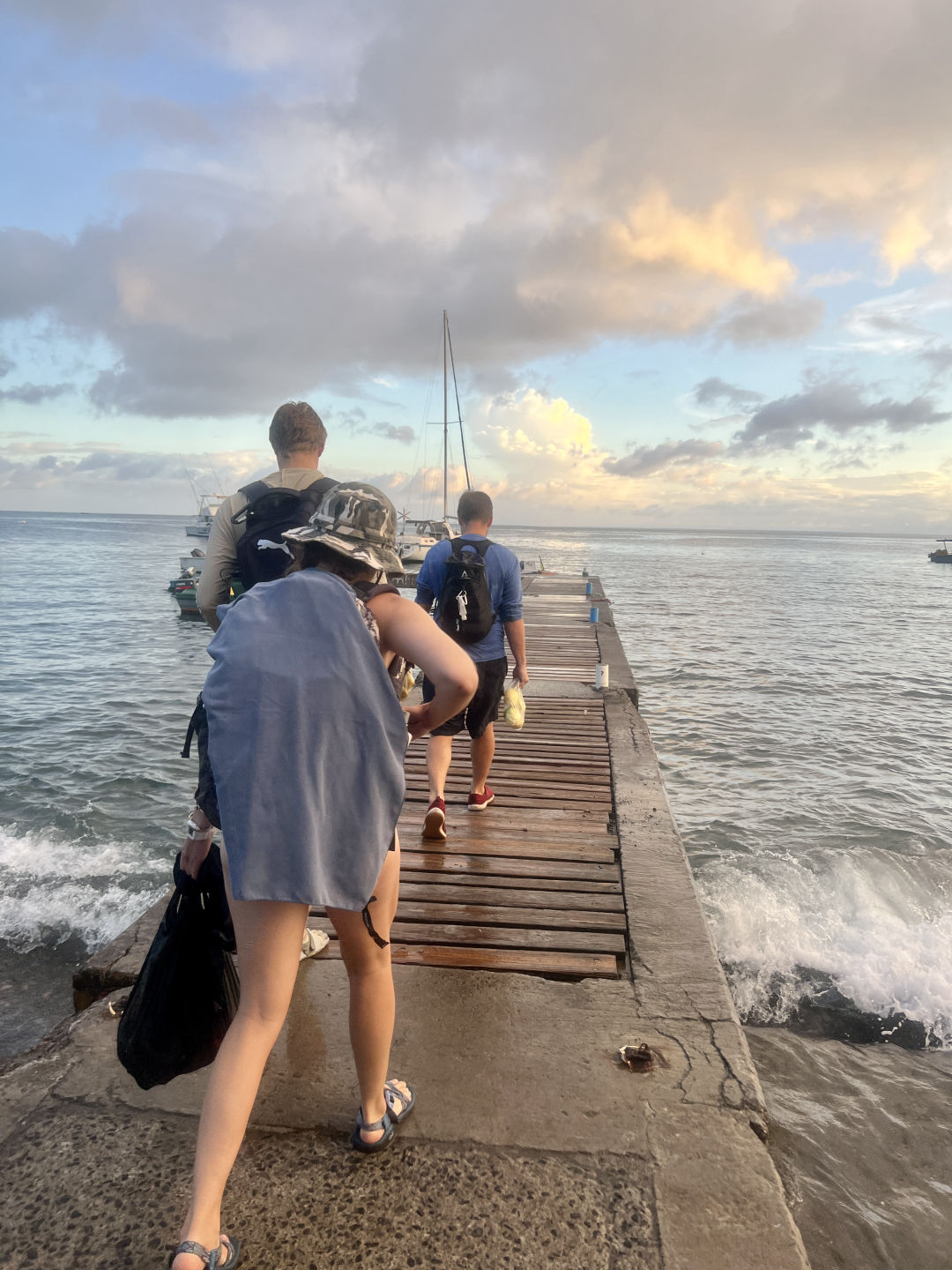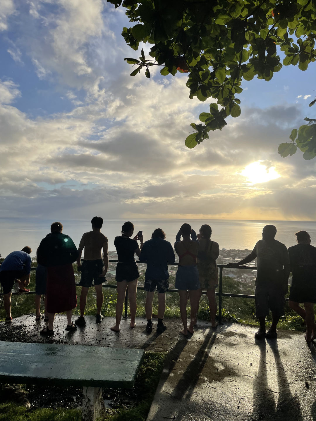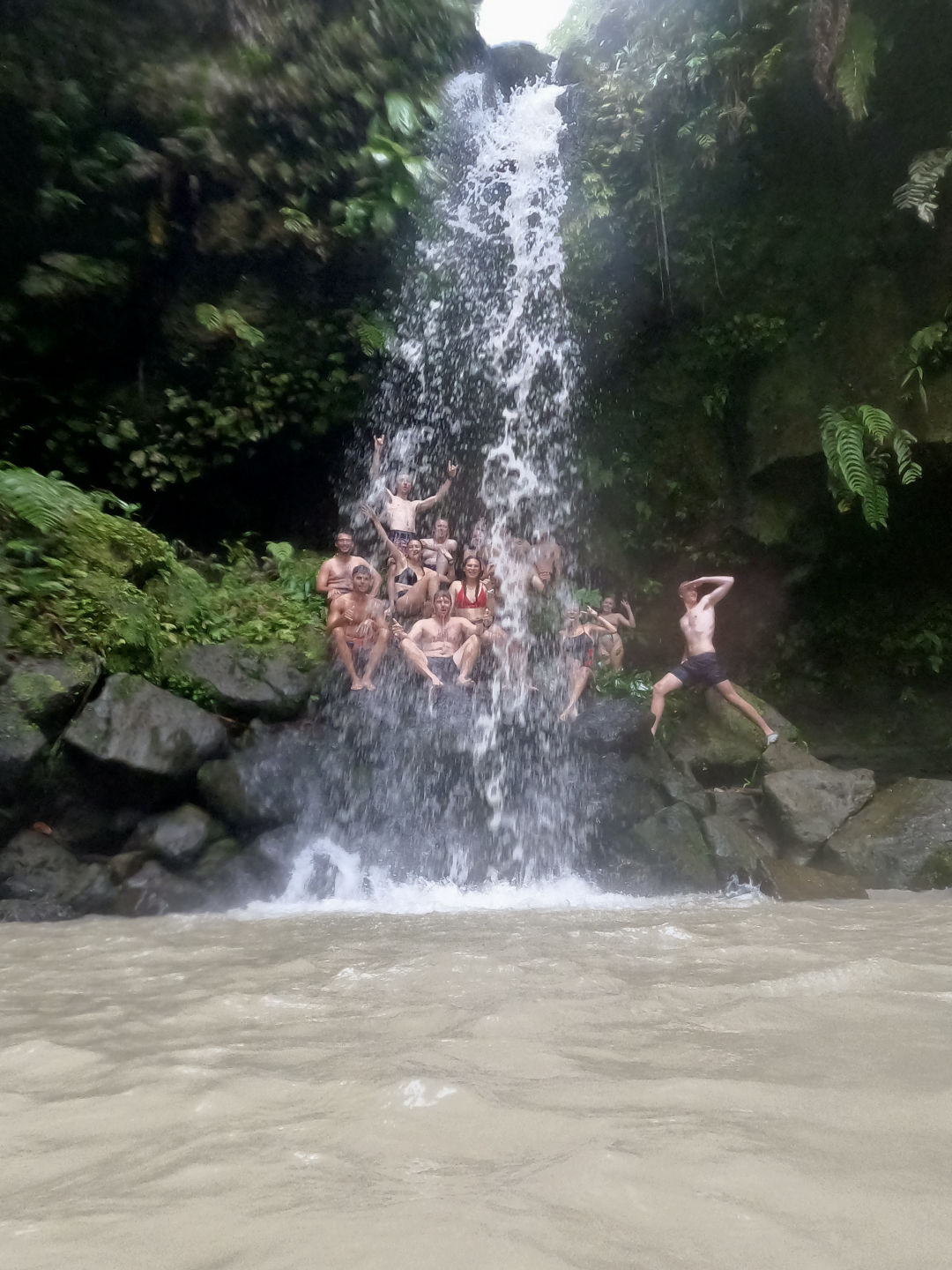 The bravest of us went for a little body surf session in the seaweed waves. Seaweeds were found in places we didn’t expect to, but fortunately, our next stop was the emerald pool, a UNESCO-protected site. This hidden wonder of Dominica gave rise to a lot of giggles, big splashes, and shivers from its cold water. Some of us had the idea to jump from a cliff behind the waterfall, and by the end, the more reluctant ones overcame their fear, and we all jumped from the cliff one after the other. And this was only the preview for our next stop; the Trafalgar falls. After having been badly advised to go barefoot, we went on a hike, which ended up climbing slippery rocks barefoot for most of us. We were thanked with good luck as many falls were avoided, and everybody got to the top safely. We all quickly jumped into the cold water at the bottom of the waterfall for one of the most memorable experiences of my life. Surrounded by a Jurassic World landscape, we got to be mermaids and mermen by sitting at the edge. When the shivers became unbearable, we went down to a hot waterfall that directly came from the boiling lake. A paintball game was started with the iron mud, and we painted our bodies like warriors. We didn’t see time go by, and it was already 5:00, so we needed to head back to the boat for dinner. On our way back, we made a quick stop to watch the sunset on top of the hill. Our day ended with an AMAZING chicken/tofu mango rice and some very awaited ocean showers. Now, we are going to do the knowledge review for the advanced open water course because we have two exciting dives tomorrow! Stay tuned for more adventures to come!
