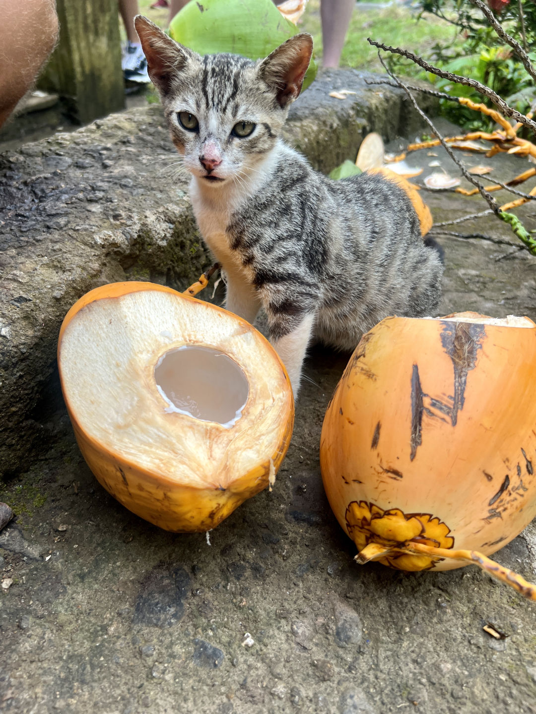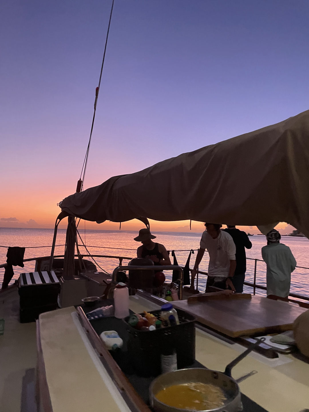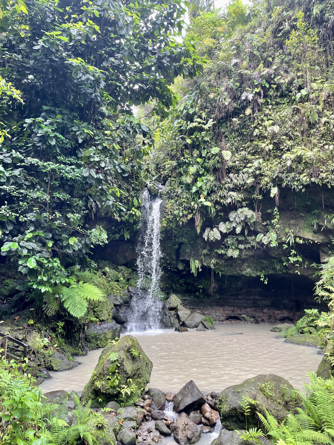 The bravest of us went for a little body surf session in the seaweed waves. Seaweeds were found in places we didn’t expect to, but fortunately, our next stop was the emerald pool, a UNESCO-protected site. This hidden wonder of Dominica gave rise to a lot of giggles, big splashes, and shivers from its cold water. Some of us had the idea to jump from a cliff behind the waterfall, and by the end, the more reluctant ones overcame their fear, and we all jumped from the cliff one after the other. And this was only the preview for our next stop; the Trafalgar falls. After having been badly advised to go barefoot, we went on a hike, which ended up climbing slippery rocks barefoot for most of us. We were thanked with good luck as many falls were avoided, and everybody got to the top safely. We all quickly jumped into the cold water at the bottom of the waterfall for one of the most memorable experiences of my life. Surrounded by a Jurassic World landscape, we got to be mermaids and mermen by sitting at the edge. When the shivers became unbearable, we went down to a hot waterfall that directly came from the boiling lake. A paintball game was started with the iron mud, and we painted our bodies like warriors. We didn’t see time go by, and it was already 5:00, so we needed to head back to the boat for dinner. On our way back, we made a quick stop to watch the sunset on top of the hill. Our day ended with an AMAZING chicken/tofu mango rice and some very awaited ocean showers. Now, we are going to do the knowledge review for the advanced open water course because we have two exciting dives tomorrow! Stay tuned for more adventures to come!
