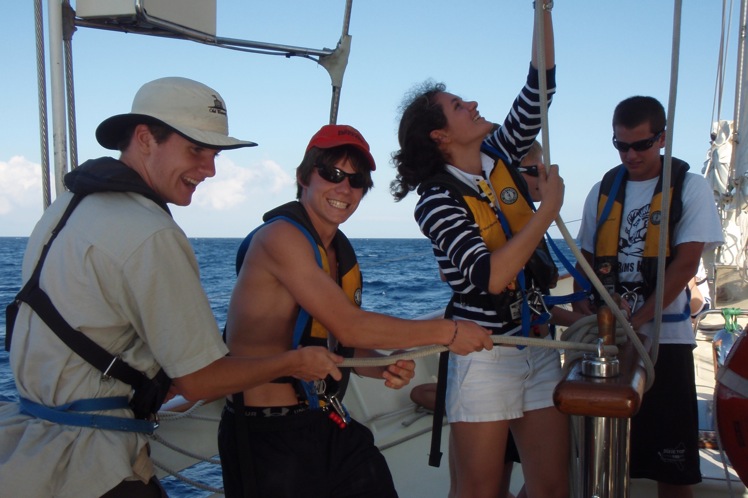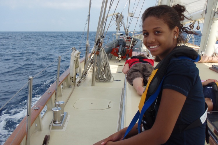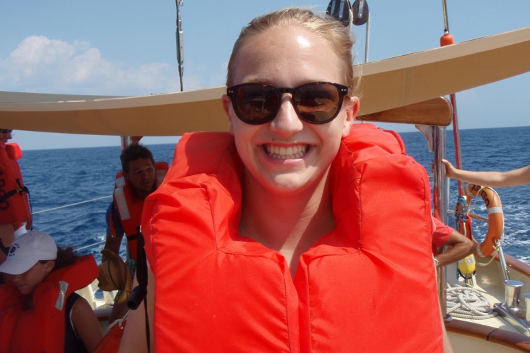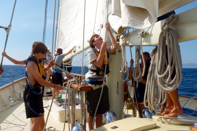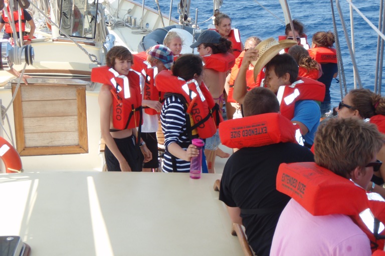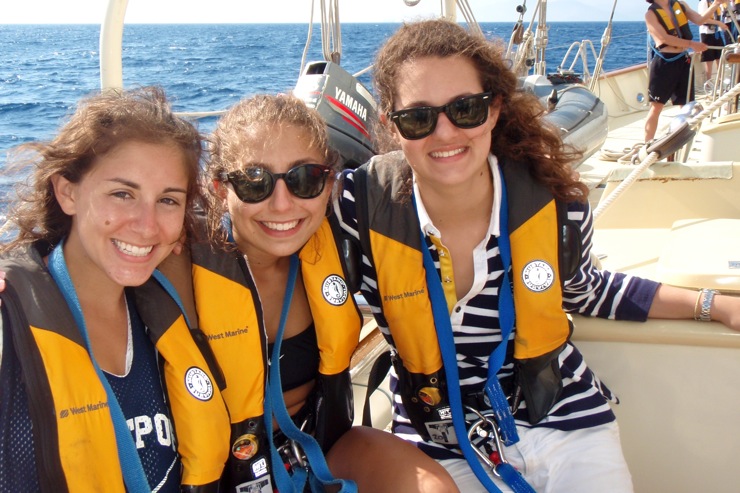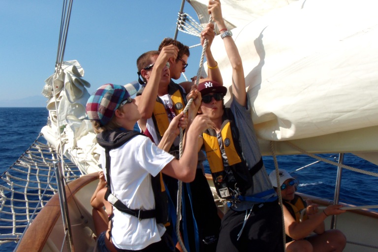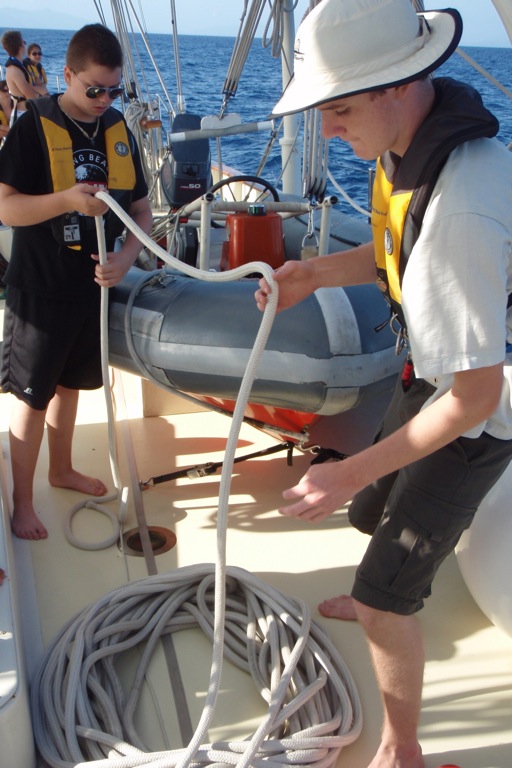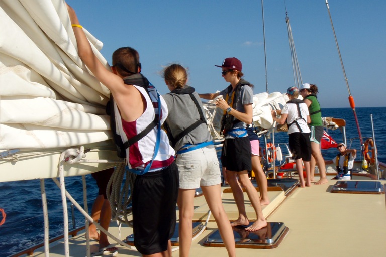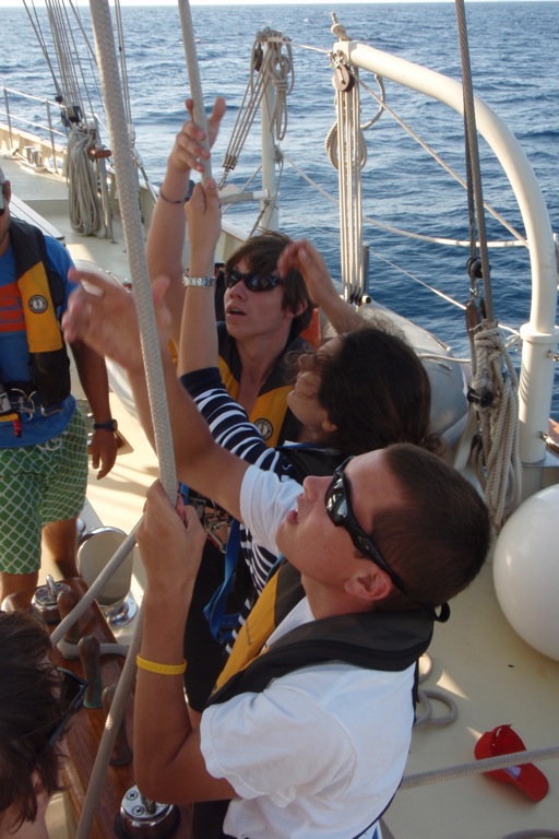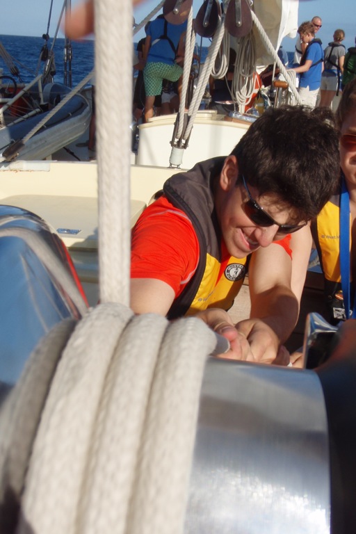 Watch Team 2 started in the morning. After that, Watch Team 2 helped the other watch teams by putting up the sails. We sailed to Portovenere and finally arrived around 6:35. Then we took a shower in the sea. We had a really good dinner. They served lasagna. The wind was a little help on the way there. The funniest part of the day was when we tried to flake the sail, but we were rocking a lot, so we kept falling down.