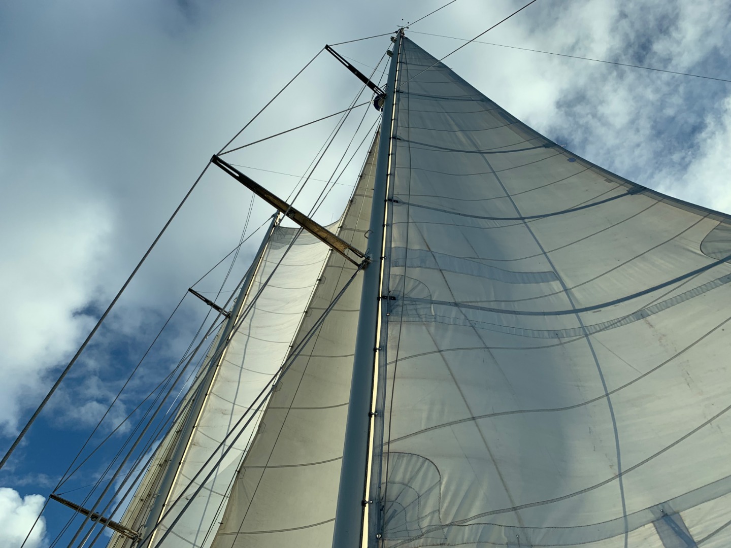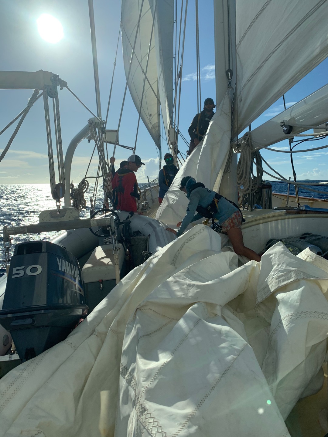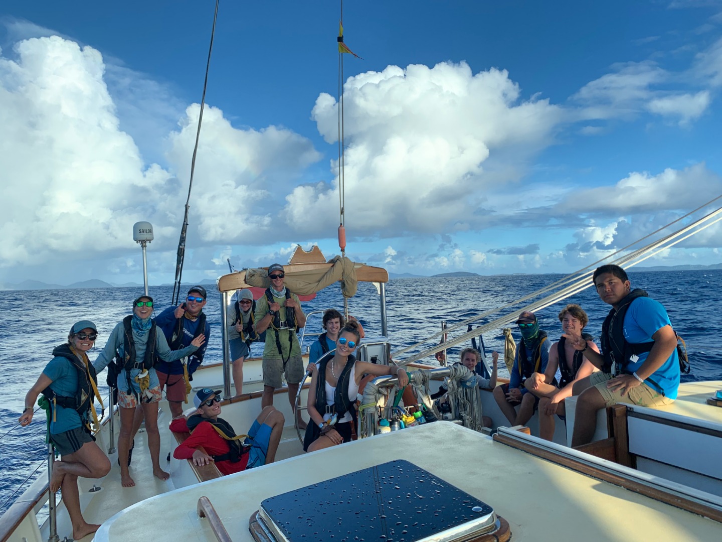 First, we raised the full power and might of the mainsail (which we have not done yet (we have only raised a reefed main)). Then we raised our main staysail, forward staysail, jib, got crazy with the flying jib, which we have only raised once, and then the cherry on top, the creme de la creme, the sun on a cold, windy day, we wait for it, raised the fisherman sail! For all of you out there thinking, whoa, big woooop. IT IS A BIG WOOP. I personally have not seen that much sail on Argo since I was a student back in 2013! 2013! Twenty thirteen…If you are wondering what it is and why it is so special, I’ll let you know. It is a sail not usually hoisted on Argo because of its precarious perch very high in the rig. It is a pretty large sail that fits way up next to the main staysail, which is why it is an inverted triangle. Try this, draw what you think is a sailboat. Go ahead and draw one. Now for fun, draw a boat with two masts, okay now add sails. The fun part is our sail in the middle goes up on a stay, instead of on a track up the mast, so there is a big gap, which can only be filled with….you guessed it, the fish! After our 10 knot sail, we motored into Maho Bay under a beautiful blanket of stars and a comet as we finished dinner and our evening squeeze. A great ending to a jam-packed day!