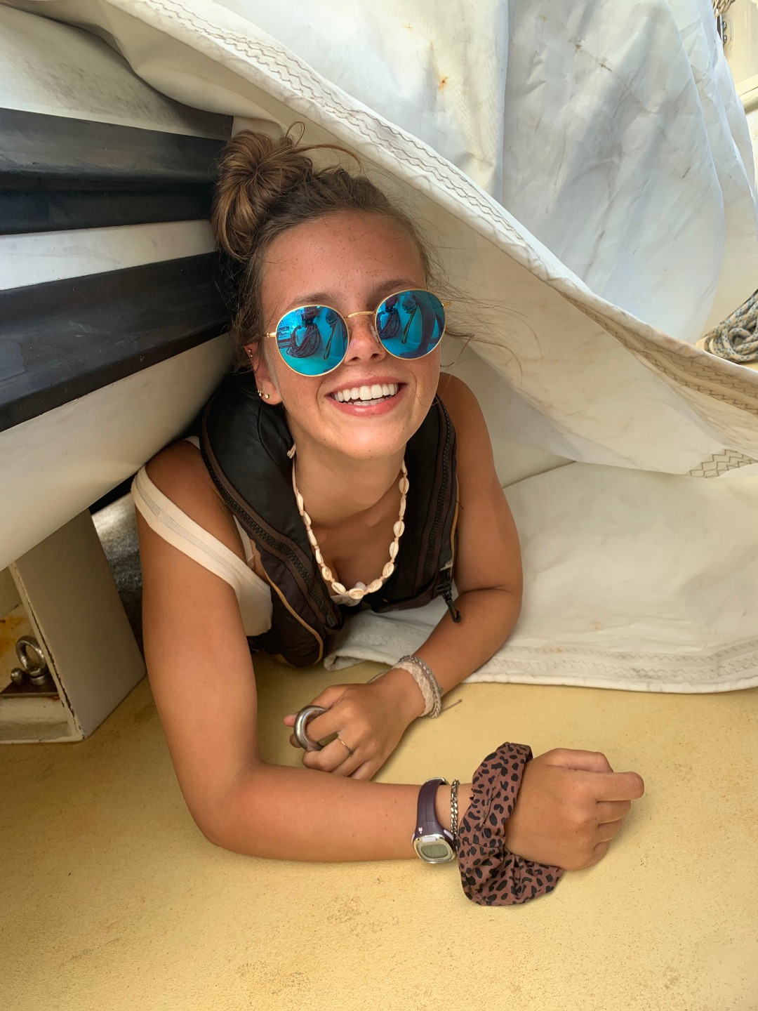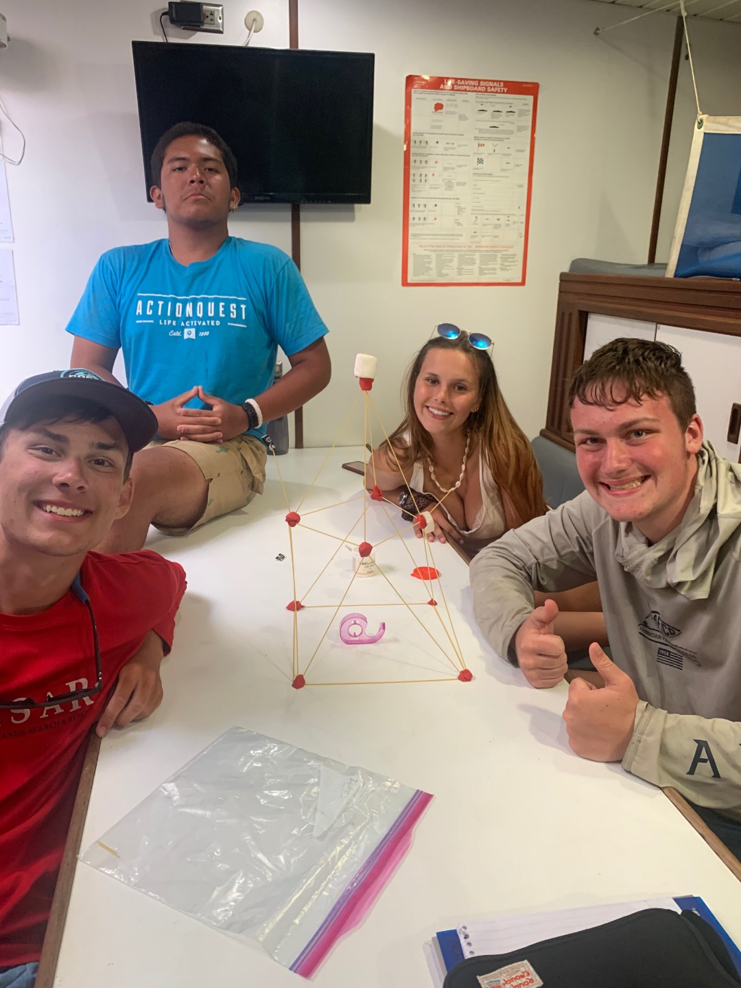 After the snorkel, we packed up Argo and set off for an adventurous afternoon sail. Our first attempt ended abruptly when we noticed a small rip in the mainsail. So we decided it was time for leadership with Jay and a fun activity where the students competed in a puzzle that consisted of building spaghetti towers that needed to hold up a marshmallow. After the sail was repaired, we decided to make our second attempt, which happened to be very successful.