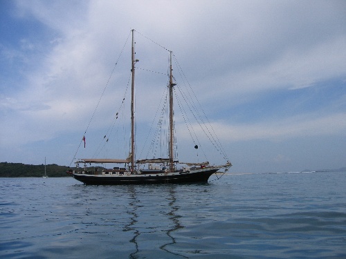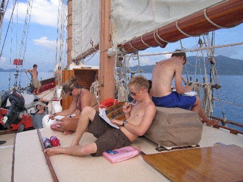 As we sailed away from GHP, it was disappointing to have such a lack of wind and so an inability to practice sailing, although we did have the sails up. Yet, as we approached Sandy Cay, our mood changed drastically. Admiring the small island, our crew and staff eagerly swam ashore with our bellies full and satisfied from our scrumptious lunch. Following extensive beach games and invigorating exploring, we came back to Ocean Star with time to spare and an opportunity to study. After dinner, the shipmates hunkered down, ready to hear about our watch teams and procedures for the passage to Nevis. To wrap up our day, we watched an inspirational video about Irving Johnson and fell asleep thinking of our adventures to come.
