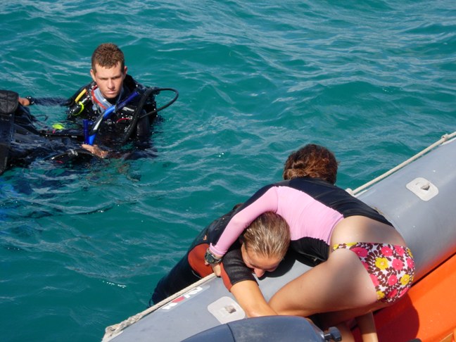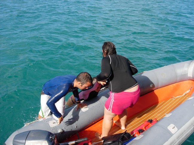 We started the day with poached eggs and sauce and then moved straight into Marine Biology class. People took advantage of the wind and the water and went windsurfing while others caught up on schoolwork. Another rescue diving session after lunch was followed by divers practicing search patterns on the sandy bottom. Kyle and Mandy prepared an excellent Mexican fiesta to end the day. It is extremely beautiful here, and the crew looks forward to one more day playing in paradise!