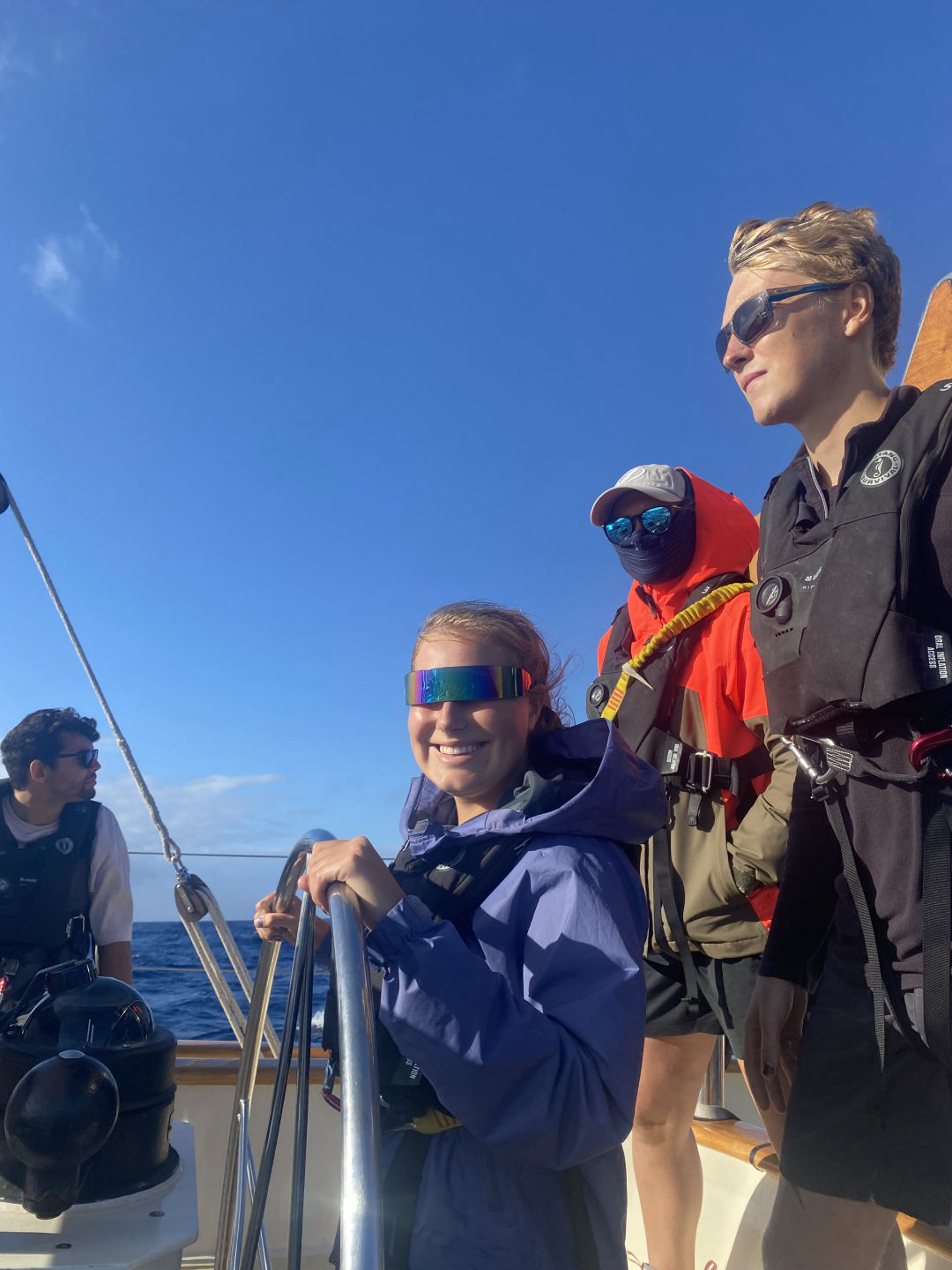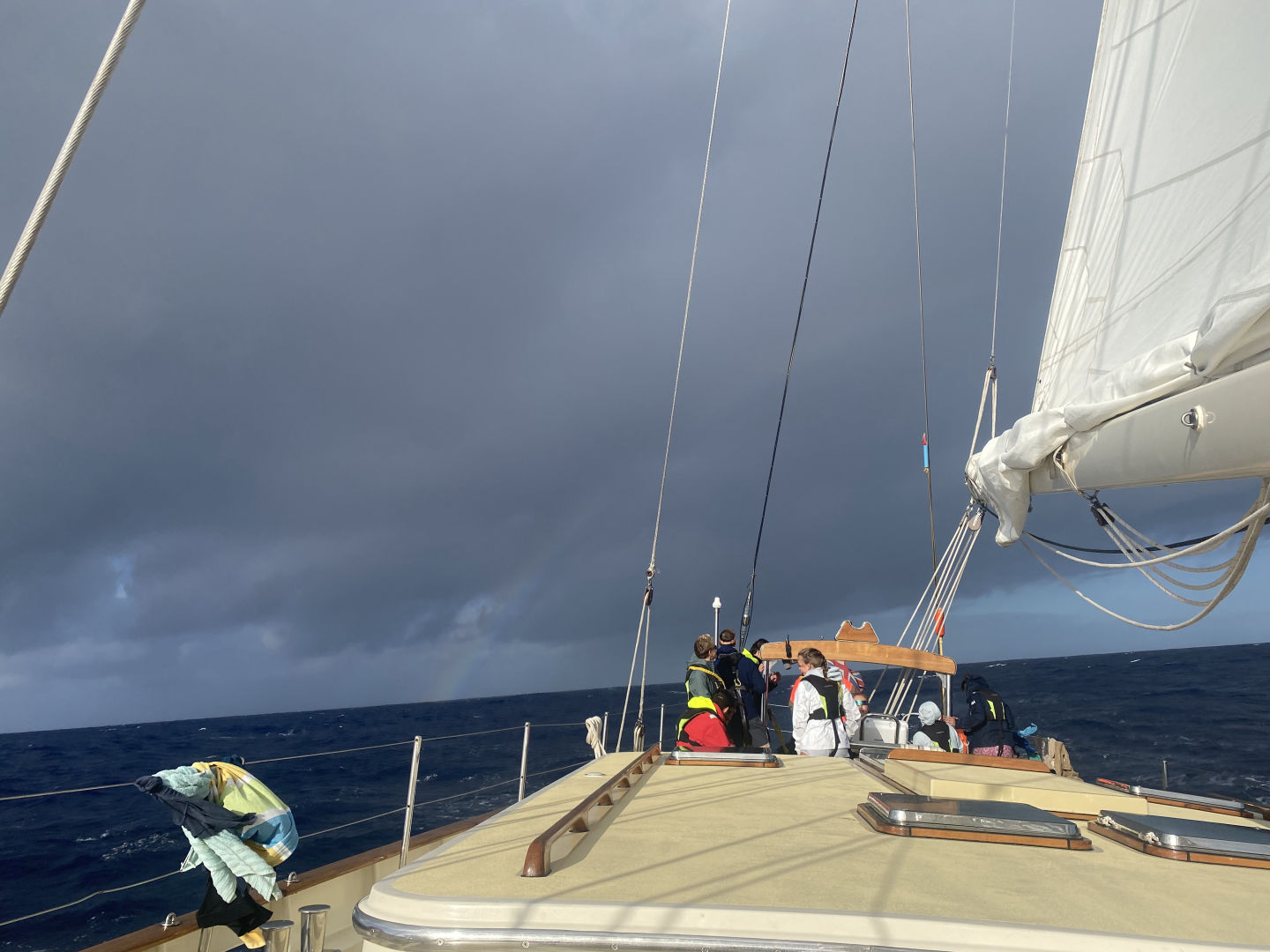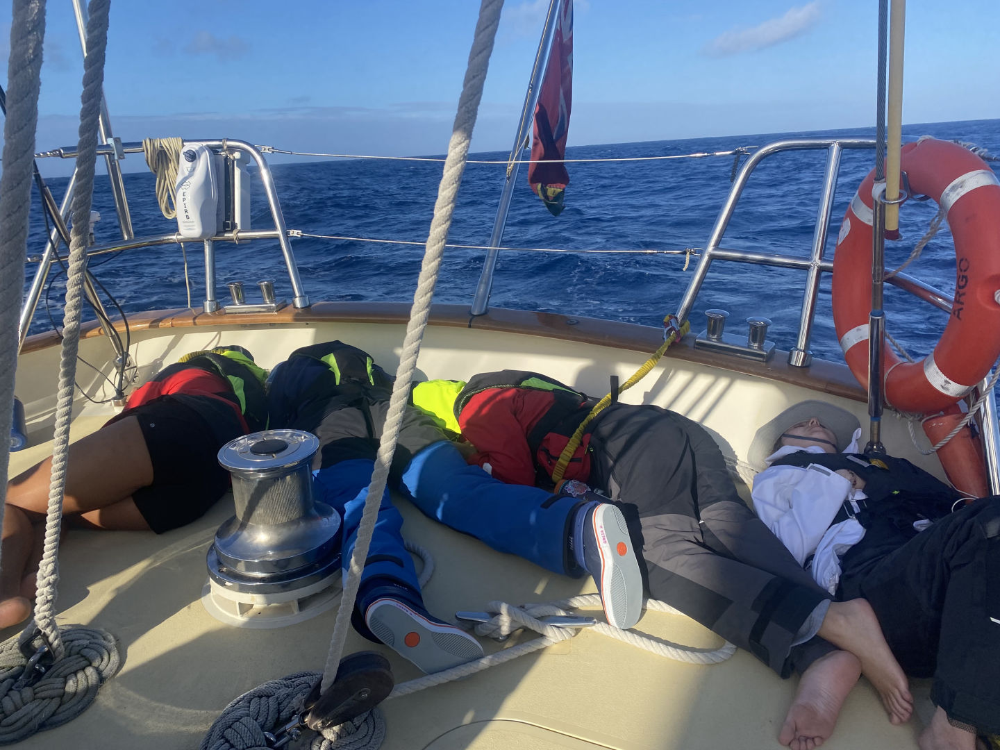 Today, I woke up when I caught air in my bunk (I live in the forward-most cabin, and we have been warned of this). Fifi and Hilary also woke up to this wave, and we watched as water flooded over our hatches and a bit dripped on us through the “water-tight” seal. “What the heck? Can they stop pouring water on our hatches?” Fifi exclaimed. “Who should I ask, like the ocean?” Hilary joked. Then Xavi came in to get us up on deck and informed us that these waves were only 2 meters. We will be getting hit by 6-meter swells later on in this passage. Roughly half of the crew, including me, spent most of the day on the low side and the stern, leaning over the rail occasionally and having our lovely shipmates fetch our waters and rice cakes. We bonded a lot today in the trenches, using each other as pillows and hyping each other up through our worst moments. We had a group of dolphin friends come and say hi before having dinner bouncing around in the cockpit. Another night of watches, and we are excited to feel better tomorrow, hopefully.