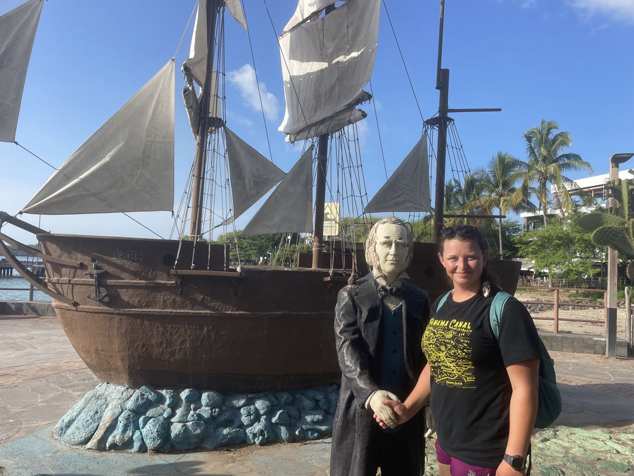 Early this morning at around 0400, watch team 2 anchored us at Santa Cruz. 4 of the 6 of us had to do an hour of anchor watch after getting in, which meant that I was awake from 0230 to 0400, then again from 0500 to 0600, then again from 0745 on. Interesting sleep schedules are part of the fun, though. Over the course of the next three days here in the Galapagos, all of us will have done a day of diving, a highlands tour, and a day completely full of free time. However, because we are a fairly large group, we are all doing different activities each day. Today, 8 of us went diving, 12 went on the highlands tour, and the other four had the day to do whatever. I was one of the ones with ample amounts of free time, and I spent the day walking around town, buying souvenirs, and enjoying cold drinks and a burger. In addition to generic souvenir shops, there are a lot of cool art galleries and crafts to see. There is also a lot of blue-footed booby merchandise. Some of us have bought blue-footed booby socks, others got shirts, and I myself have a sticker. While waiting for a water taxi to take us back to Vela, Elise and I saw black-tip reef sharks and golden rays. After getting back on our boat, we had some time to take ocean showers and air dry on the bowsprit and deck.