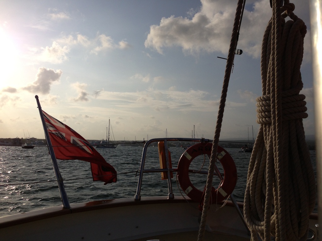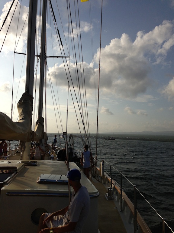 The newly initiated shellbacks were rotating through watch teams as the Galapagos became visible on the horizon. A new rush of excitement filled the crew with the wonder if there would be wildlife everywhere as we arrived. Over the past two days, there has been an abundance of dolphins, not just your normal dolphins taking a breath and going back down, but fully jumping up at least 10 feet out of the air; talk about amazing! As Argo cruised closer, we began a massive B.A. while underway. The deck was scrubbed and waxed, cabins cleaned, and fridges and every cabinet organized. She looks great right now, and a clean boat leads to a happy boat and a happy crew! We pulled into Santa Cruz with birds flying above and a full anchorage ahead. We dropped anchor and enjoyed a great dinner of Chicken Pot Pie. As we were beginning to clean up, we had a friendly little sea lion come over and poke his head in to say hello, which obviously melted everyone’s heart! Hopefully, there will be even more to come!
